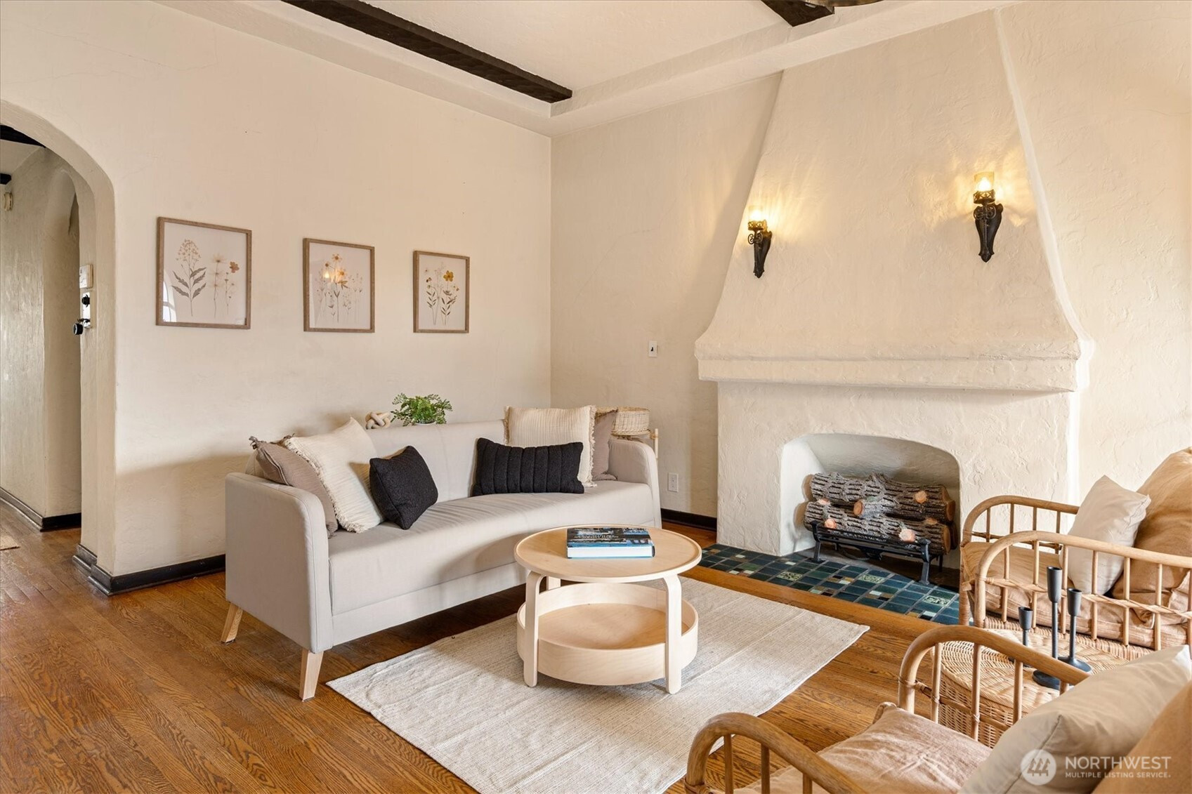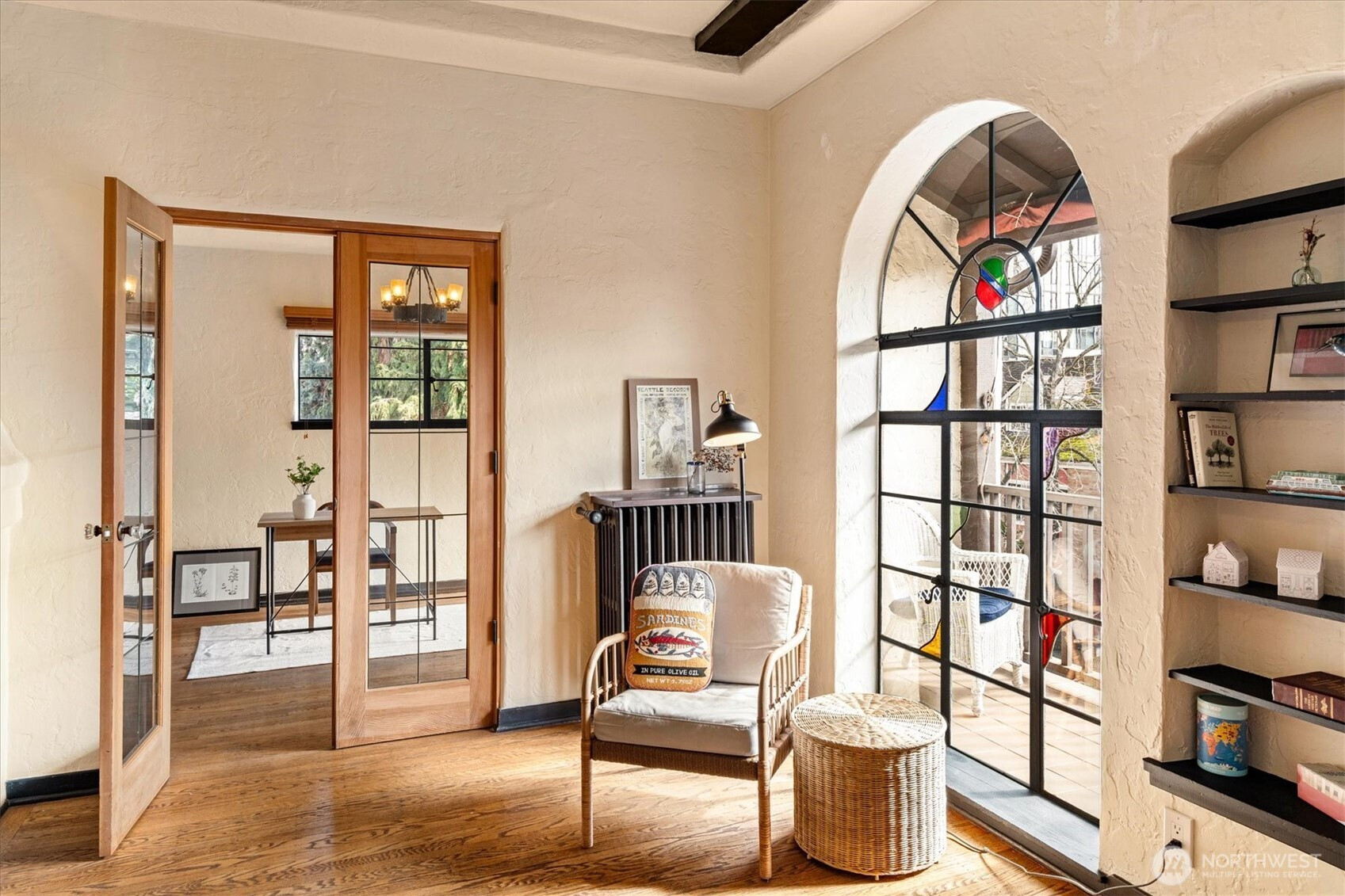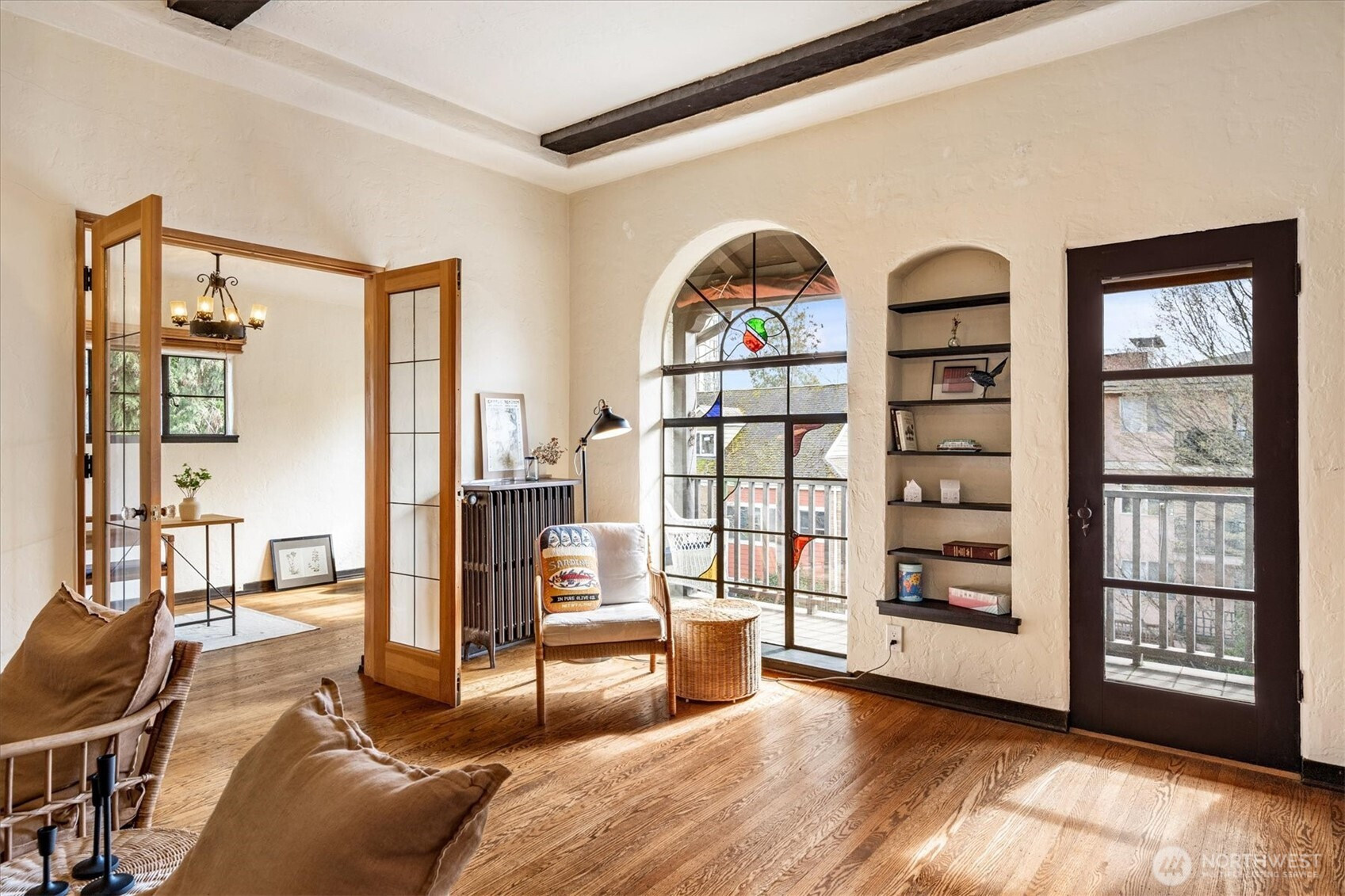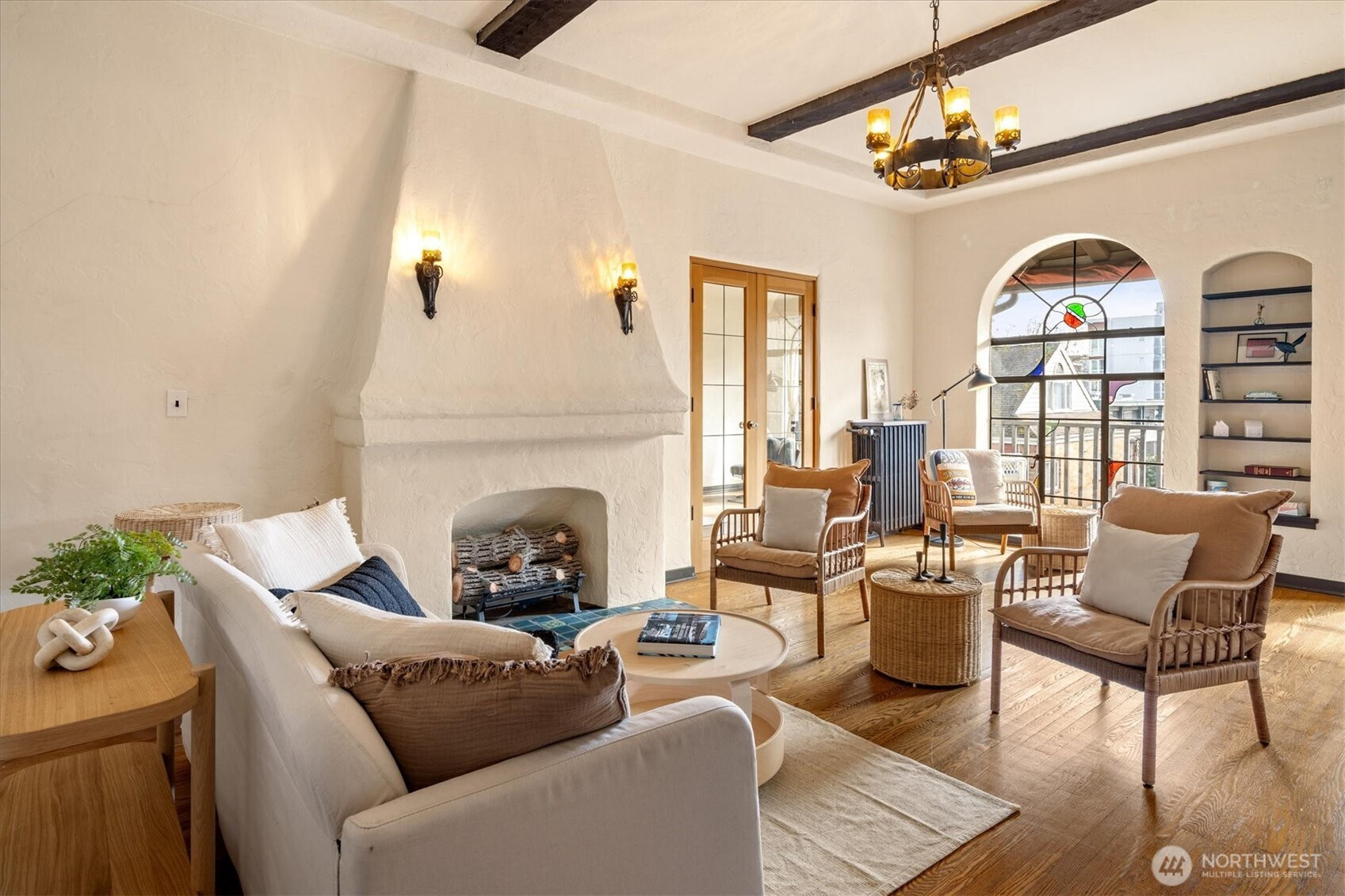 Timeless Spanish Colonial Revival architecture meets modern livability in this top-floor landmark residence. Coved ceilings, graceful archways, balconies, and garden surroundings showcase the craftsmanship of another era. This spacious two-bedroom home lives beautifully with a light-filled living room anchored by a striking fireplace. The updated kitchen blends seamlessly with the home’s historic character. A versatile front room easily functions as a study, dining room, or guest retreat, while the serene rear bedroom offers privacy near the bath. Rare top-floor, end unit provides abundant natural light and quiet. Long cherished by writers and artists—perhaps your next manuscript begins on the balcony. Includes rare small car garage.