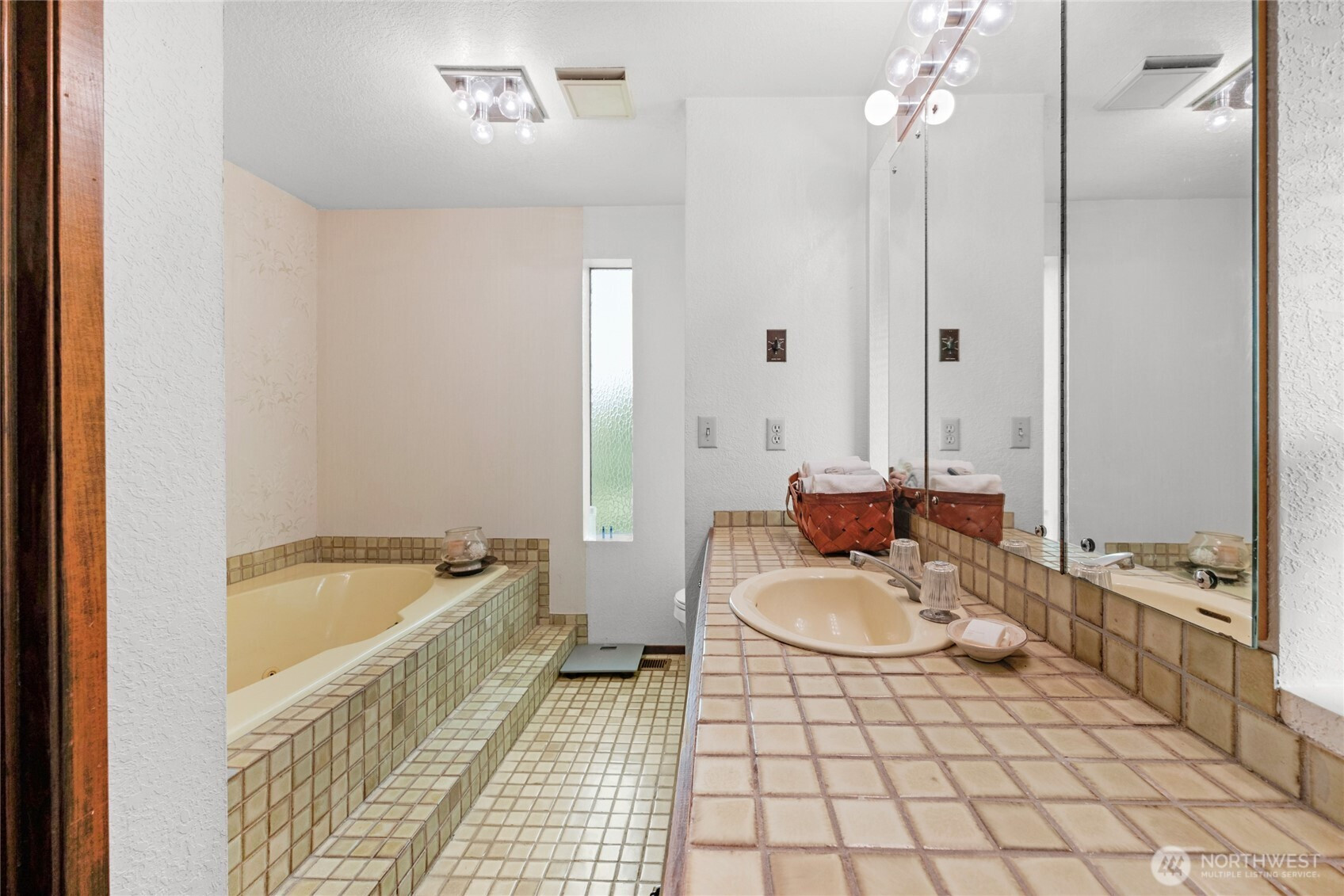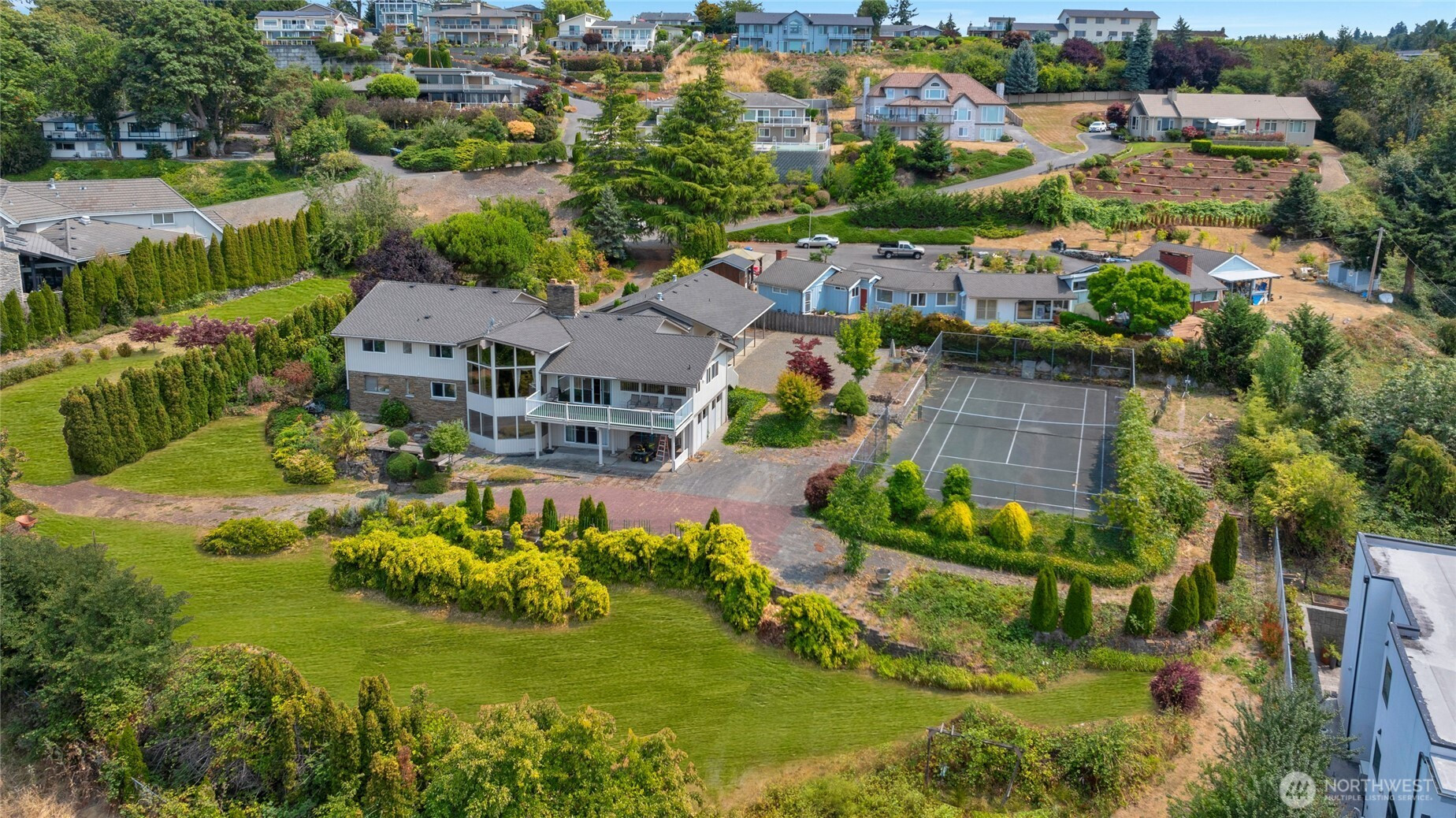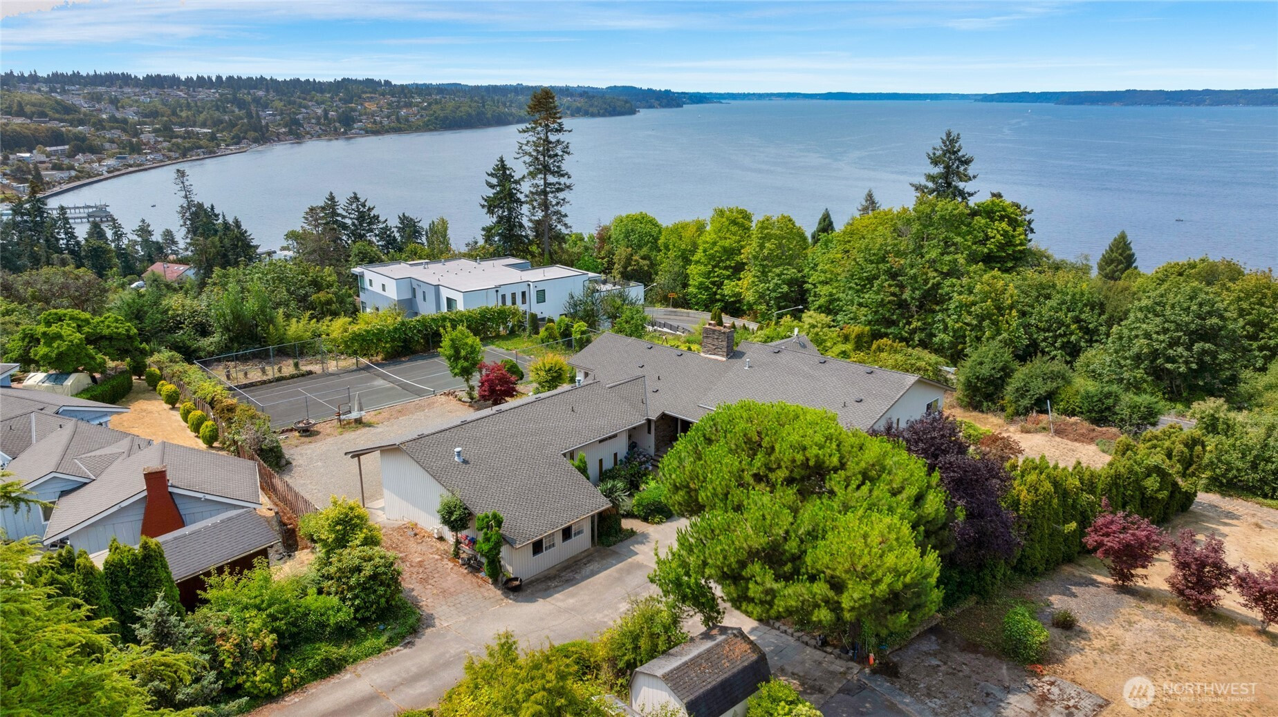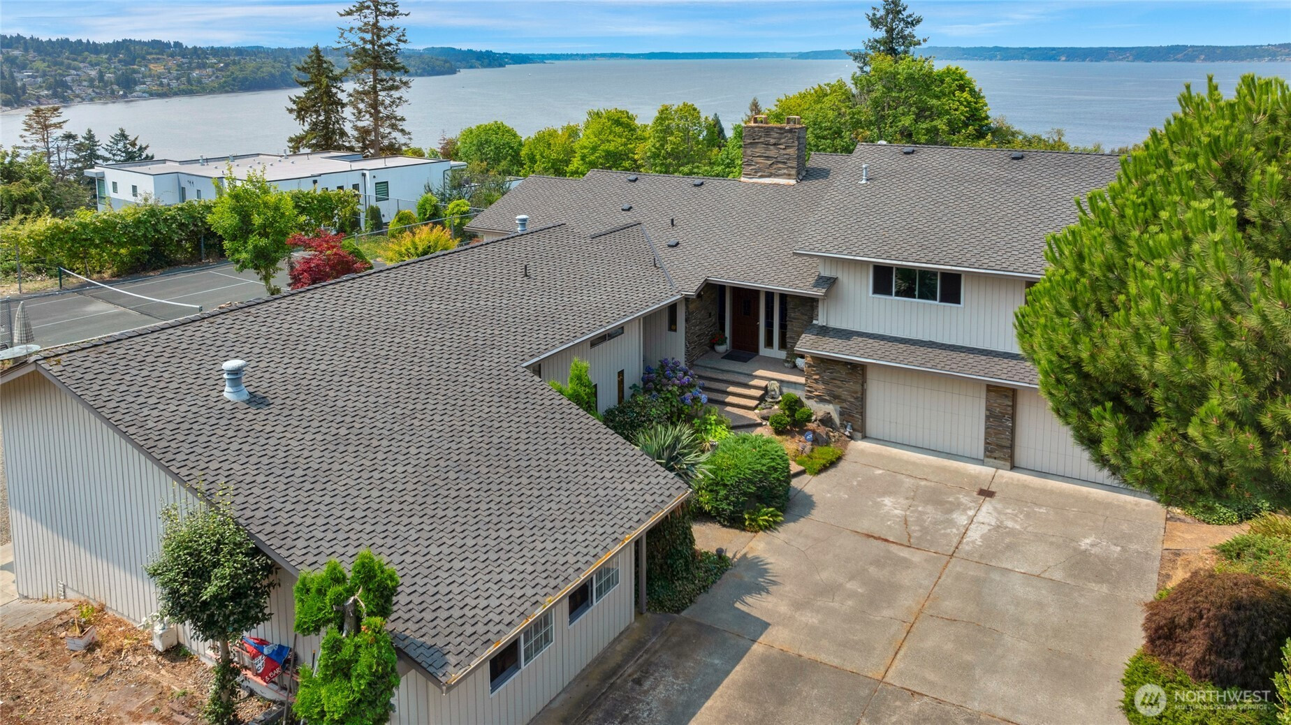 Set on a gated private street of only five residences, this 1.46-acre estate offers a peaceful sanctuary close to town. The ~3,950 sq ft main home features a harmonious layout with expansive areas for entertaining, four bedrooms tucked away, and views of the Sound. Enhancing the grounds are a sport court, circular driveway, and generous space for bespoke landscaping or gardening. The presidential roof (2005) and oak hardwoods (2024) add timeless appeal. Rounding out the estate is a separate ~1330 sq ft 1BR+.75BA guest home complete with a cozy loft and its own parking pad, offering versatility or rental income. Cherished for over 2 decades, this home's potential stands poised to fulfill its next steward's vision of their forever home.