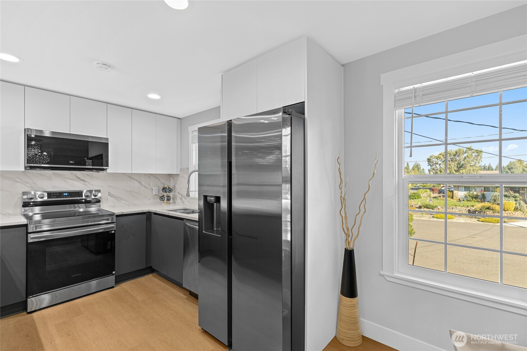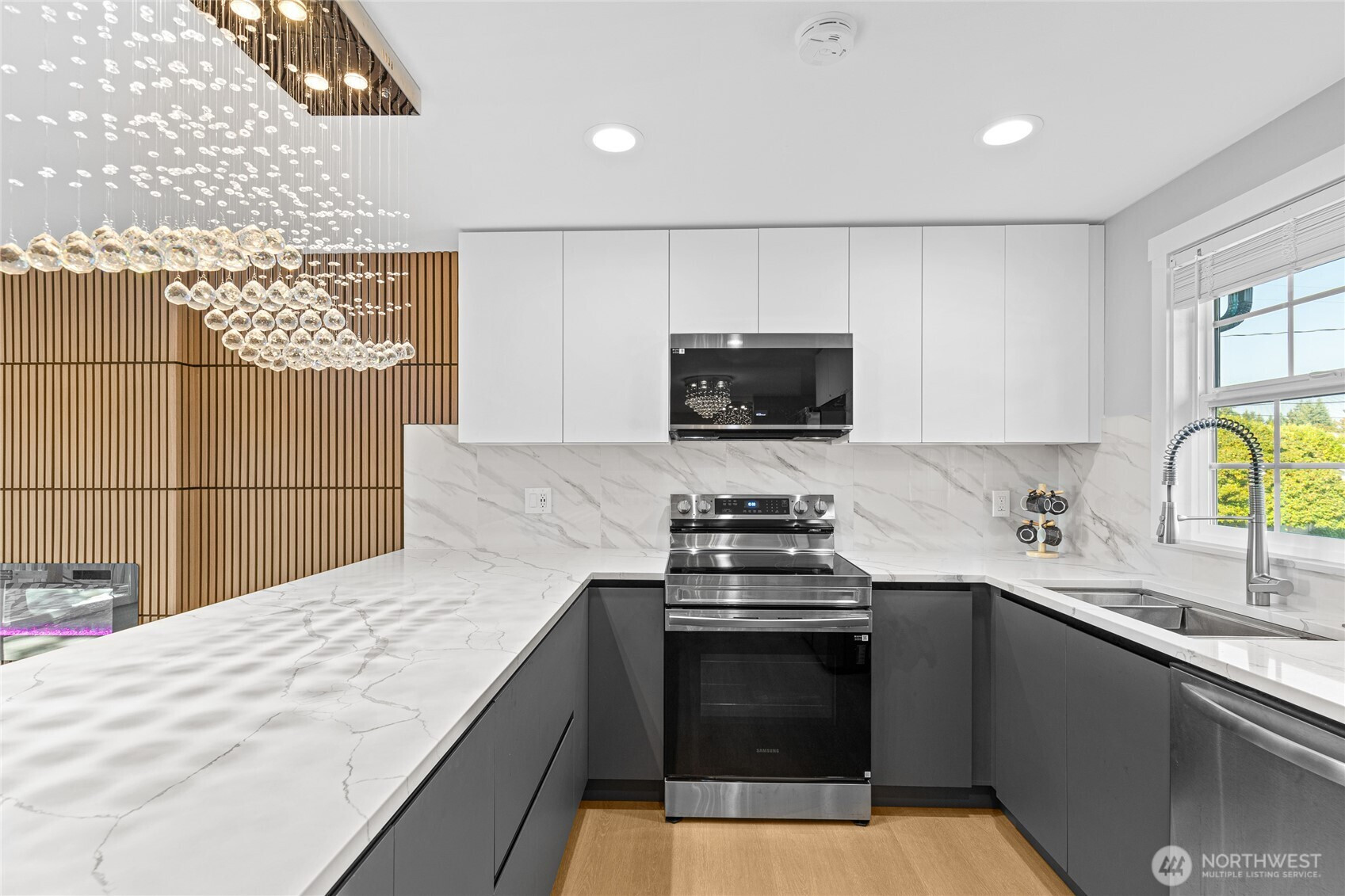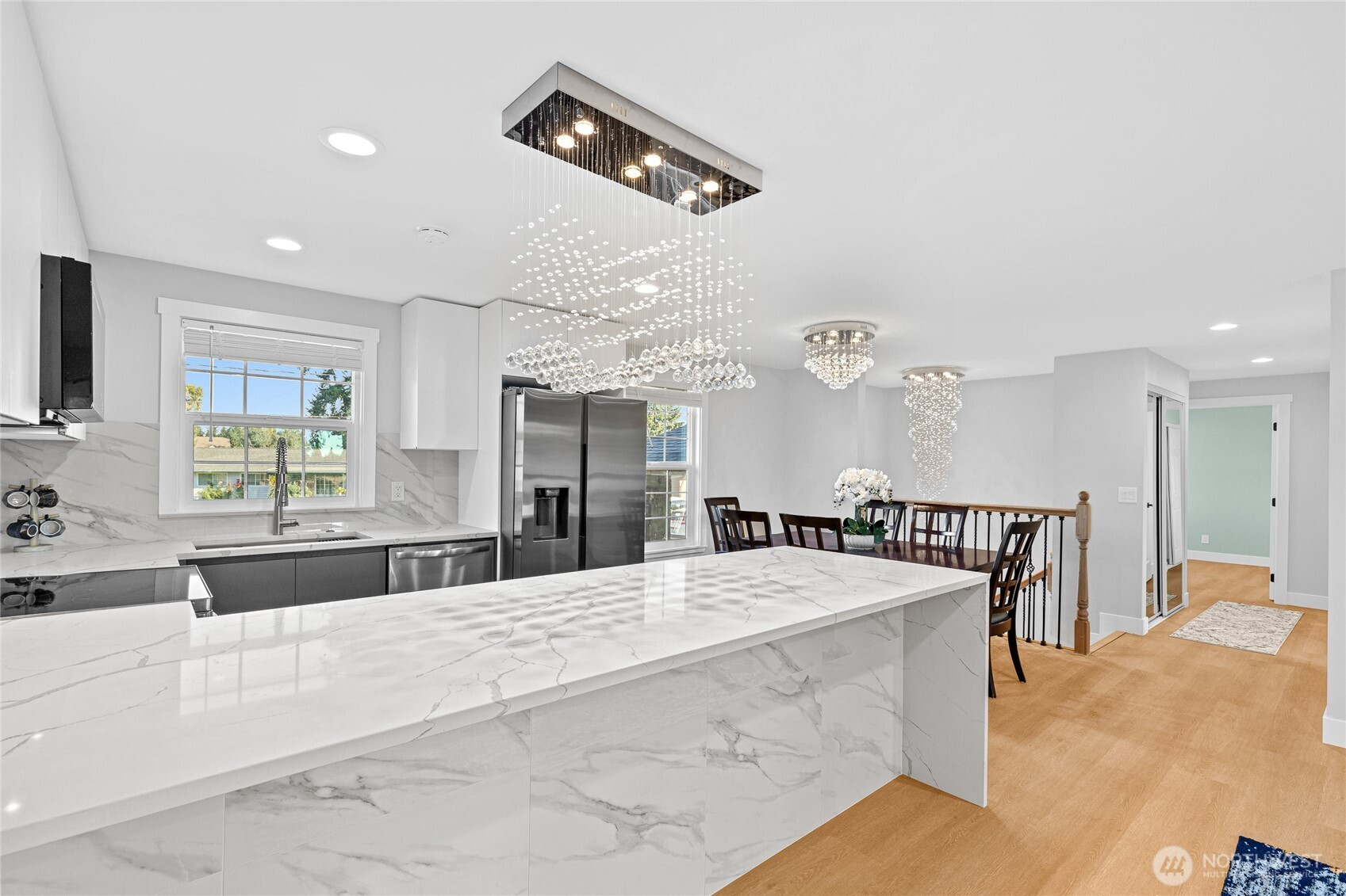 Welcome to this beautifully updated modern split-level home offering 2,020 sq. ft. of stylish living space on an 8,541 sq. ft. corner lot in the desirable Renton Highlands neighborhood. Upper level featuring a fully remodeled kitchen with sleek stainless steel appliances, quartz countertops, and contemporary cabinetry that seamlessly connects to the bright and spacious living and dining areas. The upper floor also offers 3 comfortable bedrooms and a modern full bathroom. On the lower level, enjoy a generous family room, a fourth bedroom, a second bathroom, and an additional bonus room. This home has been extensively updated with new roof, windows, flooring, siding, and much more. Attached 3-car garage equipped with an electric car charger. Just minutes from HWY-405 and the shopping center at the Landing!
