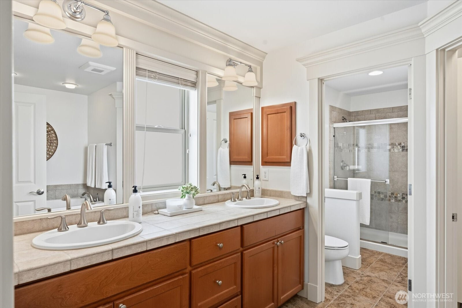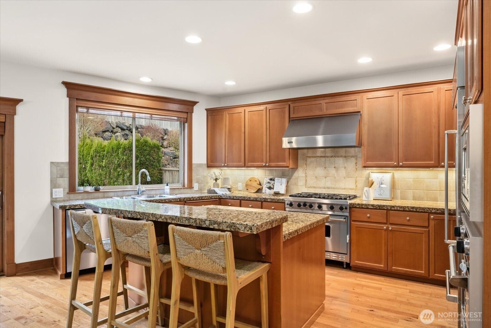 Tucked within the highly sought-after Illahee neighborhood, this exceptional 4-bedroom + office and 2.5 bath Burnstead home showcases timeless design, impeccable craftsmanship, and refined detailing throughout. A soaring two-story entry sets an elegant first impression. The thoughtfully designed main floor features an office with rich millwork and classic wainscoting, a conveniently located powder bath, and an elegant formal dining room perfect for hosting. An epicurean kitchen that is a true showpiece featuring top-of-the-line SS appliances, including a Viking 6-burner cooktop, Sub-Zero refrigerator, double oven, generous prep space, walk-in pantry, and sunny eating nook. The nook opens to an inviting, entertaining patio surrounded by lush landscaping and a fully fenced backyard, creating seamless indoor-outdoor living. The adjacent family room impresses with a dramatic floor-to-ceiling stone-and-wood gas fireplace and an expansive panoramic window that floods the space with natural light. Upstairs, the serene primary suite offers a luxurious five-piece spa-inspired en-suite bath, 3 additional bedrooms, all with built-in closet organizers, and spacious guest bath. Well-appointed upstairs utility room includes a washer, dryer, and utility sink. Brand new roof & plush carpet, fresh interior paint, A/C, pre-inspected. Enjoy Illahee’s park, playground, athletic court, picnic area, and trails. Top-rated Lake Washington Schools, and steps away from shopping & dining! Welcome home!