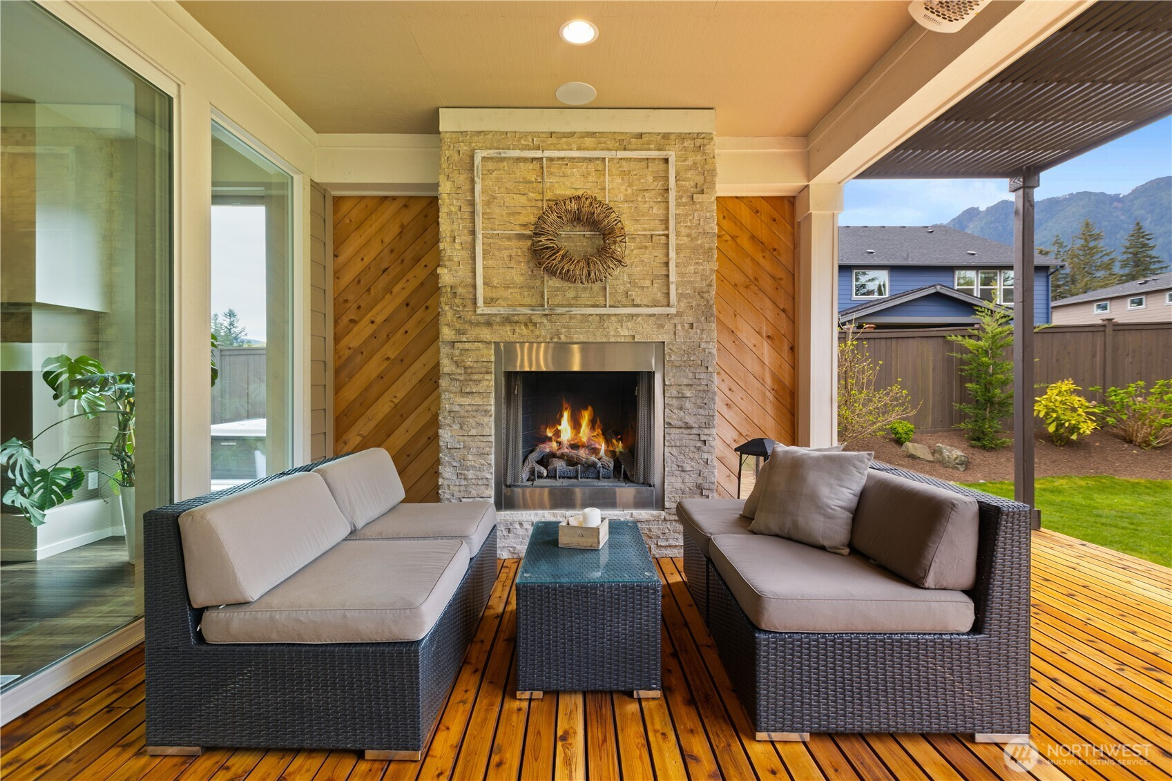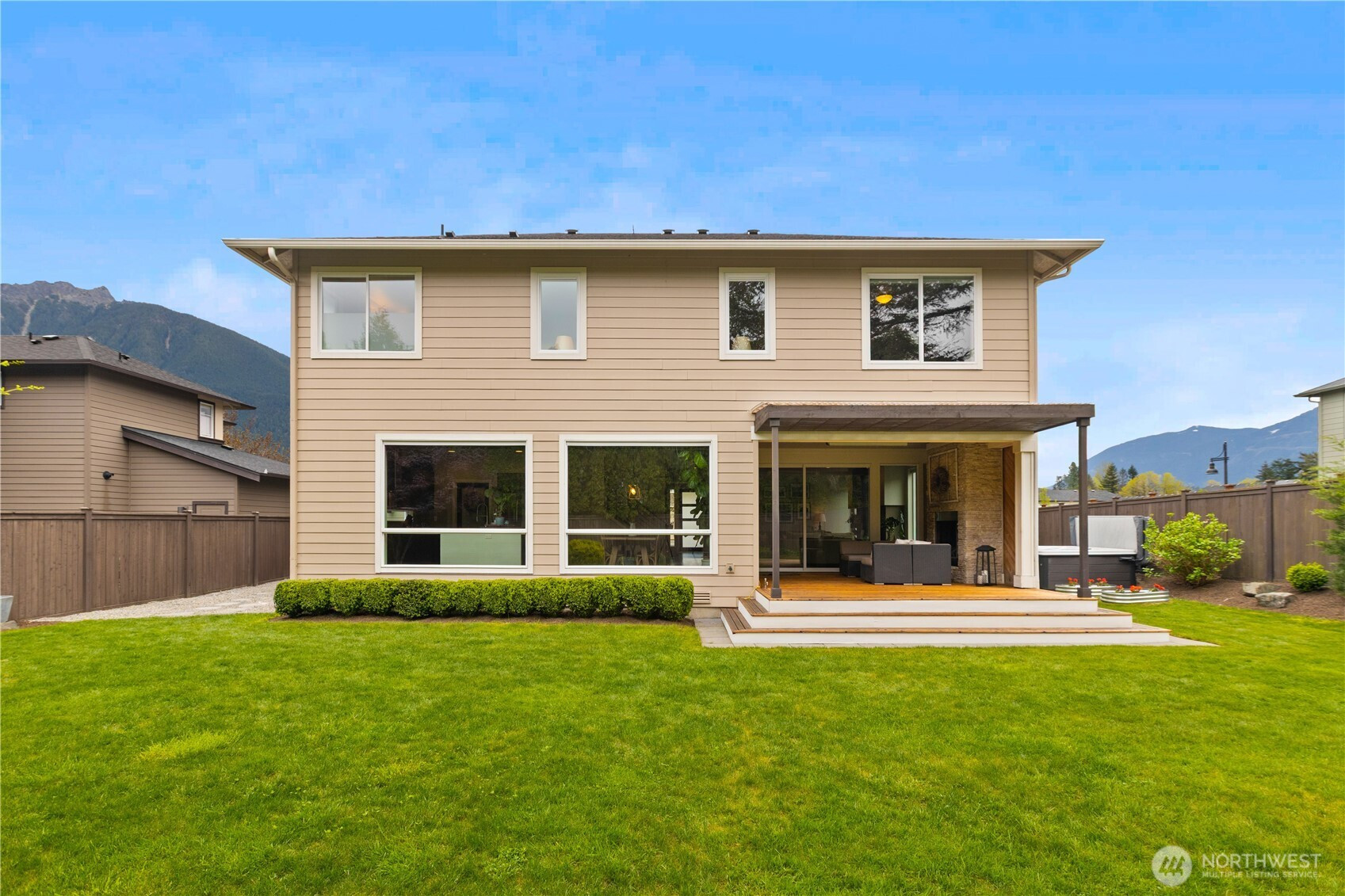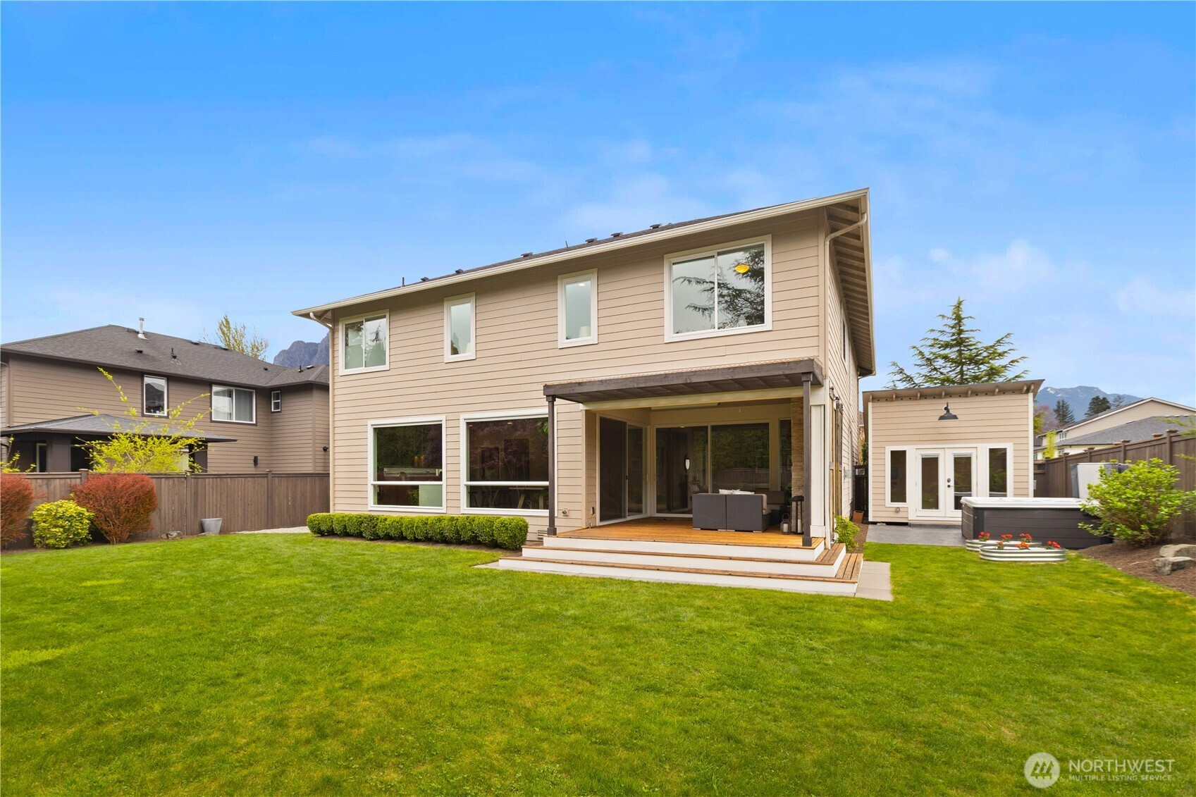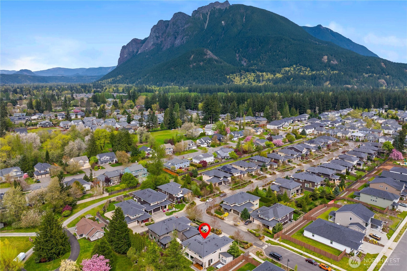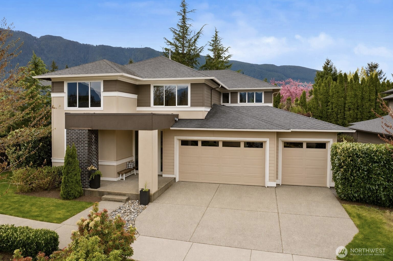 Wake up each morning to breathtaking mountain views in this stunning, 3,012 sq. ft. home in Si View Estates. On the main floor you’ll find the family room with cozy gas fireplace, open-concept kitchen & dining spaces great for hosting, 1/2 bath for guests, & a den with custom built-ins & French doors. The kitchen is a chef’s dream, with quartz counters, SS appliances, & a pantry with custom shelving. Beautiful laminate wood floors & new carpet & interior paint make this home move-in ready. Upstairs, 4 beds, 2 baths, a versatile loft, & a large laundry room provide comfort & space for all. The luxurious primary suite features a custom walk-in closet & spa-like 5-piece bath with a deep-soaking tub. Step outside on the covered deck & into the spacious & flat, fully-fenced yard. Mature landscaping creates a peaceful & picturesque setting. The extended deck is designed for year-round enjoyment with its own gas fireplace & electric heater. On the stamped-concrete patio, unwind in the 8-person hot tub or take advantage of the detached studio, a flexible space you may use for anything! Home office, exercise, art or something else? Complete with a mini-split for heat/AC & LVP floors, it’s perfect for any of your needs. Additional highlights include a 3-car garage, a generator capable of powering the whole home, EV charging, & a sought-after neighborhood with paved paths to downtown, nearby trails, & parks. Located within top-rated Sno-Valley Schools. Don’t miss this must-see home!