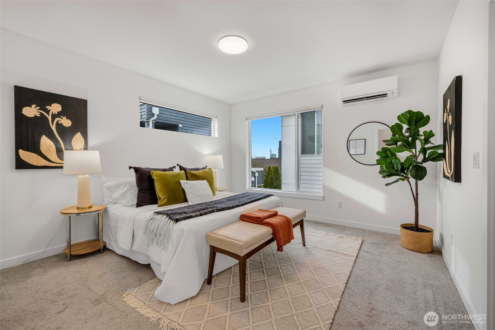 Experience unparalleled urban living in this nearly new, light-filled townhome where privacy meets stunning rooftop views. The main level greets you with floor-to-ceiling windows and a rare, unobstructed layout—allowing you to enjoy afternoon light without looking into a neighbor's window. The thoughtful floor plan offers a quiet entry-level with two bedrooms and a full bath. The second level is dedicated to an airy, open-concept Great Room anchored by a chef-ready kitchen island. Retreat to the top floor with a dedicated primary bedroom, walk-in closet and spa-inspired ensuite bath. Crowning the home is a private rooftop deck featuring rare vistas of the both the Seattle and Bellevue skylines, framed by the majestic Cascades and Mt Rainier. Complete with mini-split A/C and off-street parking, you’re tucked away in a peaceful enclave just minutes from the electric energy of Capitol Hill’s Pike/Pine corridor with easy access to grocery, dining and transit.