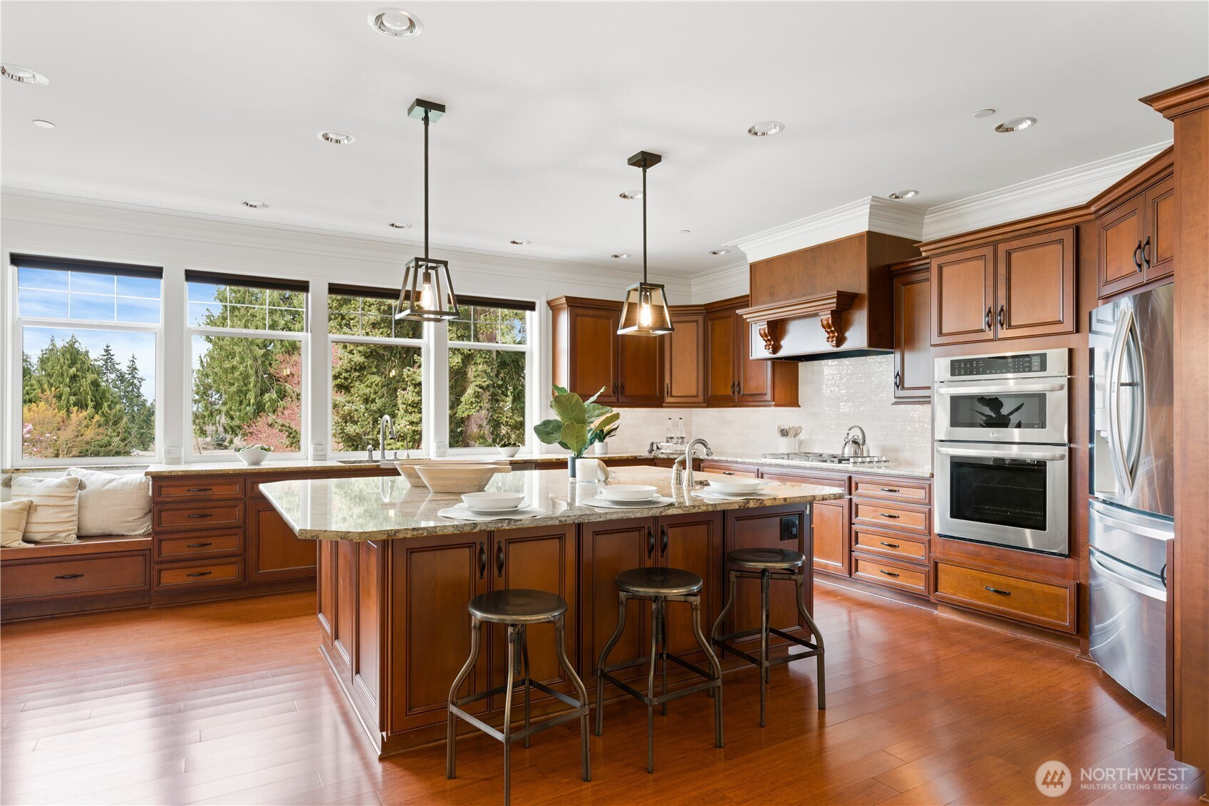 Majestically perched on a knoll with beautiful views of Lake Washington and the Seattle skyline in the highly sought after Highlands Neighborhood. The open concept main level is designed for entertaining and comfortable living. The great room flows into the dining area and gourmet kitchen with quaint built-in bench, new backsplash, granite counters and generous counter space. The chef’s kitchen features a large center island, computer area and a spacious walk-in pantry. The seamless design blends luxury with modern conveniences, connecting the kitchen to all the main living spaces with doors to the large flat yard. A dedicated home office and guest suite complete the main level. The flowing upper level includes the sumptuous primary suite with stunning Lake and Seattle views from the private view deck, spa inspired bath, and walk in closet. The upper level boasts three additional bedrooms, a flex space and a spacious laundry room. On the lower level don’t miss the finished game room/work out space, a storage room, and ¾ bath off the garage. The impressive circular driveway includes a side entrance, 3 car extended garage for ample parking and storage. Minutes to downtown Kirkland’s upscale restaurants, boutiques, art galleries, beaches, Google, highly rated Lake Washington schools and so much more. Welcome!