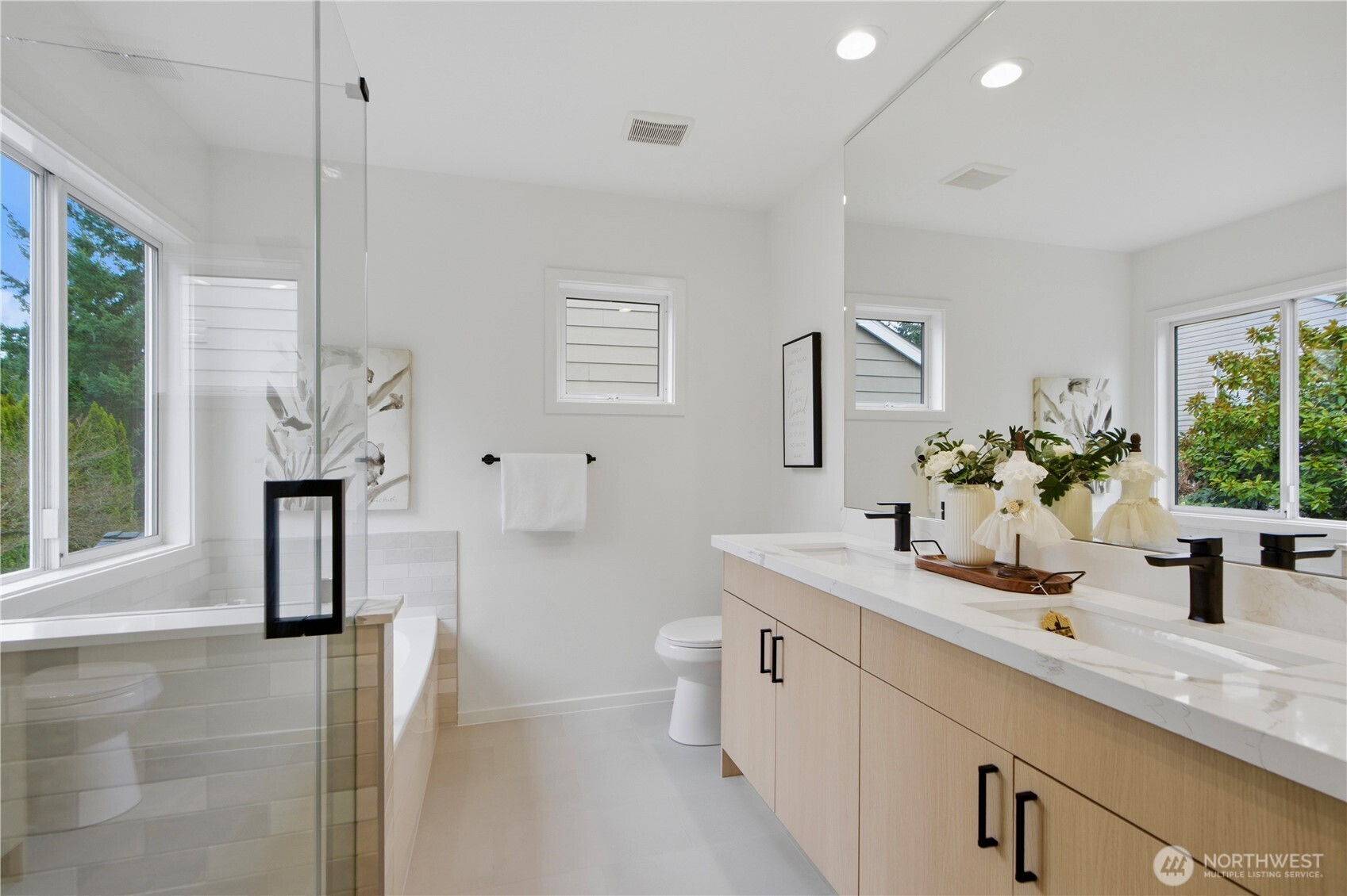 Welcome to this light-filled home in sought after Kirkland Highlands. Tastefully updated in 2026, the home features a stunning new kitchen, fully refreshed two bathrooms, laundry, along with other recent upgrades including fresh interior paint, plush carpeting, refinished hardwood floors, and updated plumbing fixtures and lighting—offering a move-in-ready home that blends modern comfort with timeless appeal. Abundant natural light pours through large south-facing windows in the living room, family room, and primary bedroom. The open floor plan flows seamlessly, with a soaring entry leading to a cozy living room and a dining area with French doors that open to a backyard with privacy. Spacious master suite offers walk-in closet and a 5 piece bath. A second primary bedroom with a private balcony and vaulted ceilings, perfect for guests or multi-generational living. Steps from the Cross Kirkland Corridor, easy access to DT Kirkland and Bellevue. Award-winning schools and a vibrant community.