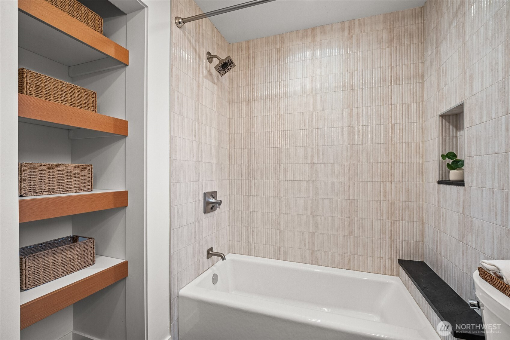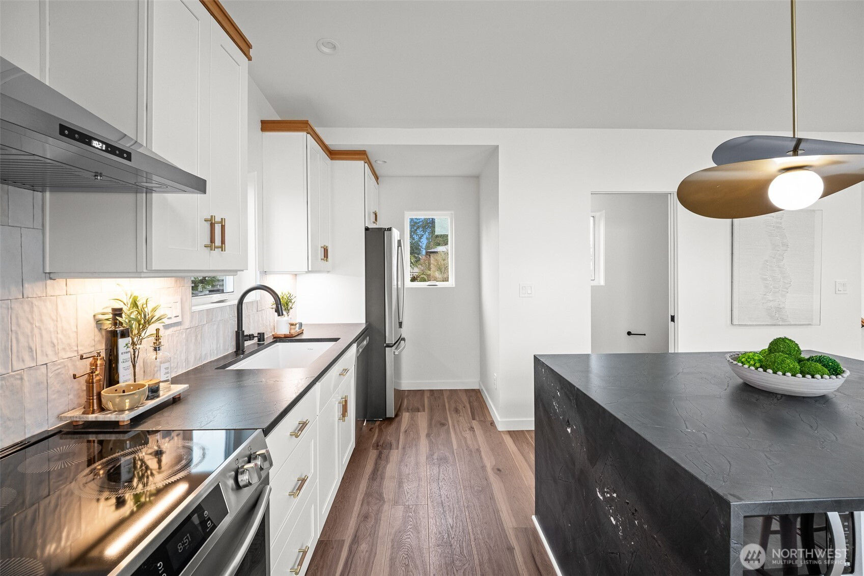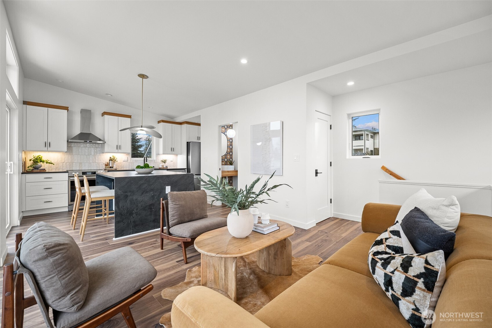 Modern design meets functional living in this custom-built standalone Broadview home. Thoughtfully designed with two bedrooms on the main level, this home offers separation, privacy, and a layout that maximizes comfort and livability. Upstairs, the open-concept living space is filled with natural light from oversized windows and anchored by a sleek kitchen featuring quartz countertops, designer finishes, and a large island, perfect for everyday living and entertaining. Enjoy seamless indoor-outdoor living with a rooftop deck directly off the kitchen, ideal for hosting and relaxing year-round. A private backyard patio provides additional outdoor space, while the attached garage offers convenient parking and storage. Clean lines, modern finishes, and quality construction throughout. Conveniently located near the Northgate light rail, and major commuter routes. Stylish, low-maintenance living in a prime location.