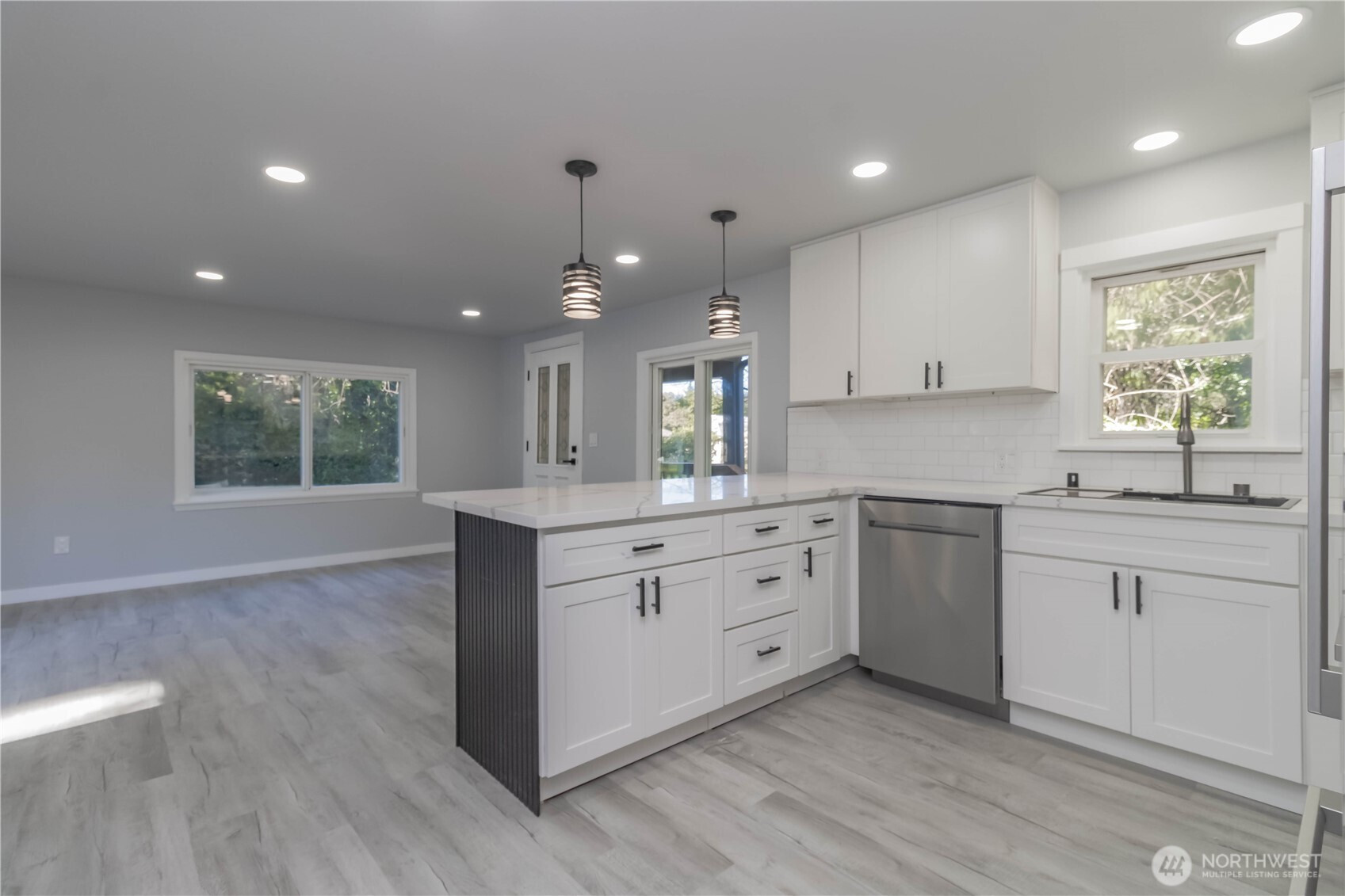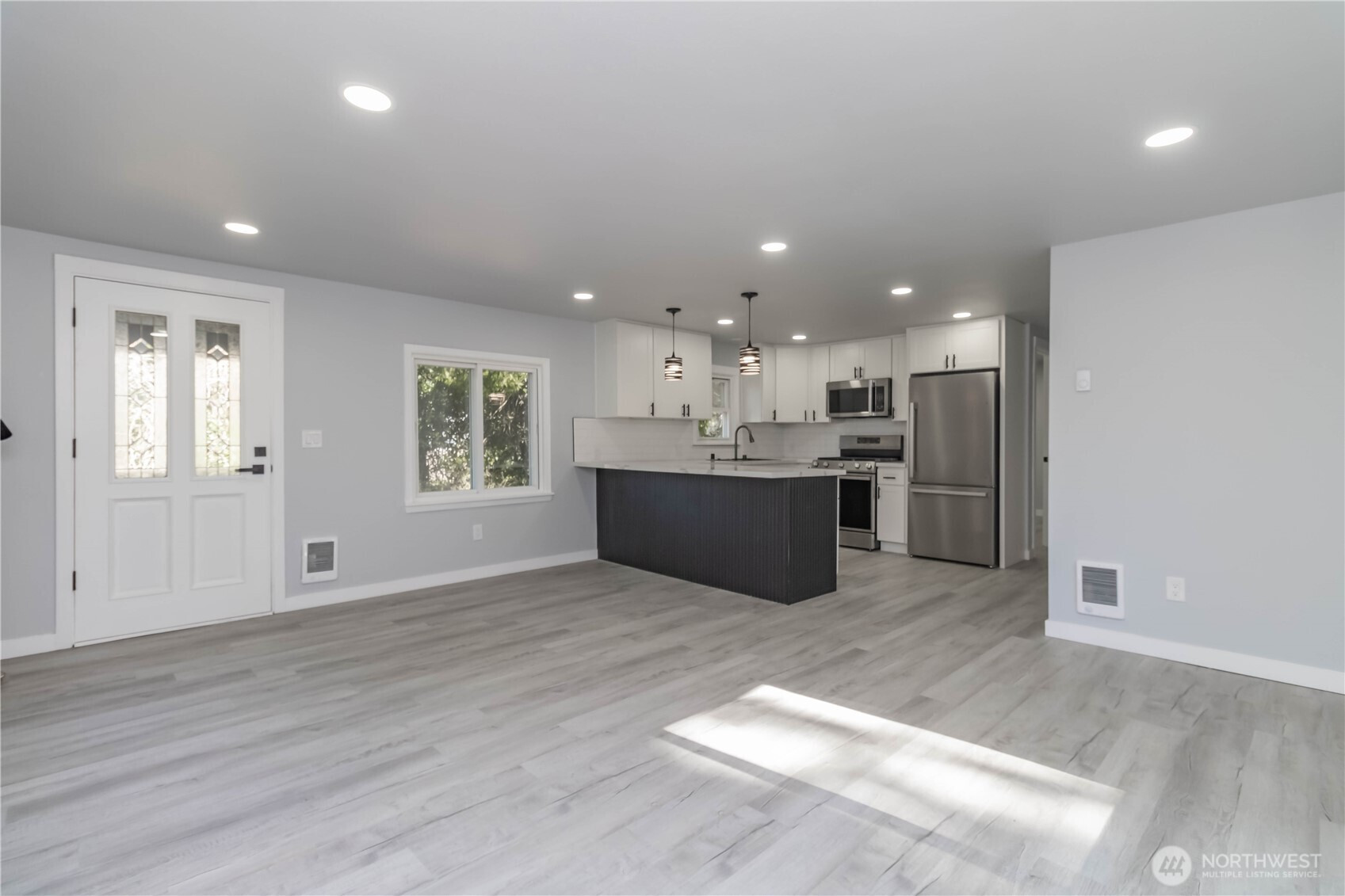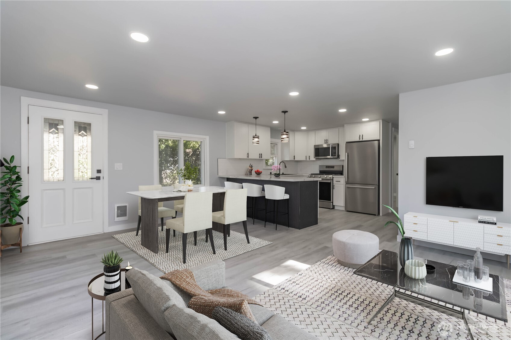 Renovated 2-bedroom, 1-bath home with 810 sq ft on a 9,000+ sq lot in South Seattle. Single-level layout with open-concept living, dining, and kitchen design. Interior features include recessed lighting, LVP flooring, sliding barn-style closet doors, and modern finishes throughout. Kitchen includes stainless steel appliances, island with seating, and updated cabinetry. Major system upgrades include new roof, plumbing, electrical, HVAC. Detached garage plus driveway parking. Fully fenced 9,000+ sq ft level lot offers space for expansion, DADU potential, or additional outdoor use (buyer to verify). Located approximately 1 mi to I-5 access, 2 mi to SR-509 4 mi to Sea-Tac Airport, and 11 mi to Downtown Seattle. Convenient access to regional highways, shopping, and transit corridors.