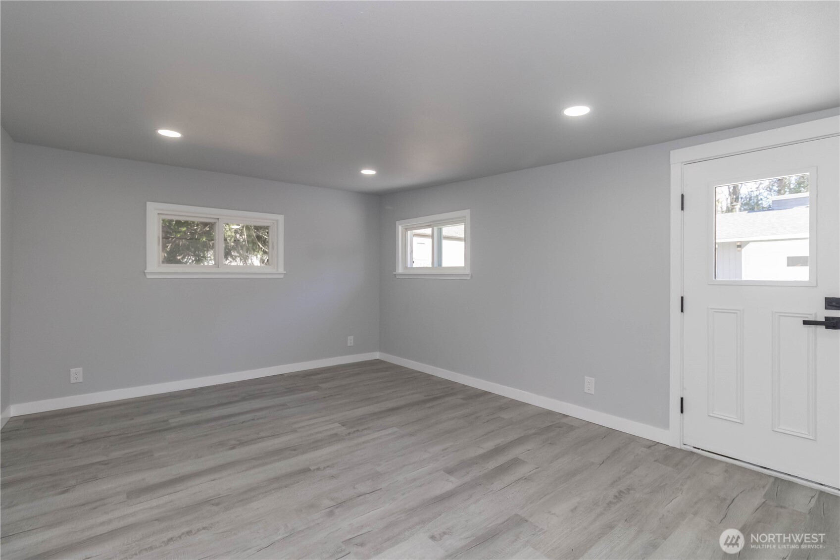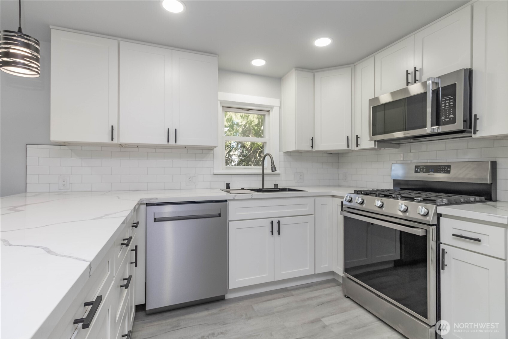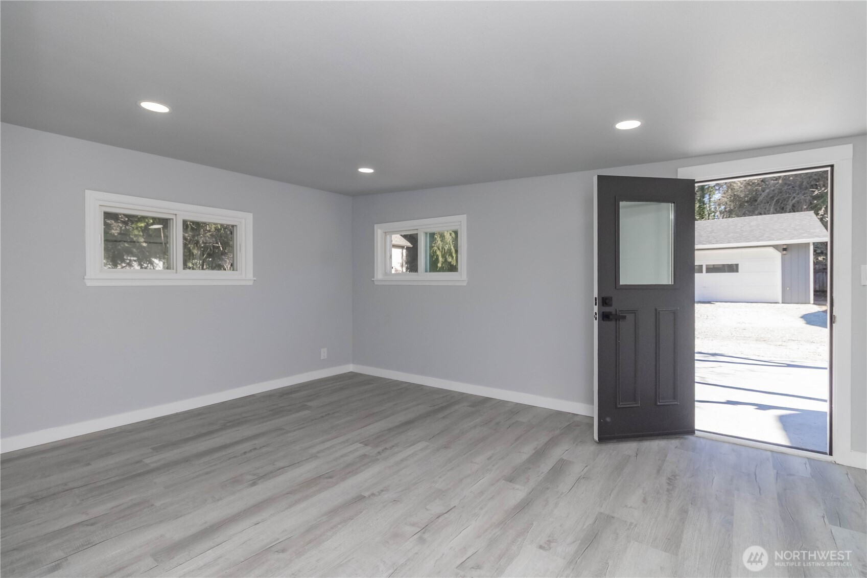 Renovated 2-bedroom, 1-bath home with 810 sq ft on a 9,000+ sq lot in South Seattle. Single-level layout with open-concept living, dining, and kitchen design. Interior features include recessed lighting, LVP flooring, sliding barn-style closet doors, and modern finishes throughout. Kitchen includes stainless steel appliances, island with seating, and updated cabinetry. Major system upgrades include new roof, plumbing, electrical, HVAC. Detached garage plus driveway parking. Fully fenced 9,000+ sq ft level lot offers space for expansion, DADU potential, or additional outdoor use (buyer to verify). Located approximately 1 mi to I-5 access, 2 mi to SR-509 4 mi to Sea-Tac Airport, and 11 mi to Downtown Seattle. Convenient access to regional highways, shopping, and transit corridors.