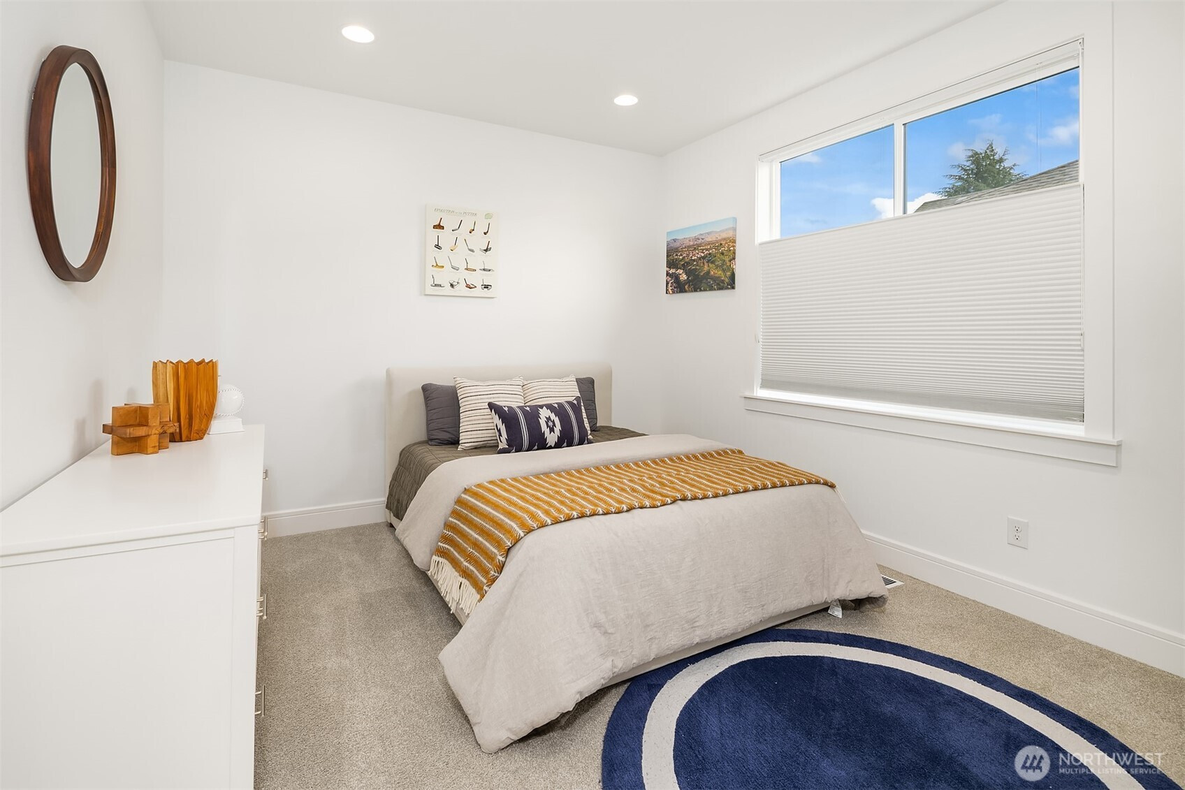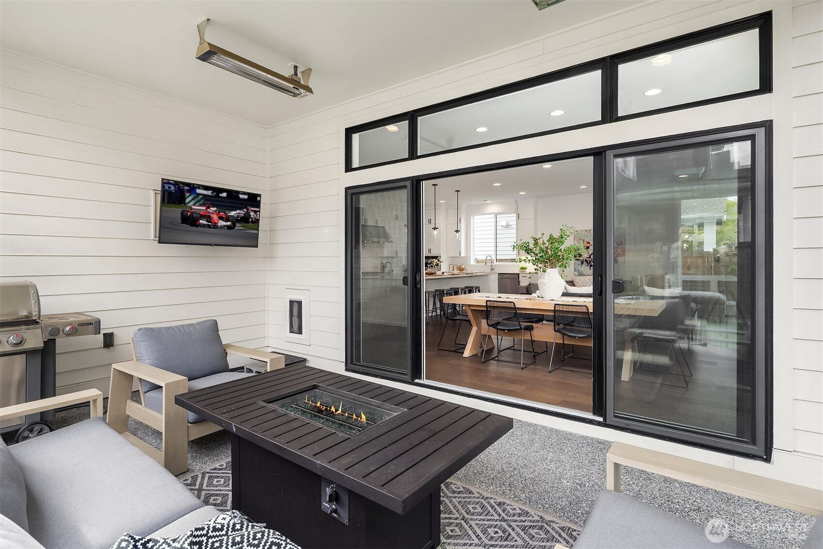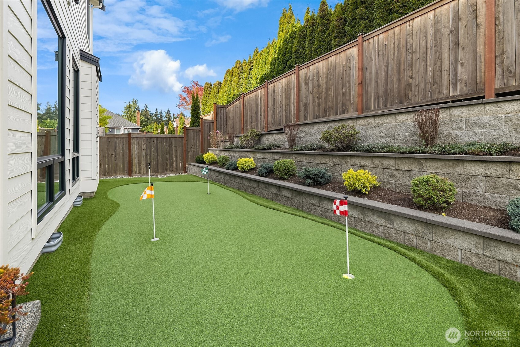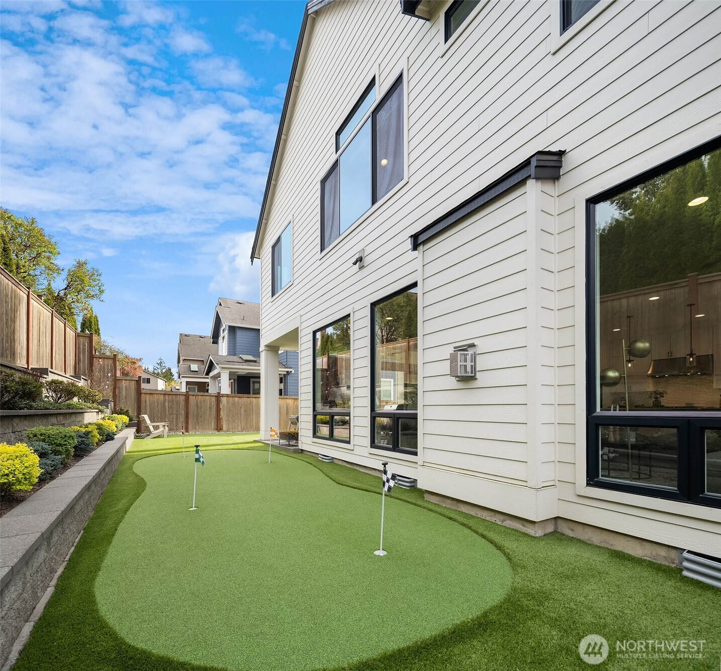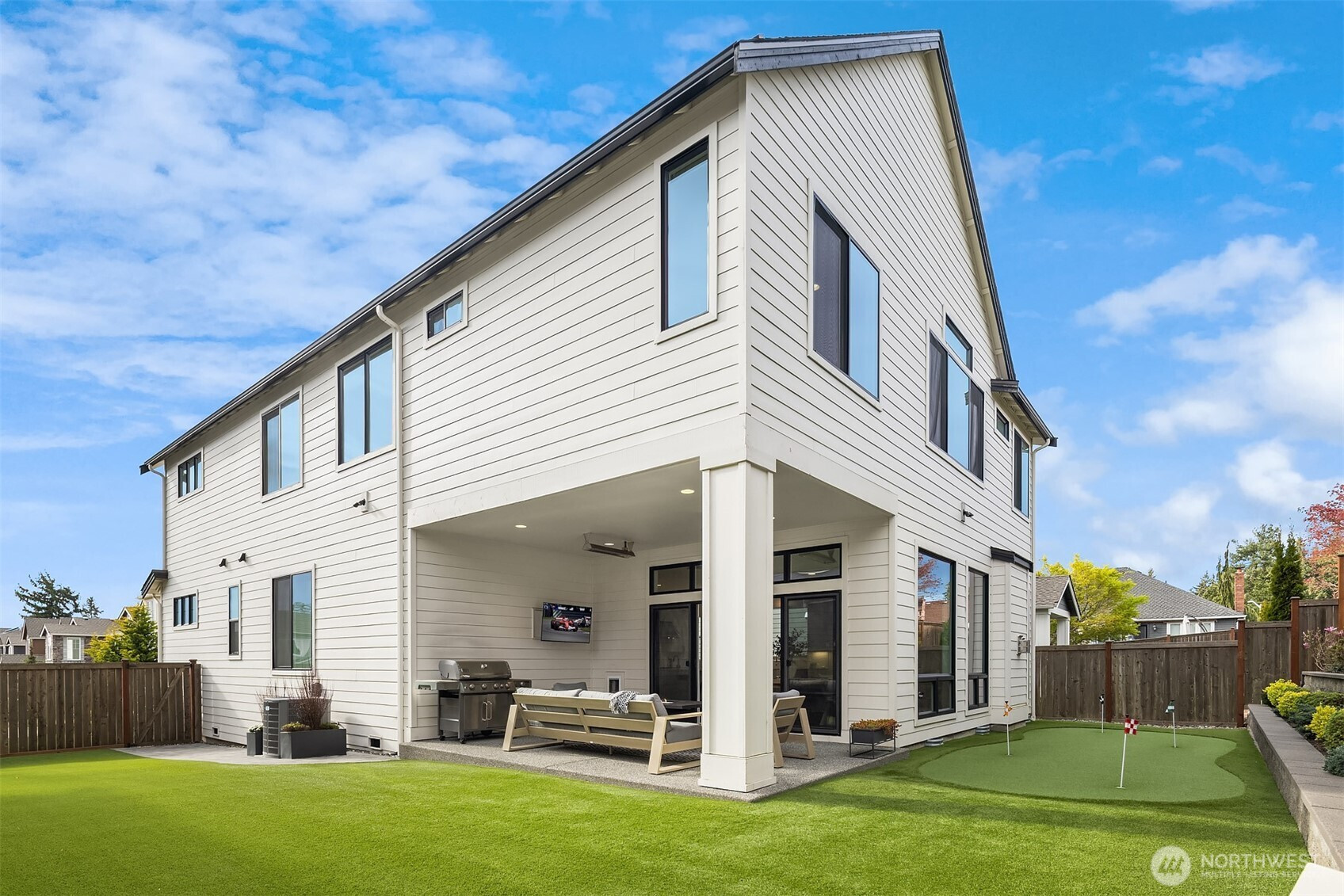 Nestled among a collection of elegant homes, this beautifully designed residence offers exceptional quality, comfort, and style. The main floor showcases soaring 10-foot ceilings and expansive windows that fill the home with natural light, creating a bright and inviting atmosphere. The chef’s kitchen is a true centerpiece, featuring quartz countertops, ample cabinetry, premium KitchenAid appliances, a 6-burner gas stove, double oven, and a generously sized walk-in pantry—perfect for both everyday living and entertaining. The open-concept living area is warm and welcoming, highlighted by a gas log fireplace and seamless access to a covered patio with overhead heating—ideal for year-round outdoor enjoyment. A main floor bedroom with an adjacent bath provides excellent flexibility for guests or multi-generational living. Upstairs, the spacious primary suite offers a luxurious retreat with a spa-inspired bathroom, including a standalone soaking tub, walk-in shower, skylight, vaulted ceiling, and an expansive walk-in closet. Three additional bedrooms each offer their own unique character and charm, while a versatile bonus room provides endless possibilities for a media room, playroom, or home gym. Step outside to a fully fenced backyard designed for low maintenance and relaxation, featuring artificial turf, landscaped privacy, and your very own putting green. Additional highlights include a fully finished drywall garage and a location that combines privacy with convenience.