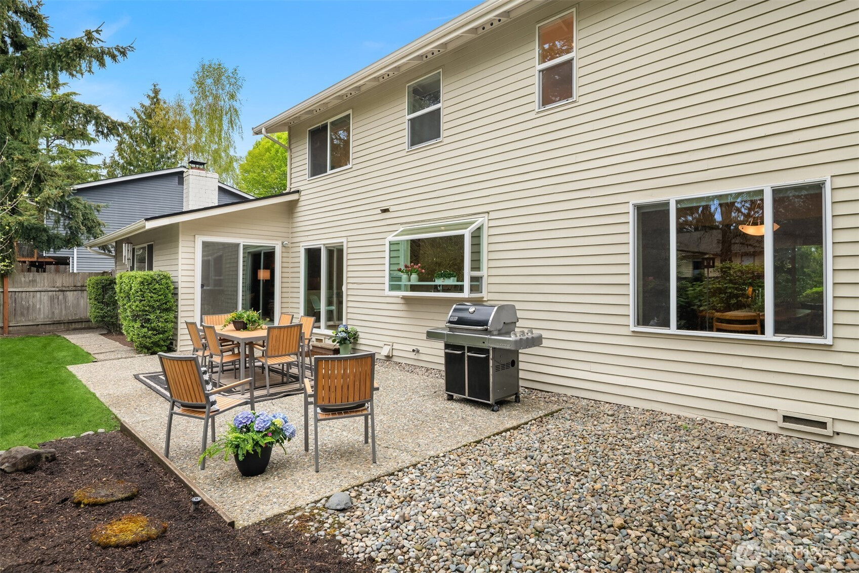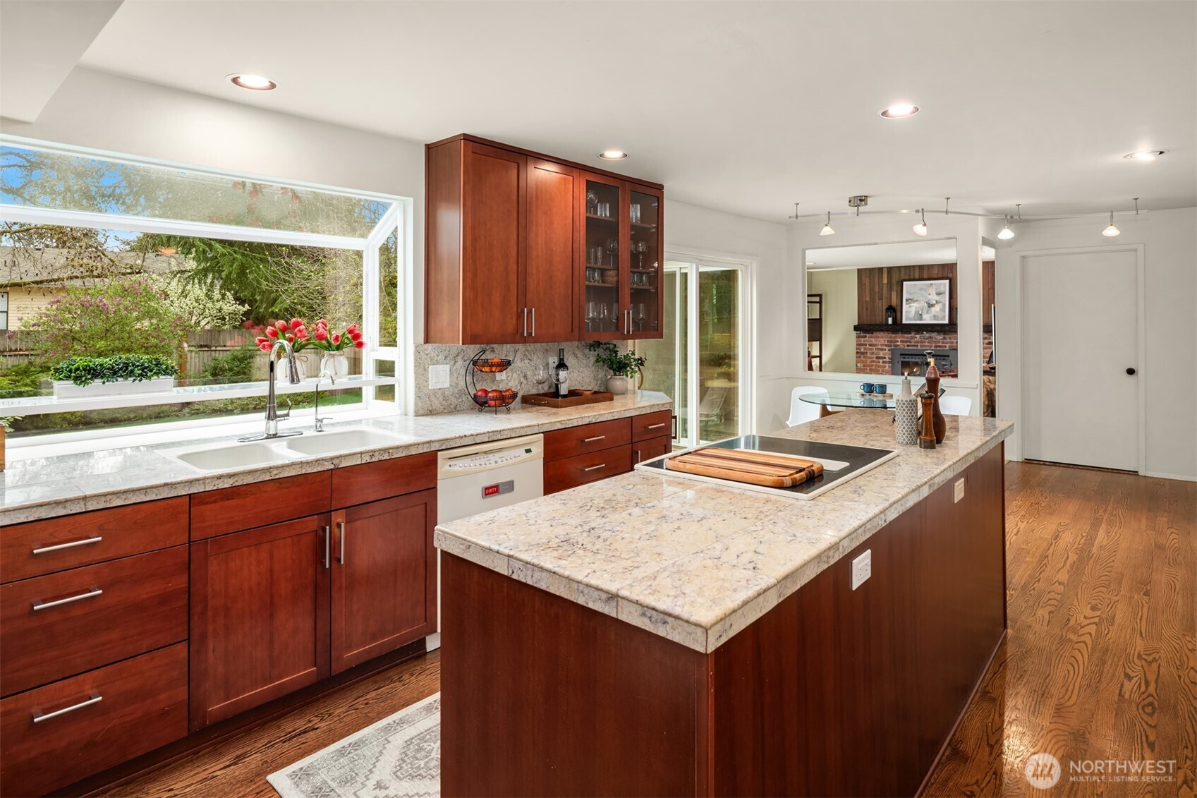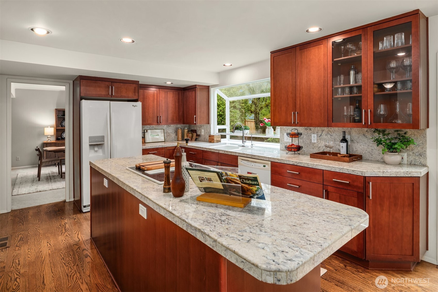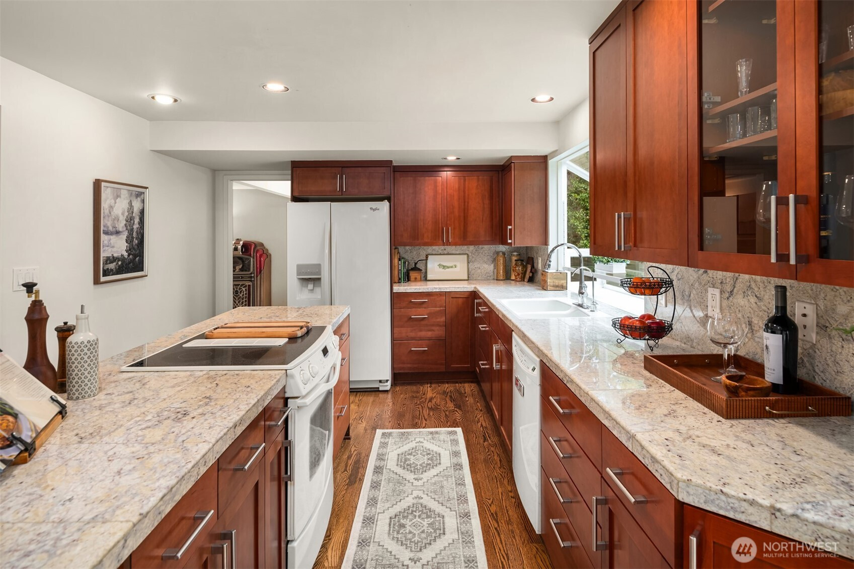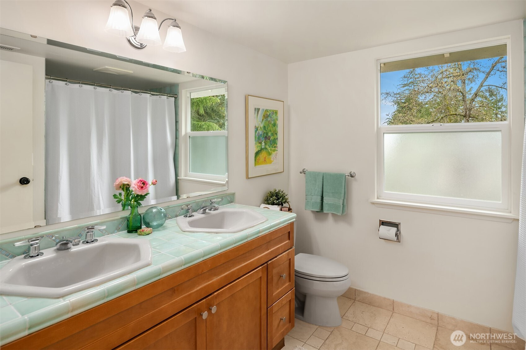 This beautifully updated 5-bedroom 3.25 bath, two-story classic in the heart of Kirkland's Finn Hill is well appointed with stylish comforts and room for all. Sited on a fully fenced 8,640 sq ft lot with serene outlooks, it's an oasis in the Hermosa Vista neighborhood. You'll love the natural light and desirable floorplan hosting a large culinary kitchen, spacious living, dining and family rooms. The expansive primary suite impresses with skylights, dual closets, and a private ensuite bath. Three additional inviting bedrooms complete the upper level, while the main floor features a spacious 5th bedroom or office with an adjacent ¾ bath and powder room. Enjoy the outdoors; a fully fenced yard, lovely patio and yard perfect for gathering and play. Convenient shed houses all your gardening needs. Recent upgrades include a brand-new roof, interior paint and lighting. Noteworthy's include; energy efficient heat pump heating, A/C, peek-a-boo Lake WA views, pull-down-stair garage storage and a third space driveway RV parking pad. Such a lovely friendly neighborhood to walk and take in the Lake Washington views. Convenient to shopping, schools, restaurants and coffee. Nearby to Denny, St Edward's and Juanita Beach parks. Highly rated Lake Washington schools. Preinspected + 1Yr Home Warranty. Welcome home!