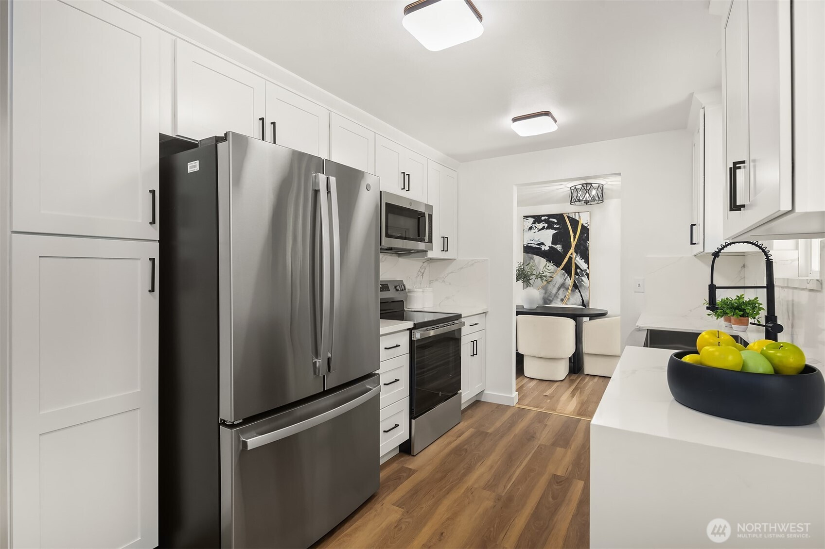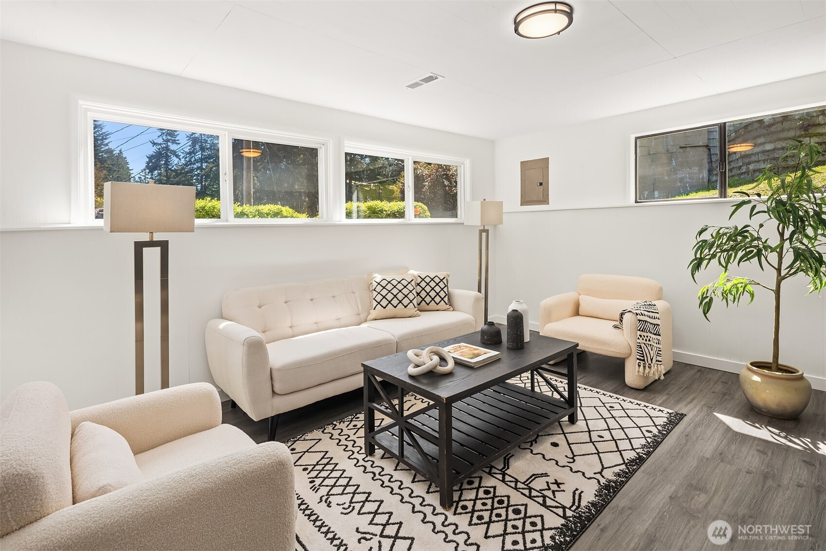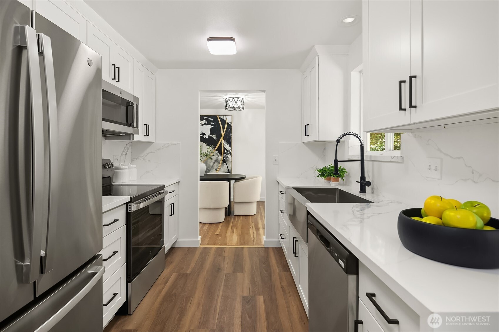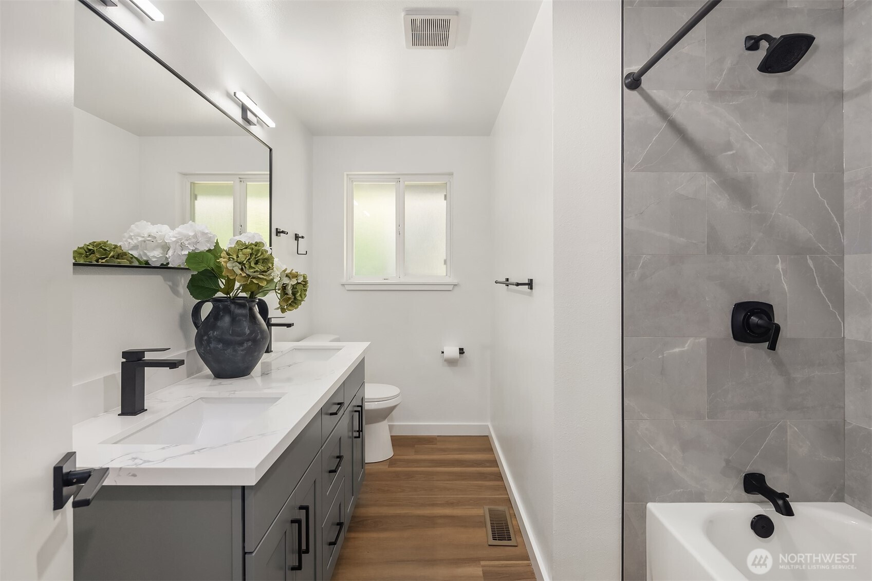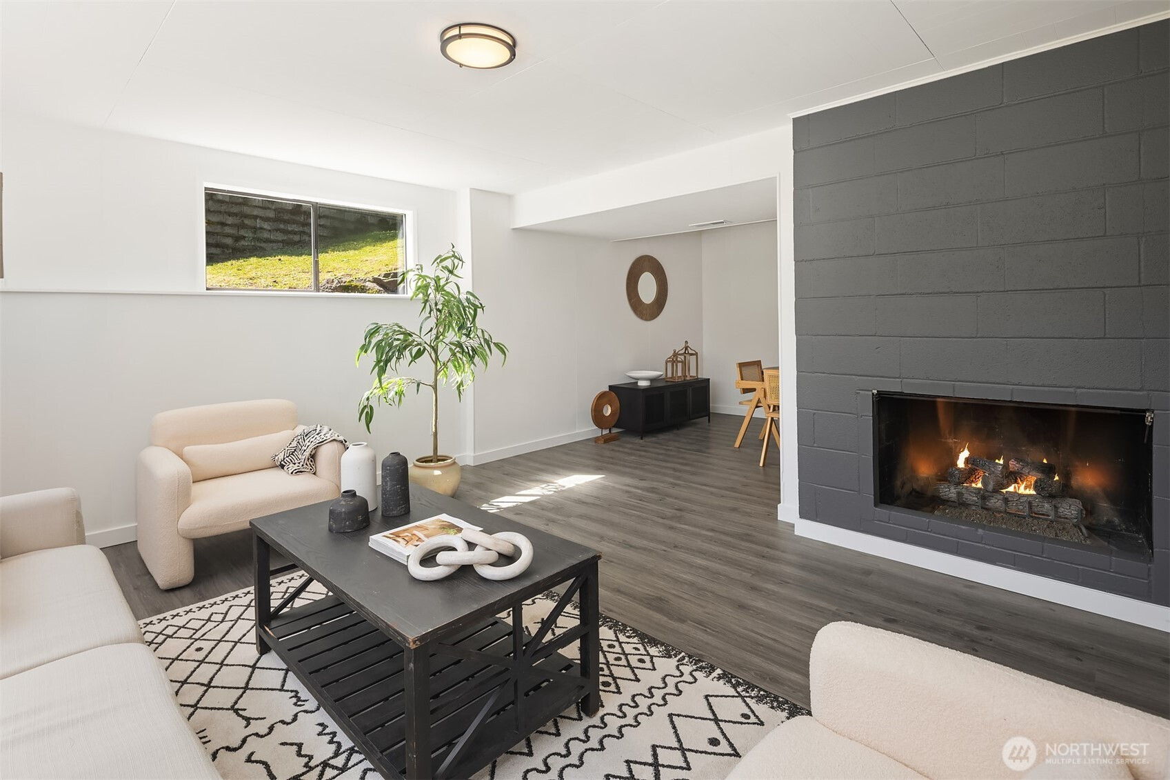 Tucked away on a quiet cul-de-sac at vibrant border of Seattle & Shoreline, this beautifully renovated residence offers a true turn-key living. Step inside to a light-filled interior where every detail has been meticulously curated. Brand new kitchen w/timeless white shaker cabinetry, quartz countertops, farmhouse sink & SS appliances. All bathrooms are tastefully remodeled w/designer finishes. Sunlit living room w/fireplace, 3 spacious bedrooms & rec room on lower level w/2nd fireplace. Additional recent upgrades include, newly refinished hardwood floors, new LVP flooring, new interior & exterior paint, gas furnace (2024), newer roof. Sought-after Shoreline SD. Minutes away from LR station & highways. Close to all amenities. Pre-inspected!