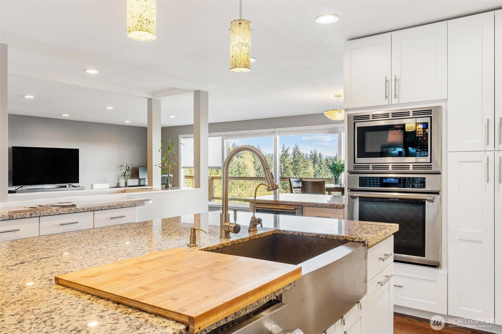 Enjoy breathtaking Mt. Rainier views from this beautifully updated Mid-Century residence that perfectly blends timeless architecture with thoughtful modern upgrades and versatile living spaces. The light-filled open-concept main level showcases expansive windows, spacious living and dining areas, and a chef-inspired kitchen featuring premium Thermador appliances, abundant cabinetry, and an oversized walk-in pantry with custom organization, all designed for both everyday living and effortless entertaining. Step outside to the expansive view deck, ideal for hosting gatherings, enjoying sunsets, or simply taking in the incredible mountain scenery. The lower level offers a fully equipped private suite with its own entrance and kitchen, creating an ideal setup for multi-generational living, guests, or extended stays. Additional features include a dedicated workout room, wine cellar, two sets of washers and dryers, air conditioning, newer insulation, beverage refrigerator, durable metal roof, and LeafFilter gutter system with warranty. The property also offers a three-car garage, extended driveway for additional parking, and a private, peaceful setting while still conveniently located just minutes to Highway 18, shopping, dining, Green River College, Auburn Golf Course, and local schools, making this home the perfect combination of privacy, functionality, and stunning Pacific Northwest views.