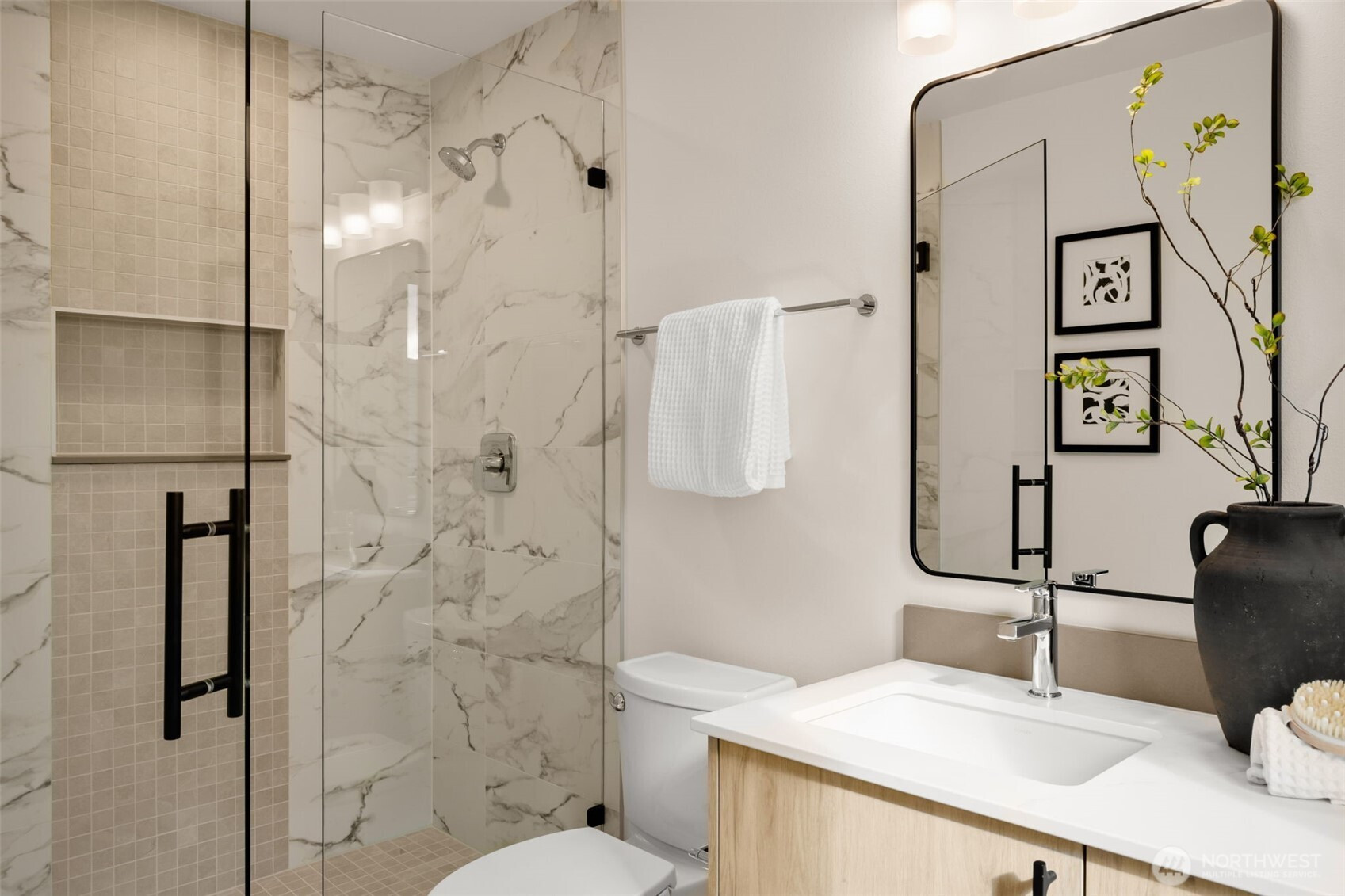 Introducing Knob Creek, an exceptional new construction home by Revolution Custom Builders, thoughtfully designed with timeless style and modern comfort in one of Kirkland’s most convenient locations. This beautifully crafted residence showcases high-quality finishes, intentional design, & a functional floor plan ideal for today’s lifestyle.The main level features a light-filled great room anchored by a statement fireplace, seamlessly flowing into the chef-inspired kitchen with a spacious island, premium appliances, & generous workspace; perfect for entertaining or everyday living. Large windows and sliding doors invite natural light and connect the interior living spaces to a private outdoor patio, creating an effortless indoor-outdoor experience. A welcoming covered front porch, elegant entry, & main-level powder room complete the thoughtfully designed first floor.Upstairs, the primary suite offers a serene retreat with a spacious walk-in closet and a beautifully appointed ensuite bath. 2 additional bedrooms, full bath, & upstairs laundry provide flexibility & functionality. Enjoy easy access to some of Kirkland’s most sought-after amenities. 2 designated EV-ready parking spots. Just minutes away are Juanita Village, Totem Lake Village, & DT Kirkland, offering dining, shopping, and entertainment. Outdoor recreation is abundant with nearby Juanita Beach Park, St. Edward State Park, & waterfront trails. Convenient access to I-405 makes commuting to Bellevue & Seattle.