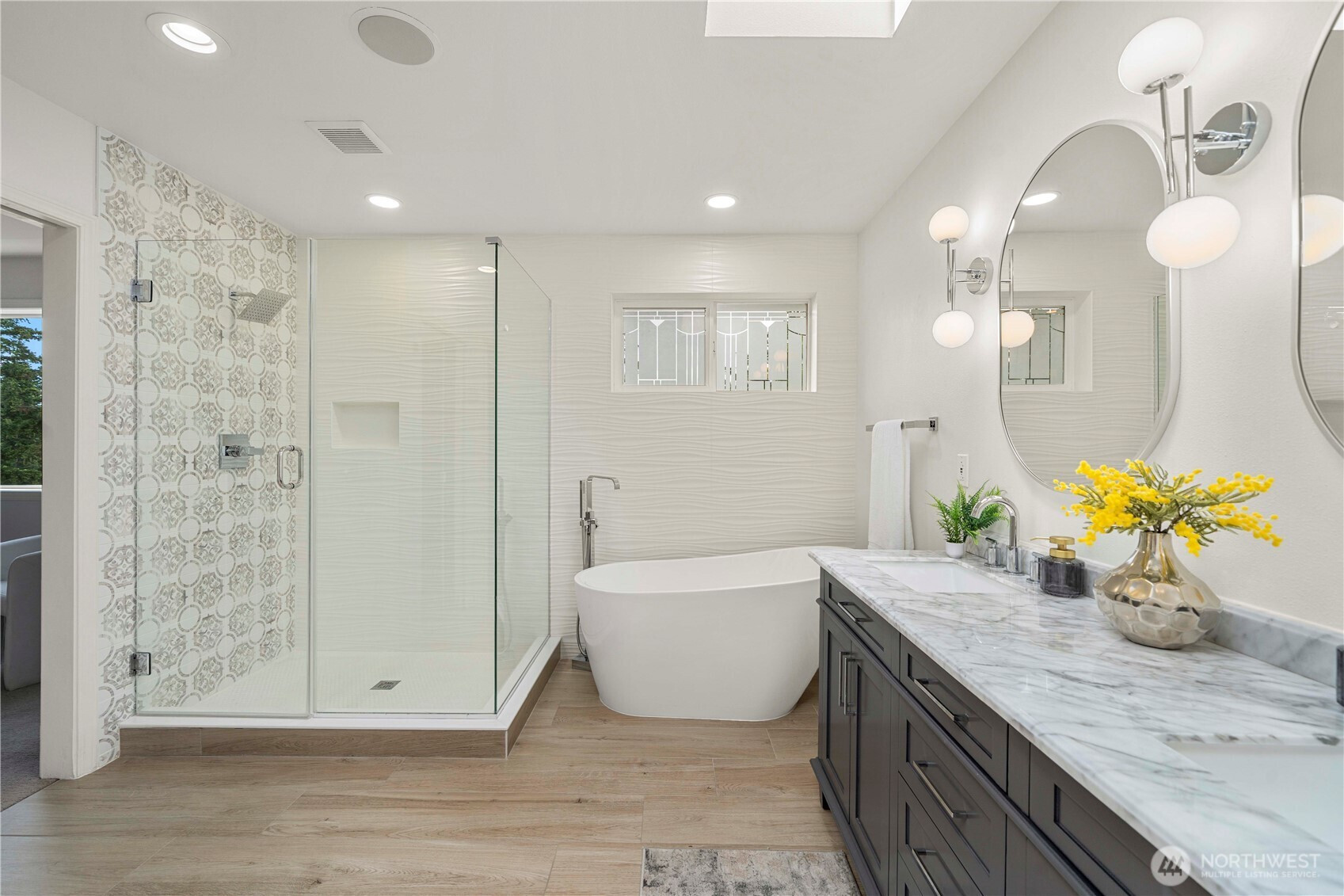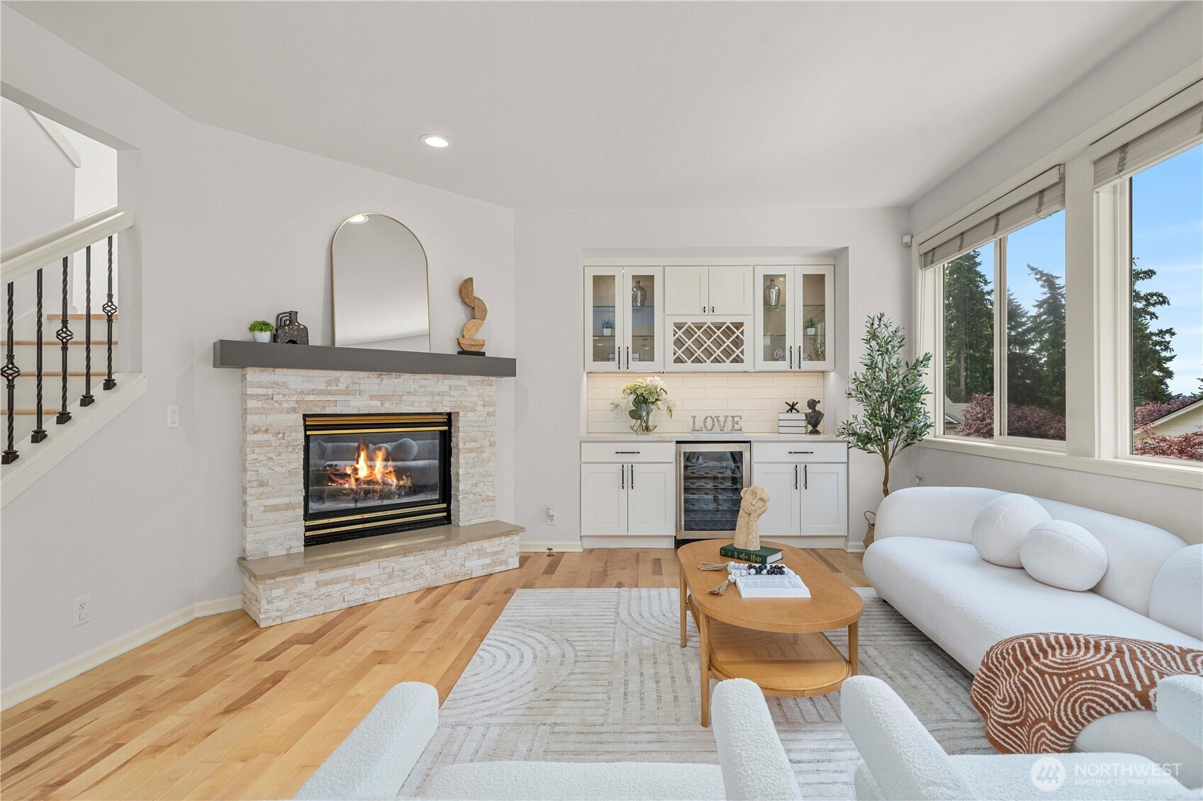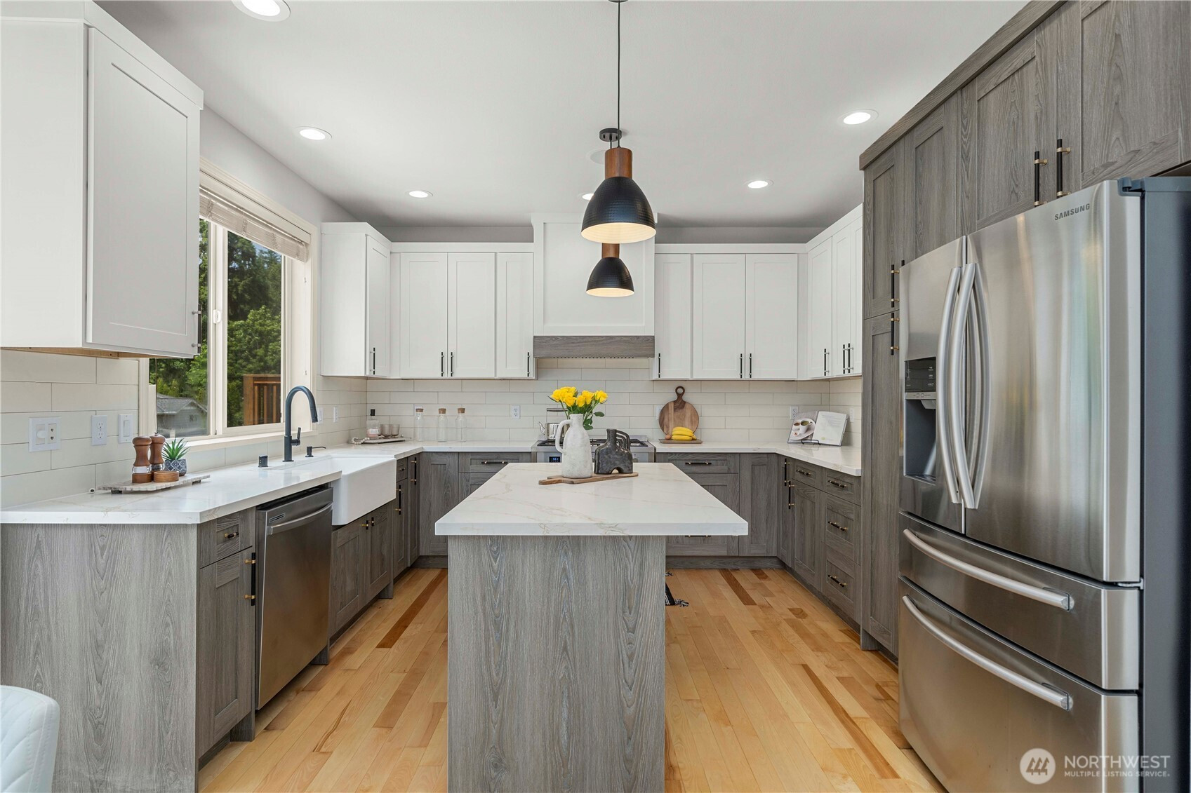 Beautifully updated in 2023 and truly move-in ready, this sun-drenched 3,500+ sqft residence is thoughtfully designed, offering refined comfort and exceptional functionality. The chef’s kitchen is a statement space, featuring premium quartz countertops, custom cabinetry, designer tilework, and stainless steel appliances. The vaulted primary suite serves as a private retreat, complete with a spa-inspired five-piece bath. A dedicated main-level den, three additional bedrooms upstairs, and multiple gathering areas provide flexibility for multigenerational living, work-from-home needs, or extended hosting. The daylight lower level showcases a media lounge, a bedroom, a private sauna, a large covered outdoor patio, and a fully appointed MIL suite —ideal for guests, or income potential. Central A/C ensures year-round comfort. Pre-inspected for buyer confidence. Ideally positioned minutes from waterfront parks, shopping, and easy access to Bellevue and Seattle, this residence represents a compelling lifestyle opportunity in one of Kirkland’s most sought-after communities.