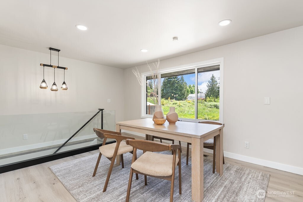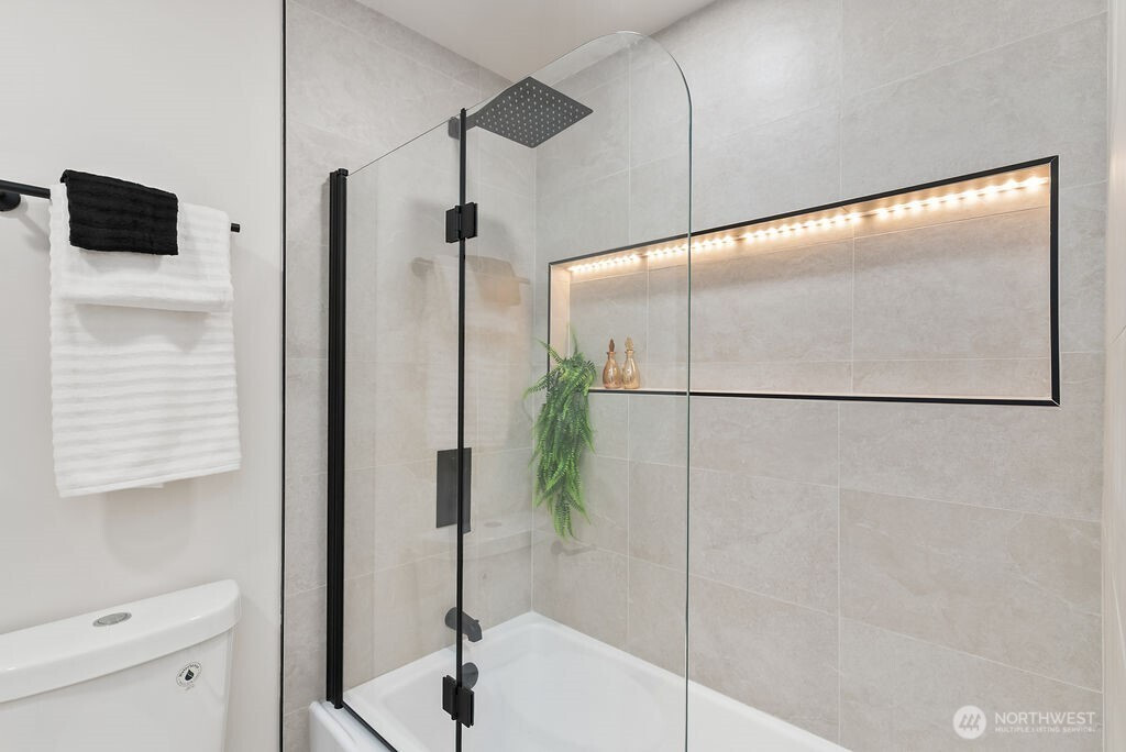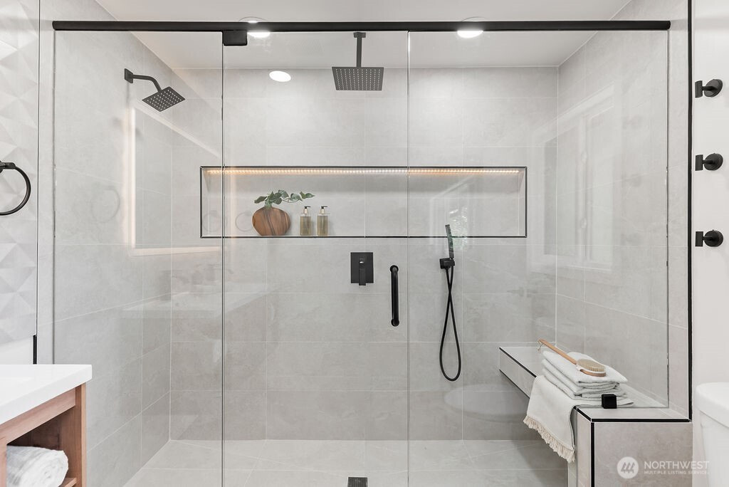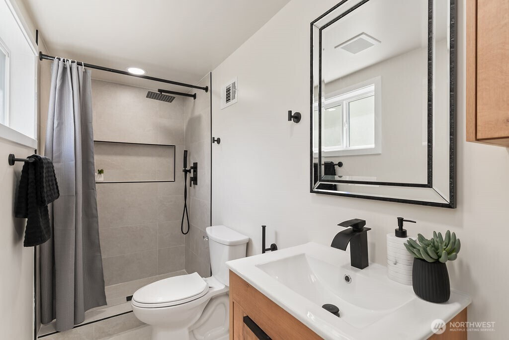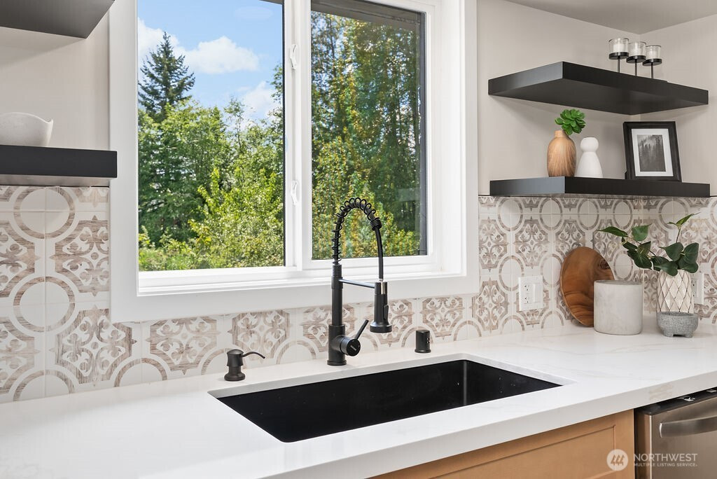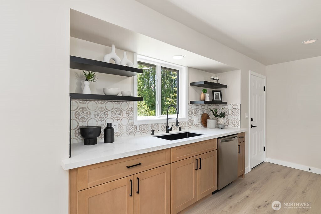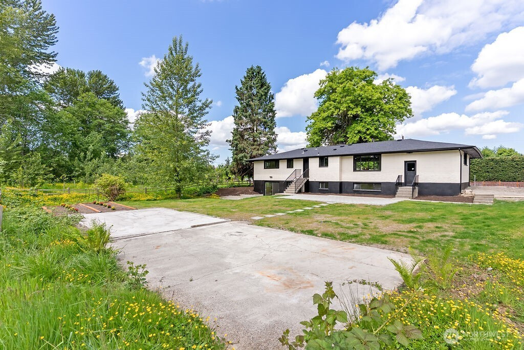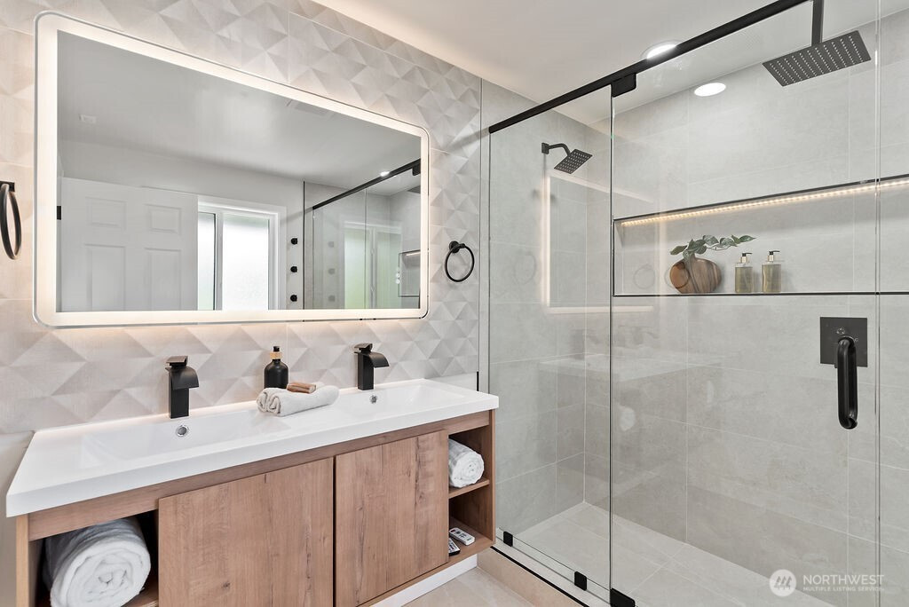 Thoughtfully remodeled 5BD/2.5BA home with daylight basement on a quiet street,backing to a greenbelt.Featuring a brand-new kitchen with soft-close cabinetry,floating shelves,XL island with additional storage&eating area.Custom glass railings add a modern touch to the open living space.Bathrooms throughout the home showcase floating vanities,LED mirrors,custom tilework with niches, and h floors. The primary suite offers a spa-like retreat with an oversized LED-lit shower,double vanities, and tile underfoot. The daylight basement is fully finished with a spacious family room,2 additional bedrooms, full bath, laundry with new washer & dryer, large storage & patio access. New roof & furnace, new sewer connection.Large backyard & ample parking!
