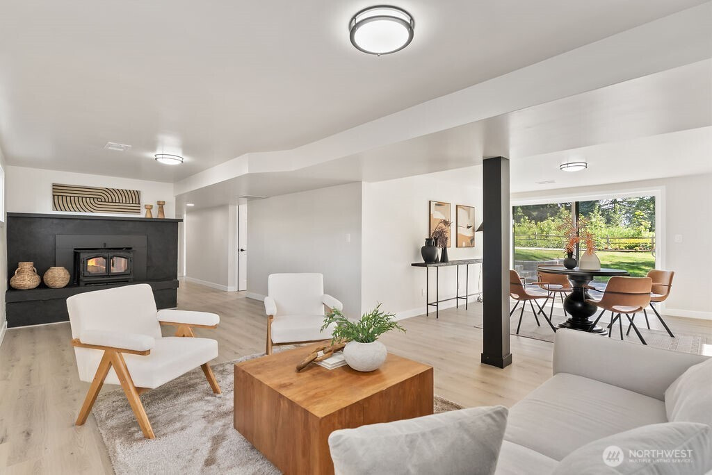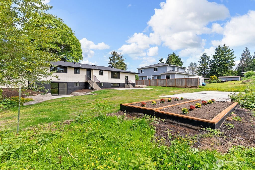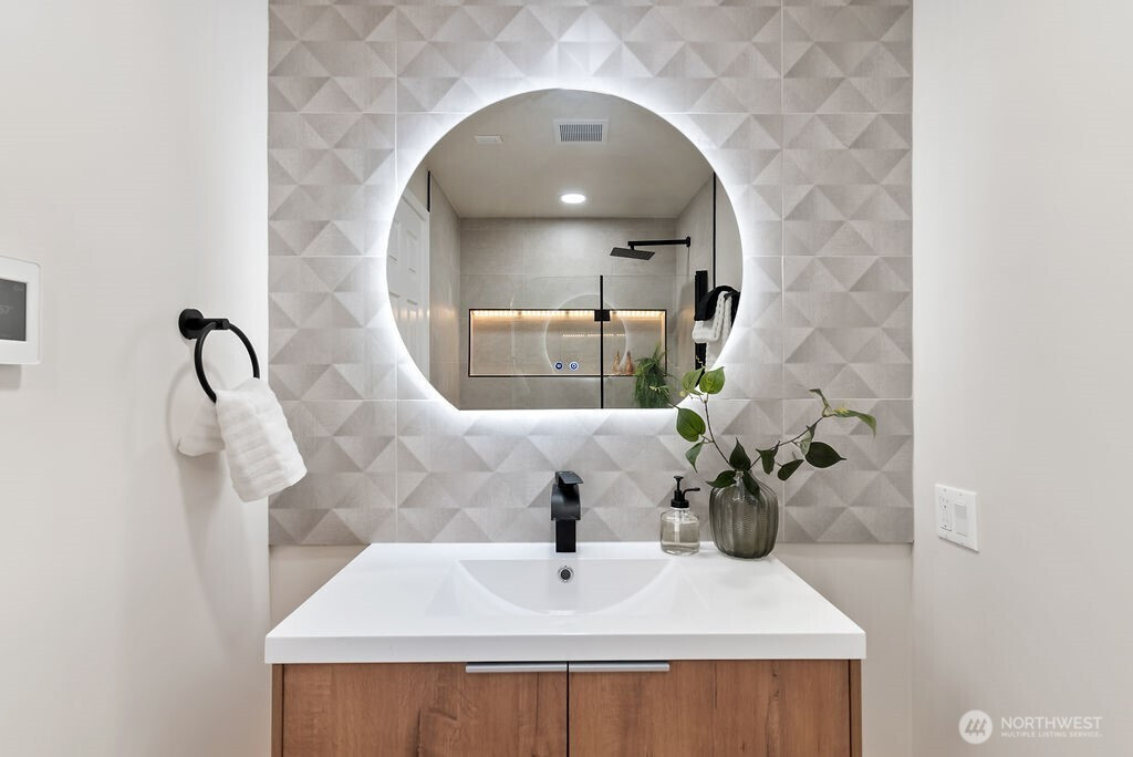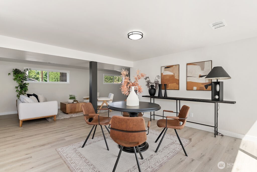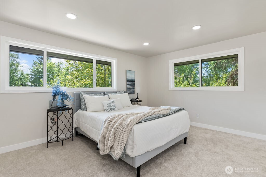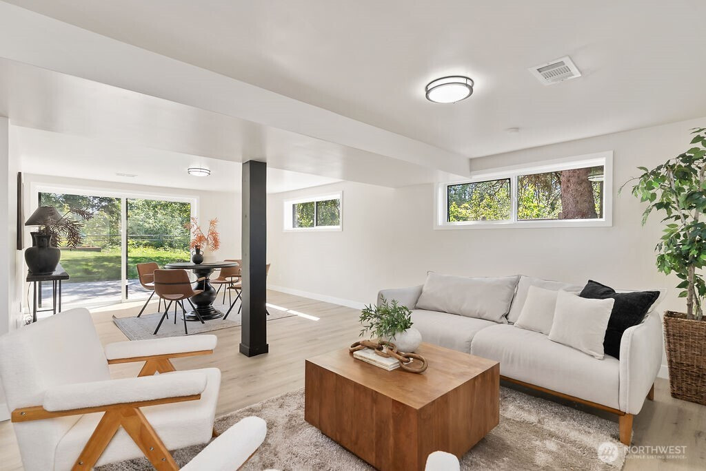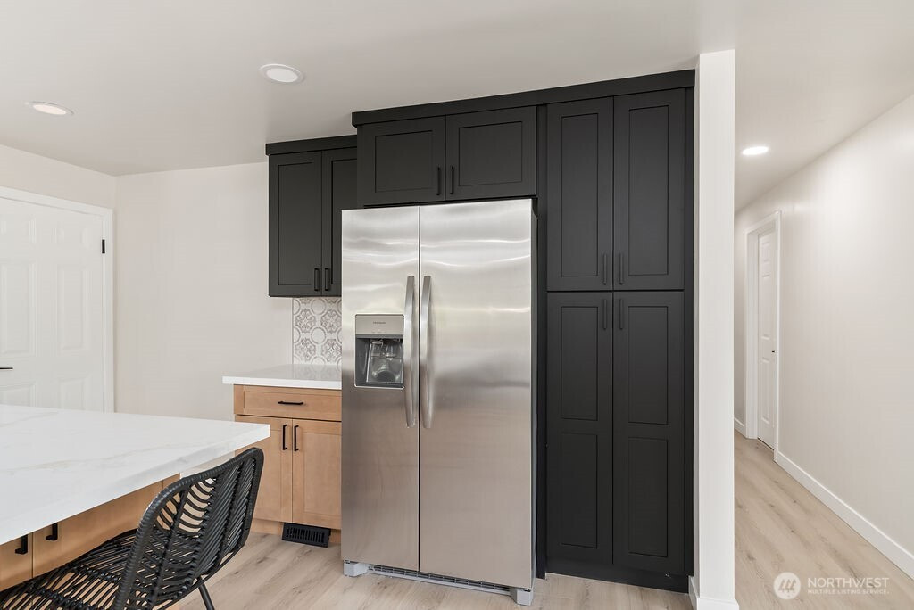 Thoughtfully remodeled 5BD/2.5BA home with daylight basement on a quiet street,backing to a greenbelt.Featuring a brand-new kitchen with soft-close cabinetry,floating shelves,XL island with additional storage&eating area.Custom glass railings add a modern touch to the open living space.Bathrooms throughout the home showcase floating vanities,LED mirrors,custom tilework with niches, and h floors. The primary suite offers a spa-like retreat with an oversized LED-lit shower,double vanities, and tile underfoot. The daylight basement is fully finished with a spacious family room,2 additional bedrooms, full bath, laundry with new washer & dryer, large storage & patio access. New roof & furnace, new sewer connection.Large backyard & ample parking!
