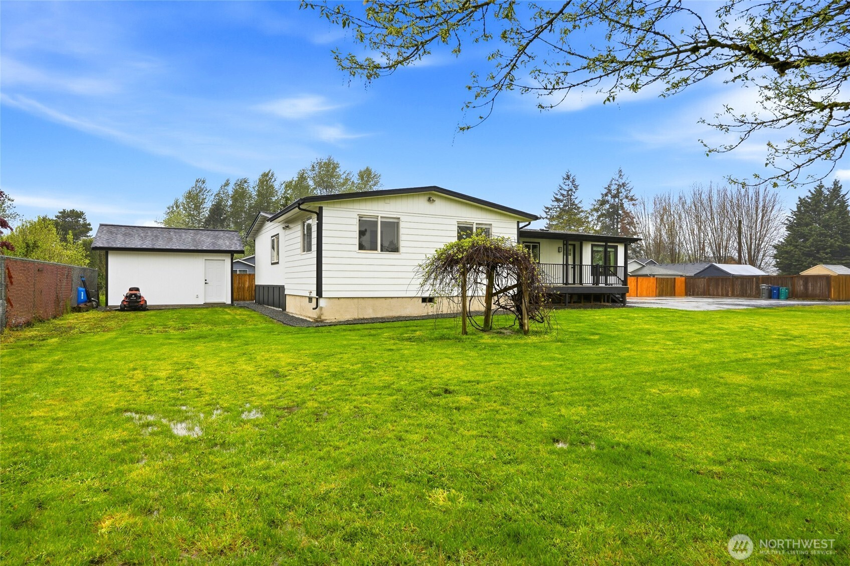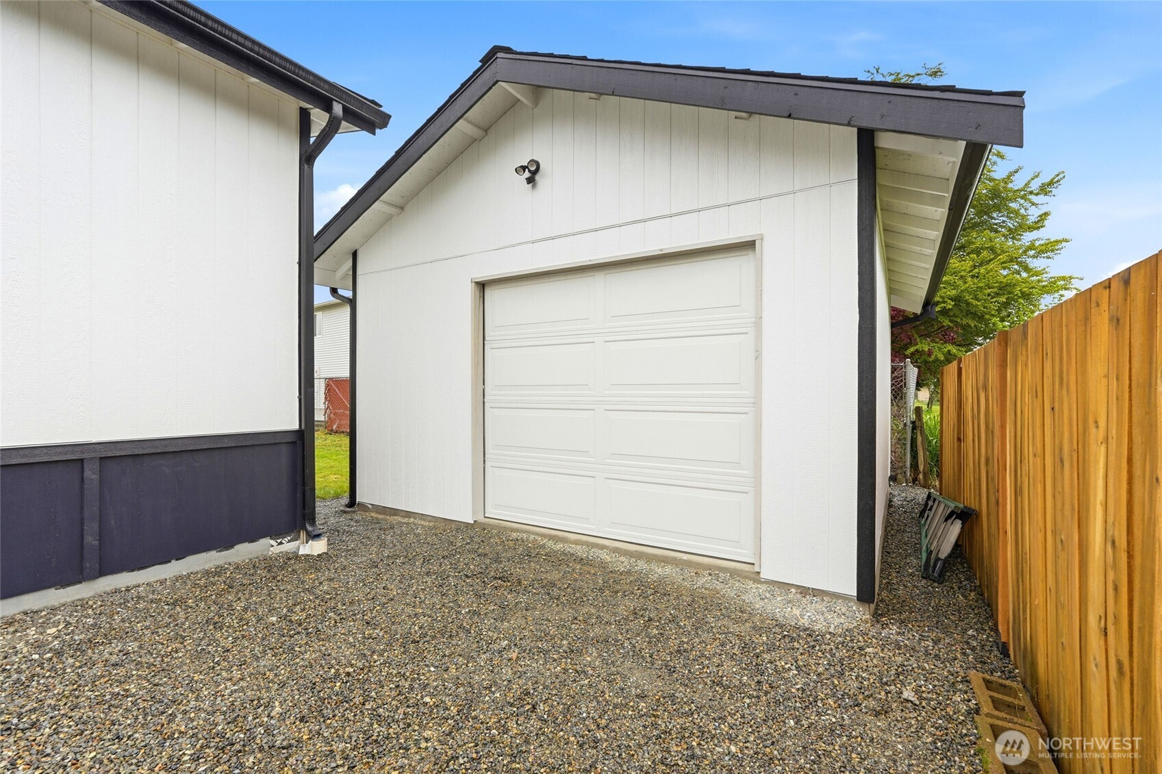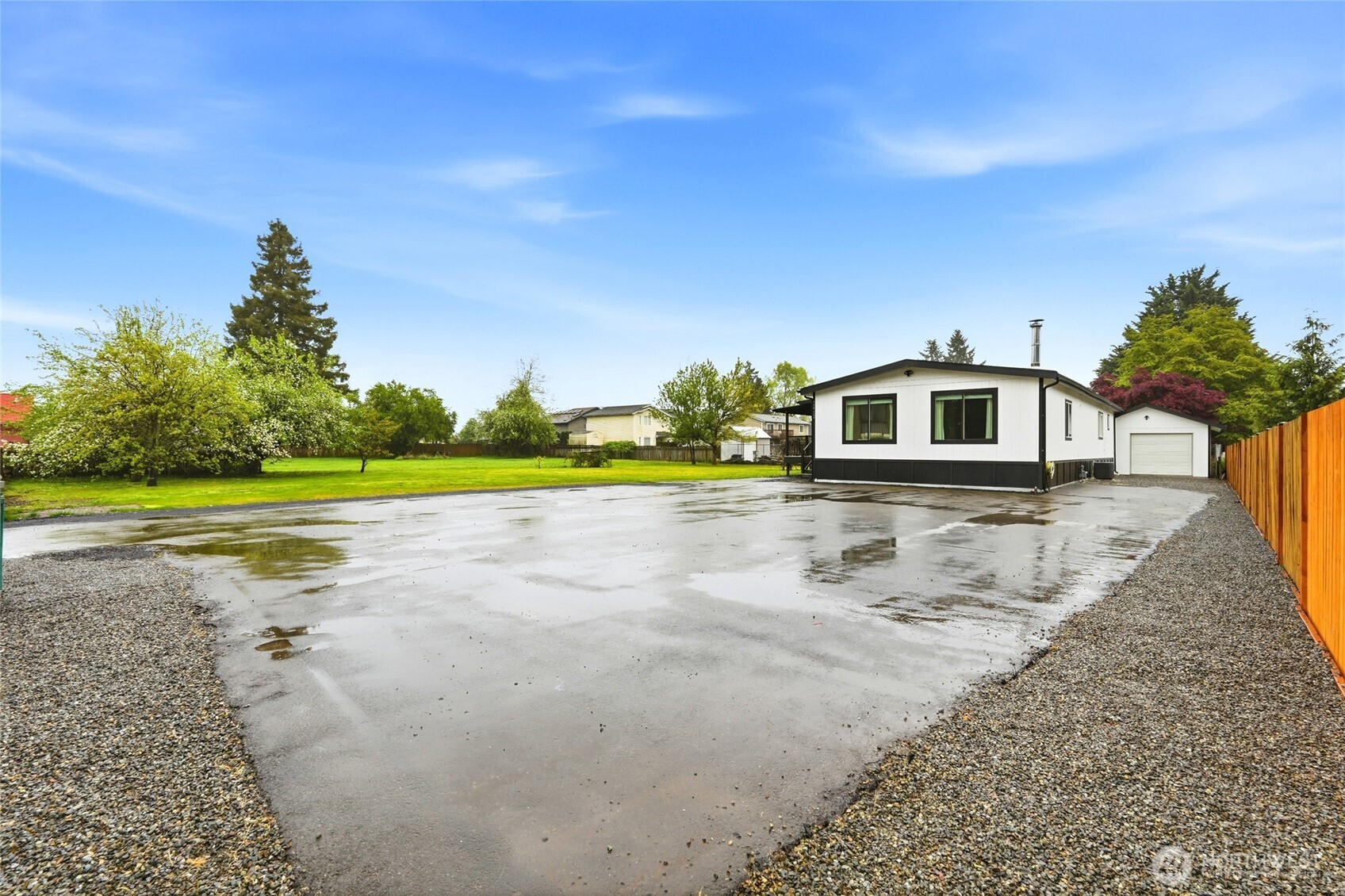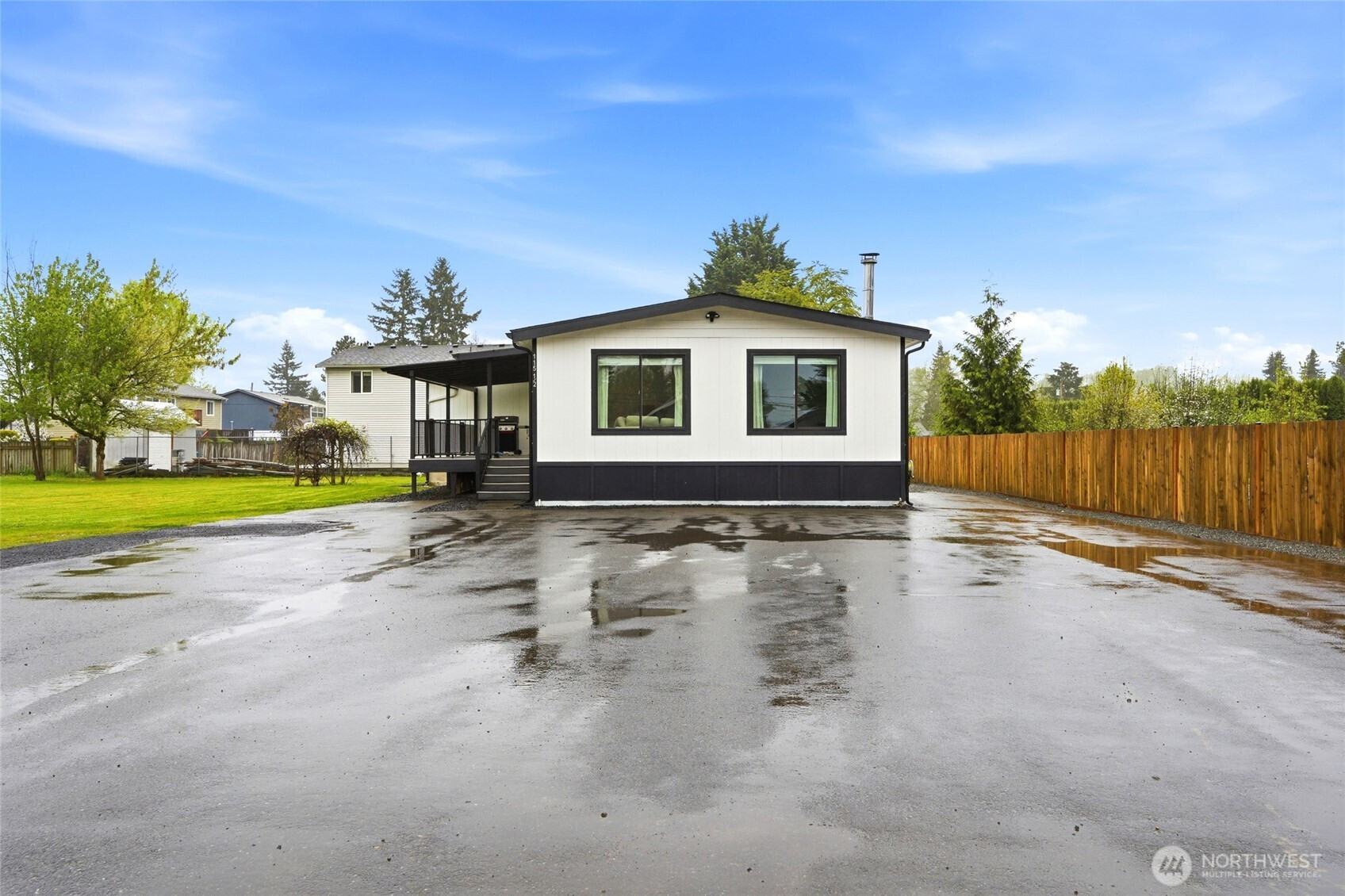 Beautifully remodeled manufactured home offering 3 bedrooms plus bonus/office room with 2.5 bath, designed for flexible living. The high-end remodel shines with updated cabinetry, a large kitchen island and a cozy wood fireplace that anchors the main living space. Custom built-in closets add both style and function. Situated on a large, oversized lot with a mix of private and shared driveway access. The property includes a detached garage for extra storage or workspace. Enjoy outdoor living year-round on the covered back patio with durable Trex decking. Conveniently located near everyday amenities, this home blends modern updates with practical living in a great setting.