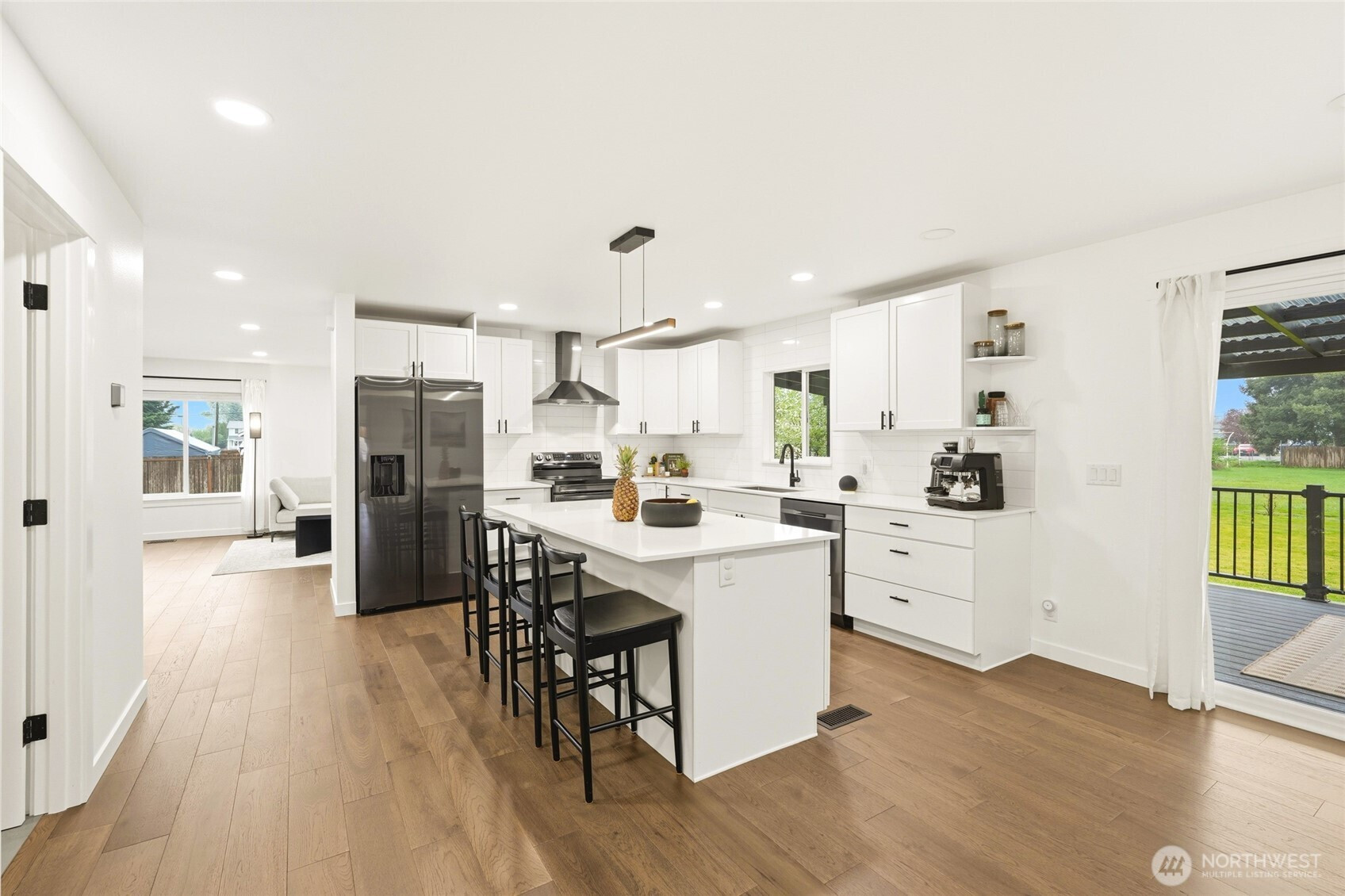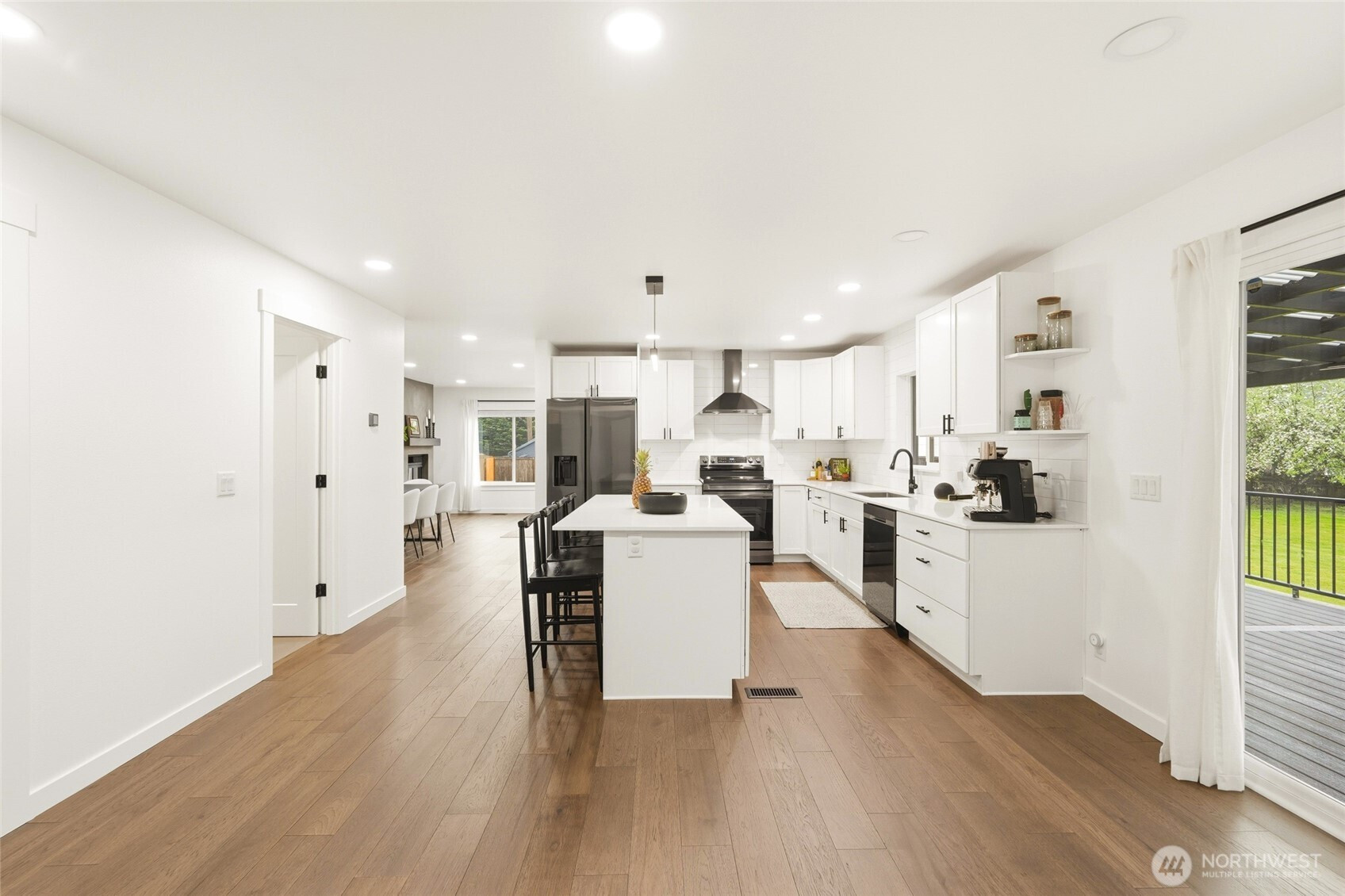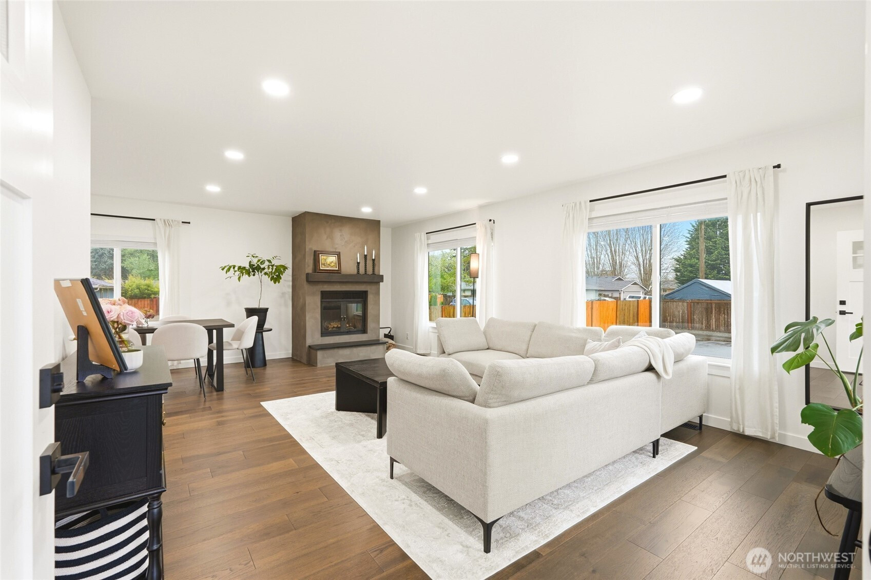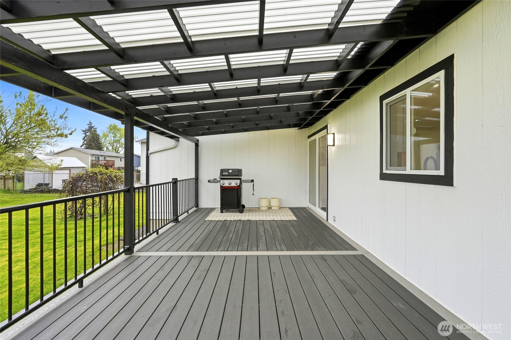 Beautifully remodeled manufactured home offering 3 bedrooms plus bonus/office room with 2.5 bath, designed for flexible living. The high-end remodel shines with updated cabinetry, a large kitchen island and a cozy wood fireplace that anchors the main living space. Custom built-in closets add both style and function. Situated on a large, oversized lot with a mix of private and shared driveway access. The property includes a detached garage for extra storage or workspace. Enjoy outdoor living year-round on the covered back patio with durable Trex decking. Conveniently located near everyday amenities, this home blends modern updates with practical living in a great setting.