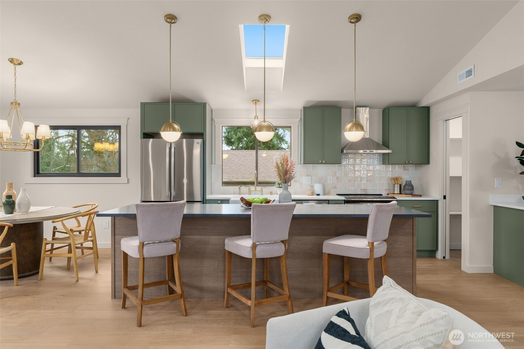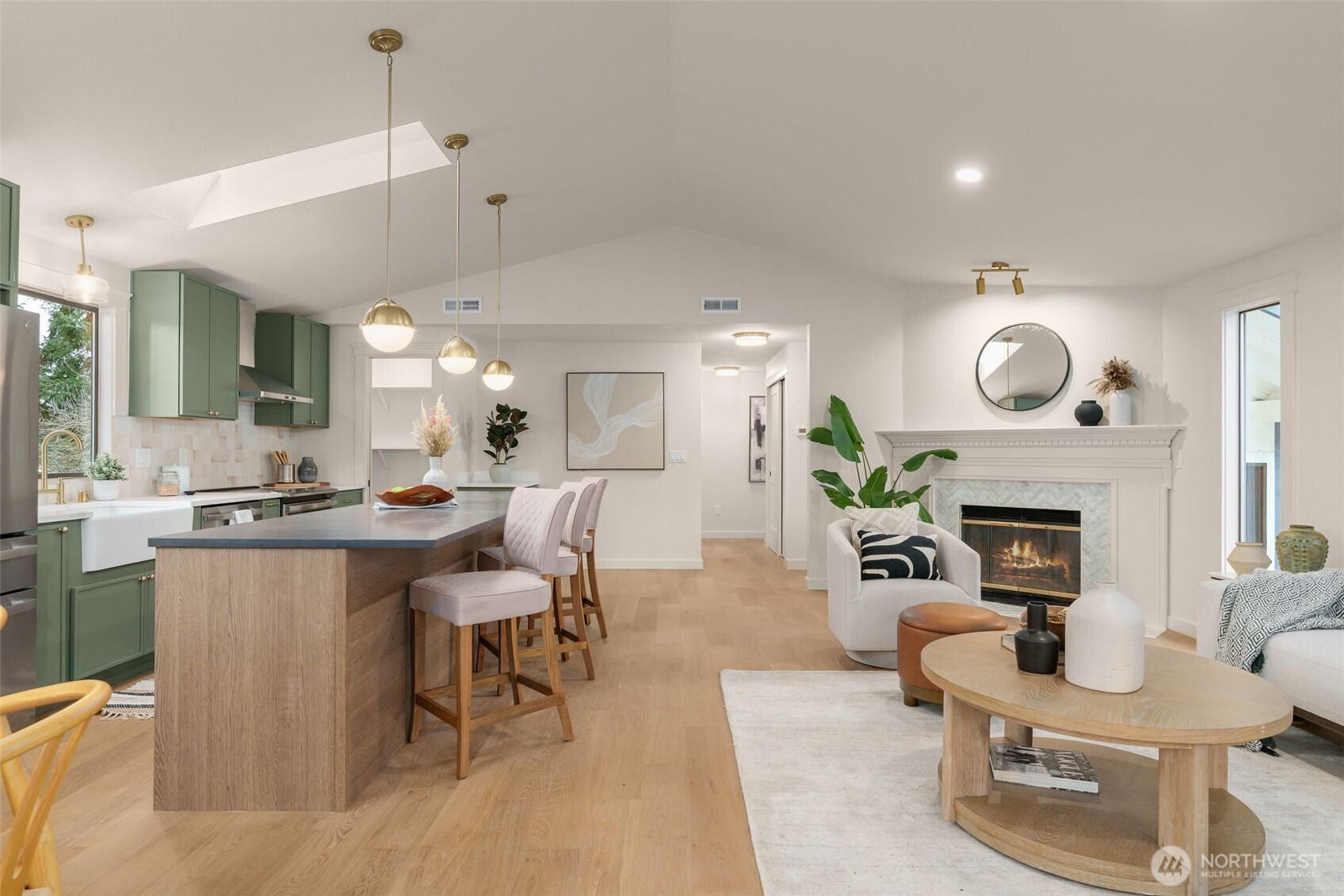 Tastefully remodeled in the heart of Matthews Beach, this turnkey 4-bed, 2-bathroom home lives bright, open, and effortlessly inviting. The upper level showcases a stunning open-concept kitchen, dining, and living room designed for both everyday living and entertaining. A generous eat-in island anchors the space, while vaulted ceilings and expansive picture windows flood the home with natural light throughout the day. Guests can gather in the kitchen and relax around the fireplace as meals and conversation unfold. All-new appliances, a walk-in pantry, and stylish finishes complement the airy layout, creating a true hub of the home. New engineered hardwood floors, fresh interior and exterior updates, plus beautifully remodeled bathrooms elevate the home throughout. Step through the gate to a fully fenced, grassy backyard ideal for sunny afternoons and evenings unwinding by the fire. Tucked away is a spacious, versatile work shed offering ample room for storage, hobbies, or creative pursuits. Major system upgrades include a new roof, new furnace and heat pump, new plumbing and electrical fixtures, and new garage doors—offering peace of mind for years to come. Ideally located just minutes to Matthews Beach Park, Magnuson Park, and the Burke-Gilman Trail, with easy access to transit, neighborhood cafés, and top-rated schools. A rare opportunity to own a truly move-in-ready home in one of North Seattle’s most desirable neighborhoods.