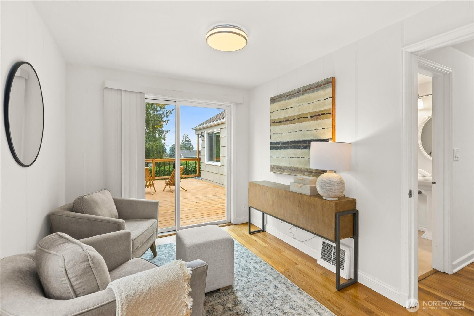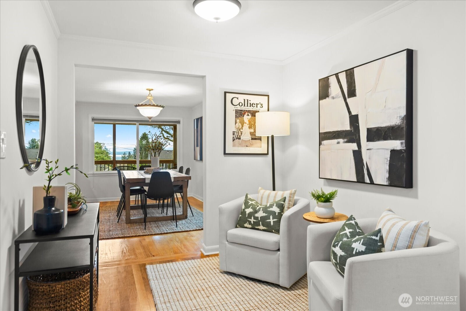 Charming & undeniably special! Fall in love with this light-filled Cape Cod home nestled on a quiet Broadview street, w/scenic Puget Sound & Olympic Mountain views. HW floors flow throughout the main level, where you'll find a spacious primary bedroom, large formal dining & an expansive kitchen w/breakfast nook. Step outside to the covered patio & entertainment-sized deck, perfect for evening dinners & soaking in stunning sunsets. Upper level features two generously sized bedrooms, along with attic/storage space. The lower level offers tremendous flexibility, including a family room or additional office space, plus a fully self-contained MIL suite w/separate entrance, full bath & W/D - ideal for extended family or potential rental income. Attached exterior storage space completes the package. Big-ticket items complete - including new windows (2023), new roof (2025), updated water heater, fresh interior paint, and new upper-level carpet. Large lot w/gated alley access and abundant off-street parking. Conveniently located near Carkeek Park's trails & beach, multiple restaurants, coffee shops, the Broadview Tap House & more. A rare blend of character, views, and versatility. Pre-inspected