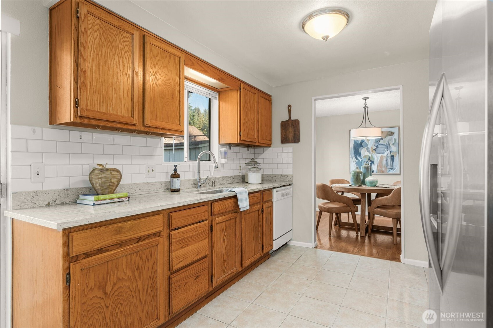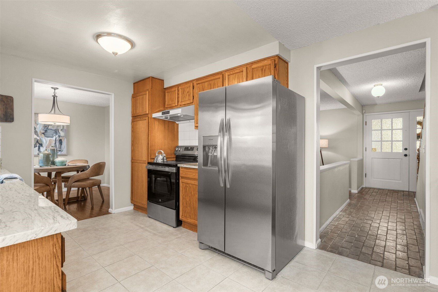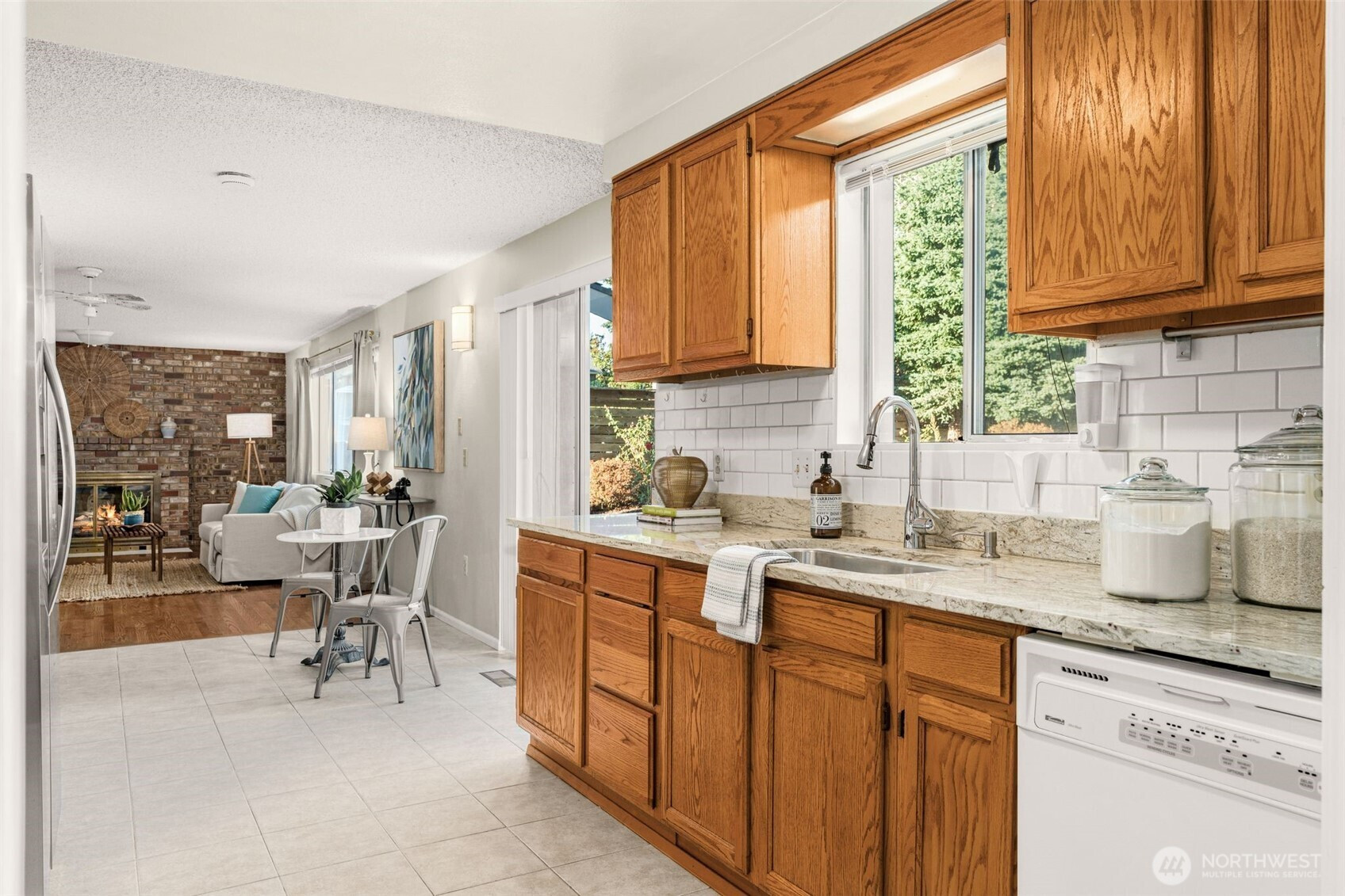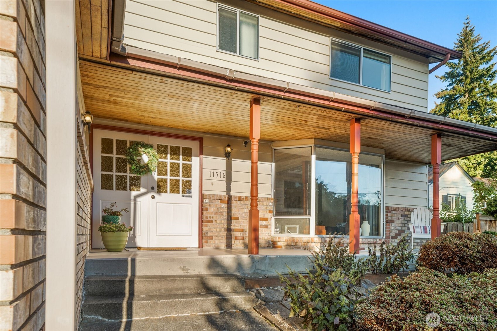 Two-story Traditional in excellent NE Seattle location. Greeted by a covered front porch & a double door entry, this home offers a fantastic floorplan w hardwoods on the main. Brick entry hallway opens to living rm w bench seat overlooking the yard. Kitchen recently refreshed with tile floor, quartz counter tops & new stove & fridge. Generous dining room plus a wonderful family room off the kitchen has wood-burning fireplace with handsome brick surround, convenient half bath, laundry room, access to the garage, and slider leading out to backyard. Coveted floorplan with 3 Bedrooms +2 Baths upstairs, including Primary Suite with lg closet & attached ensuite bath! Good sized fenced backyard. Oversized 2-car Garage. Move right in and enjoy!