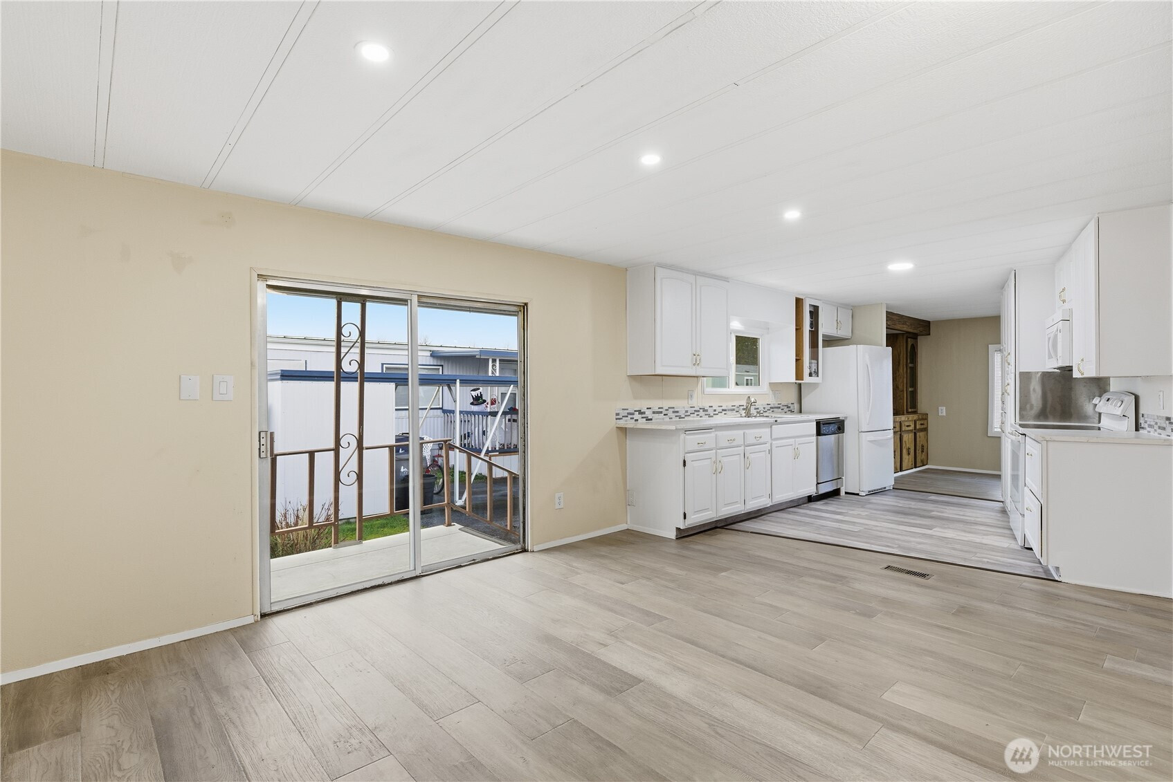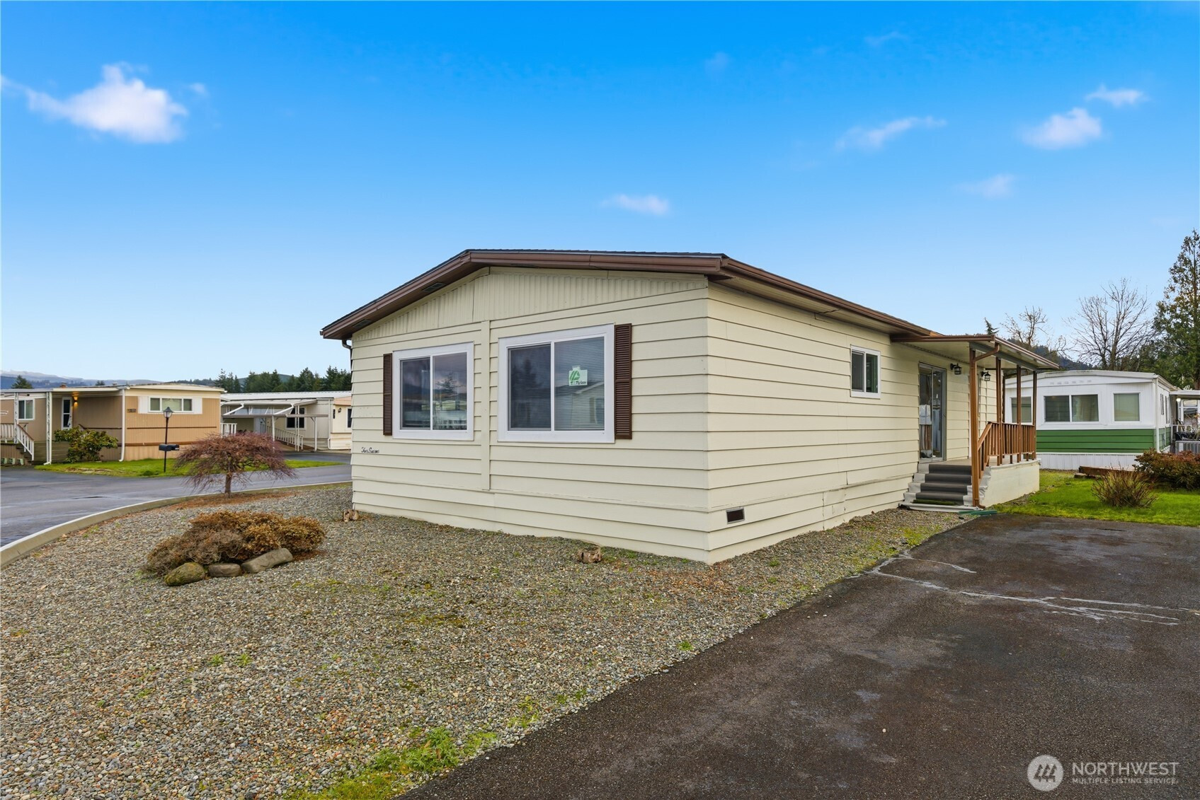 Situated in the desirable Mountain Villa Estates 55+ community, this updated 2-bedroom, 2-bath home offers peaceful mountain views with quick access to Enumclaw’s shopping, dining, and daily conveniences. The 1,152 sq ft open layout features laminate flooring, fresh interior paint, updated cabinetry, modern lighting with LED fixtures, and a smart thermostat for added efficiency. The kitchen has been refreshed and includes all appliances, while both bathrooms feature tiled walk-in showers. Energy-efficient windows with mesh screens and new porch carpet complete the updates. Enjoy comfortable, low-maintenance living in a scenic setting just minutes from town.