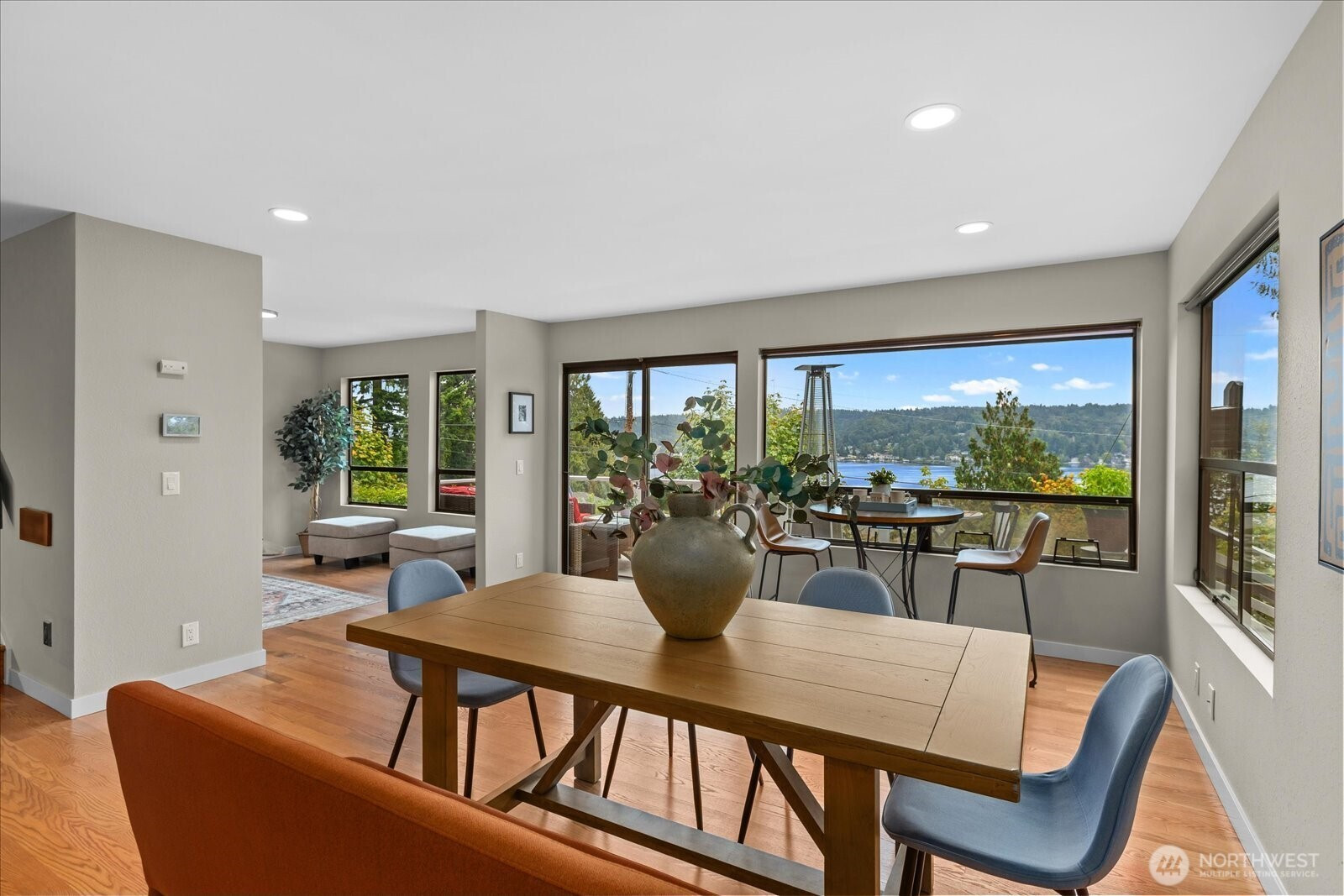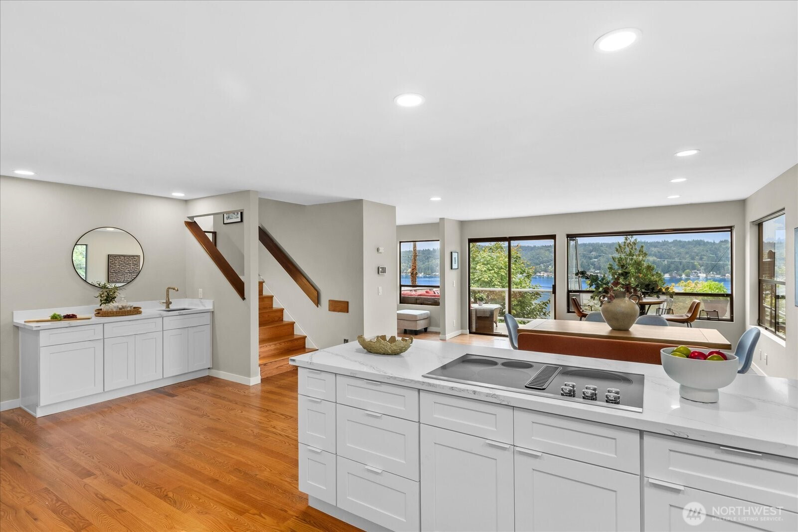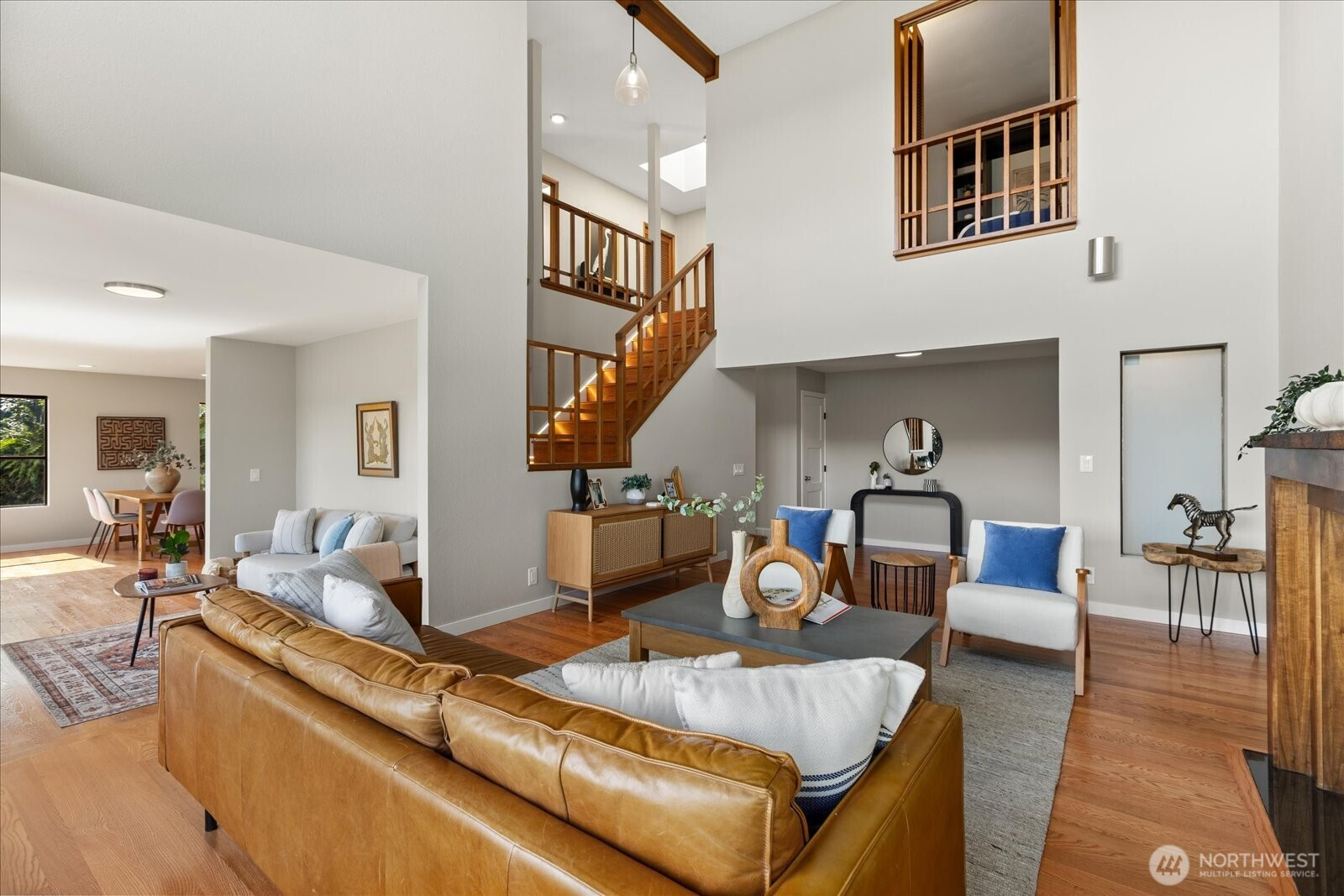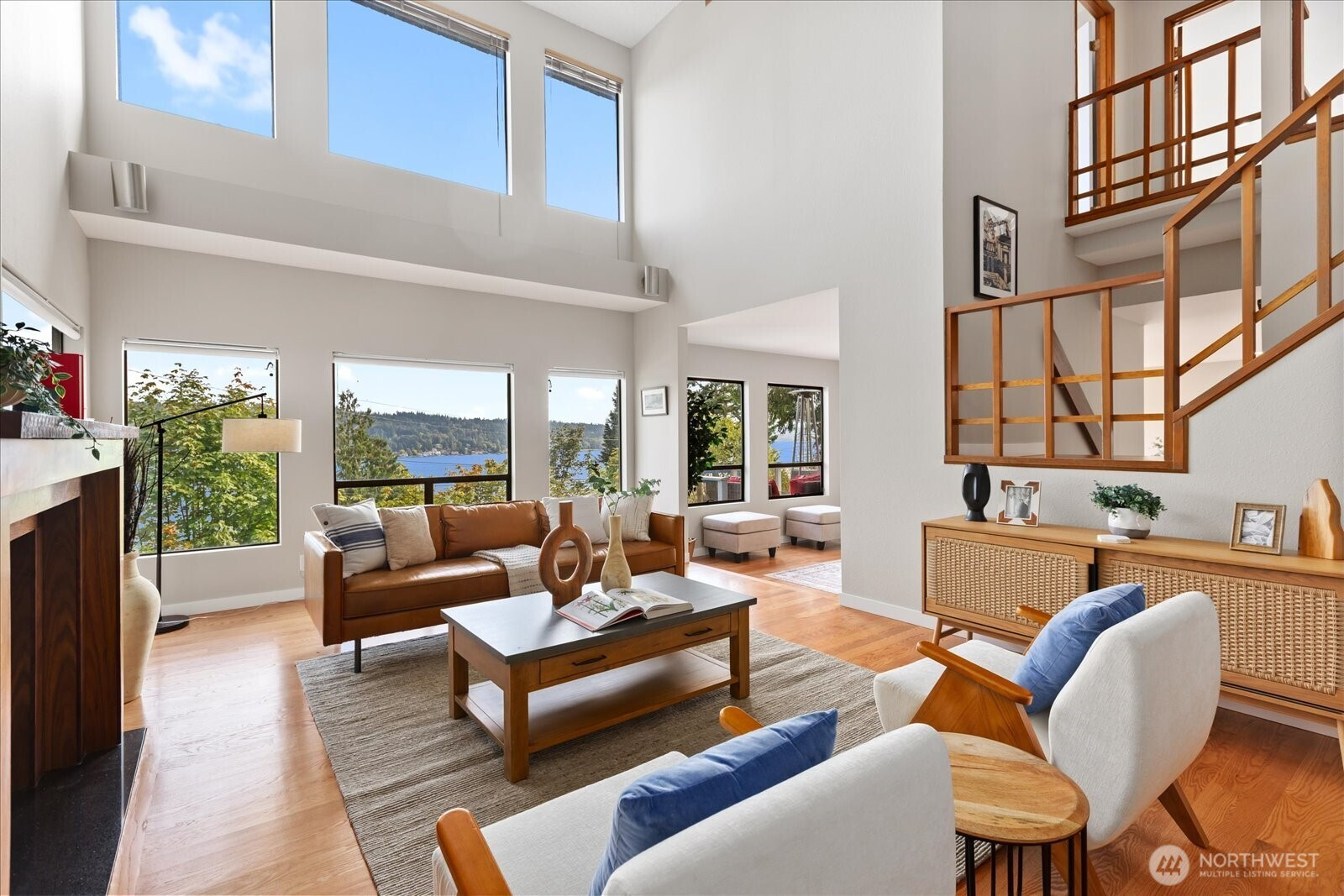 Stunning Lake Washington views from nearly every corner of this beautifully updated home! The main floor boasts a grand formal living room with soaring 20-foot ceilings, a formal dining room, great room with wet bar, and newly remodeled chef’s kitchen with quartz countertops, new cabinetry, & stainless steel appliances—ideal for both casual meals and gourmet entertaining. Gleaming hardwood floors flow throughout the main level, while oversized windows fill the home with natural light, creating warm spaces. Open staircase leads to the upper level with coveted three bedrooms, including a luxurious primary suite with Mt Rainier Views. Lower level features a spacious rec room, additional bedroom and full bath, and an oversized two-car garage.