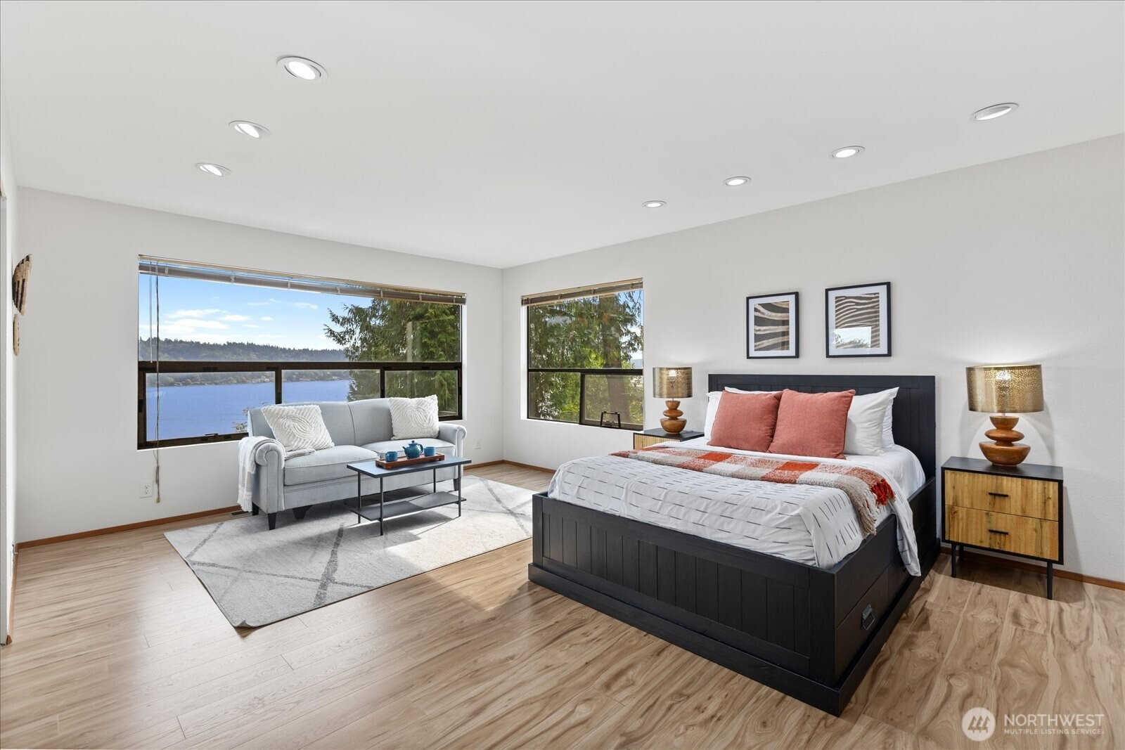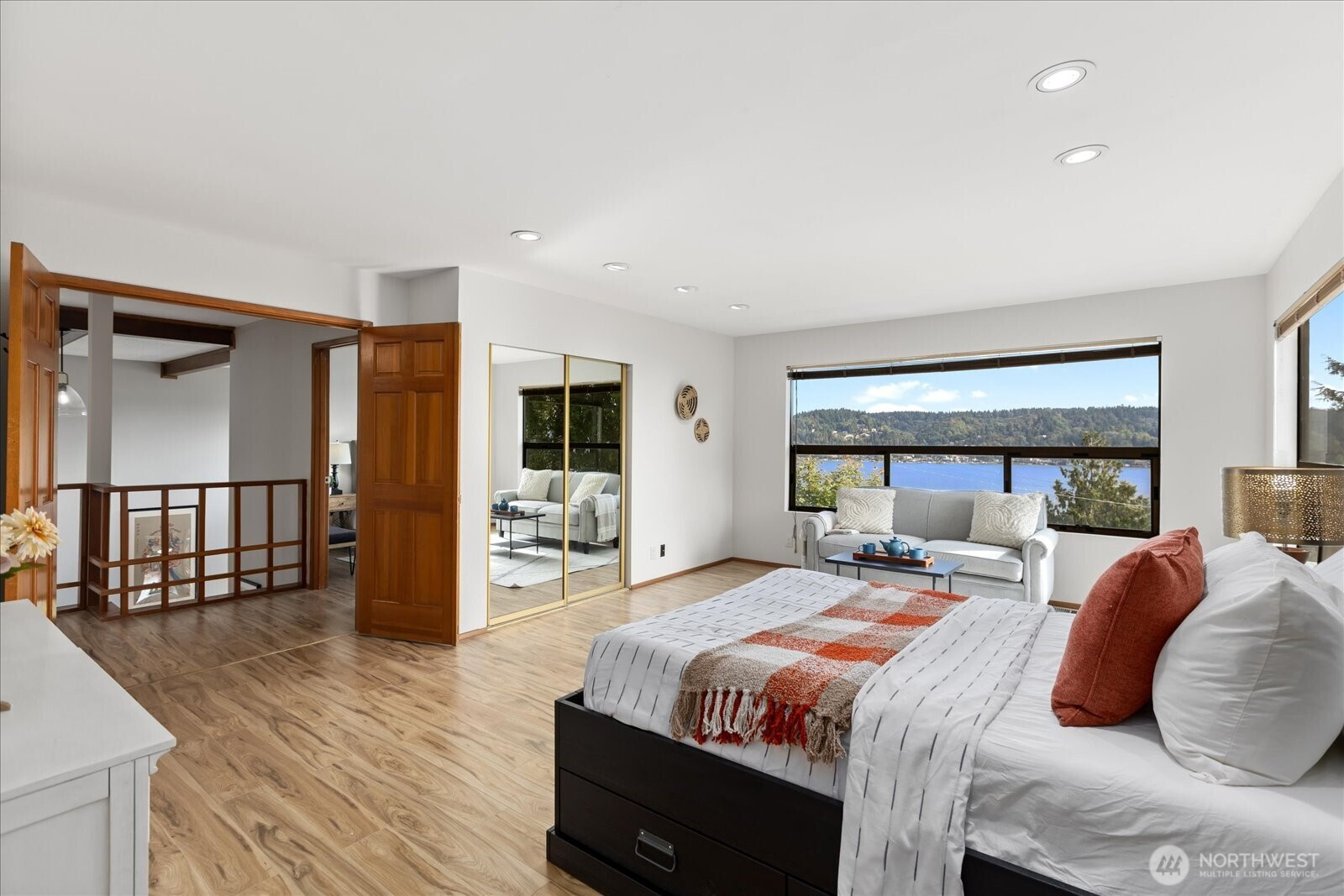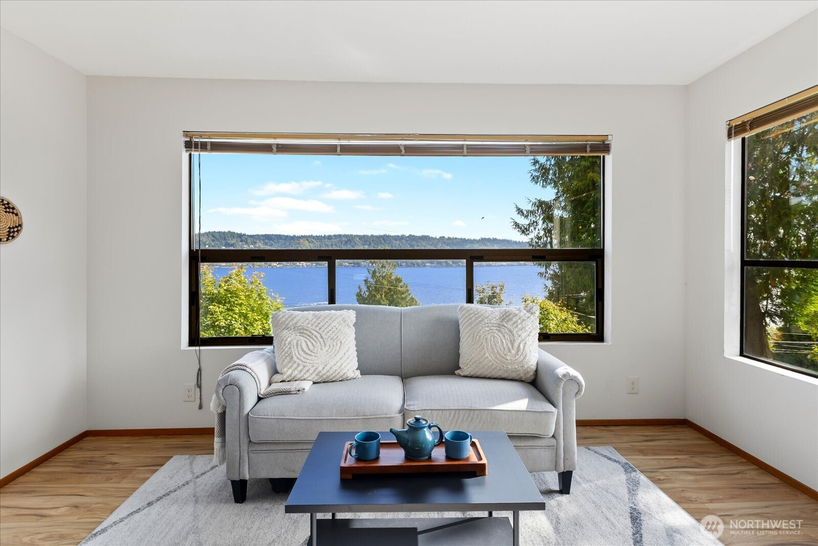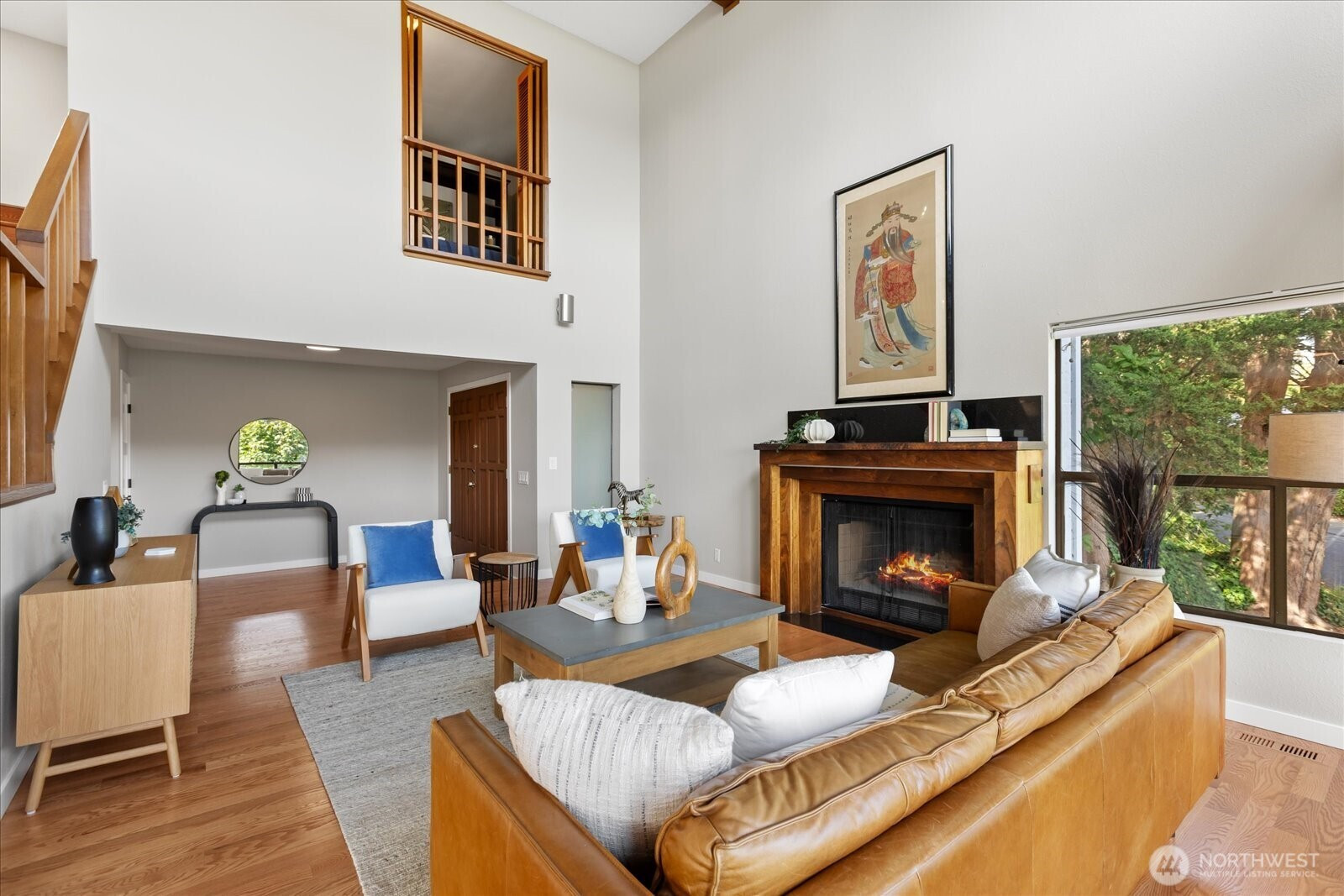 Stunning Lake Washington views from nearly every corner of this beautifully updated home! The main floor boasts a grand formal living room with soaring 20-foot ceilings, a formal dining room, great room with wet bar, and newly remodeled chef’s kitchen with quartz countertops, new cabinetry, & stainless steel appliances—ideal for both casual meals and gourmet entertaining. Gleaming hardwood floors flow throughout the main level, while oversized windows fill the home with natural light, creating warm spaces. Open staircase leads to the upper level with coveted three bedrooms, including a luxurious primary suite with Mt Rainier Views. Lower level features a spacious rec room, additional bedroom and full bath, and an oversized two-car garage.