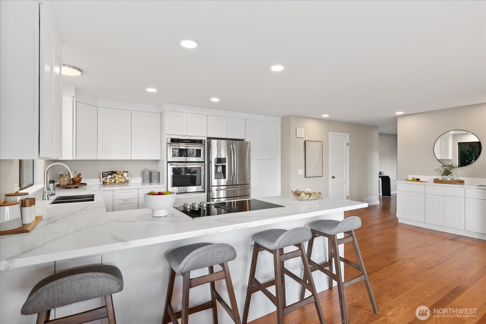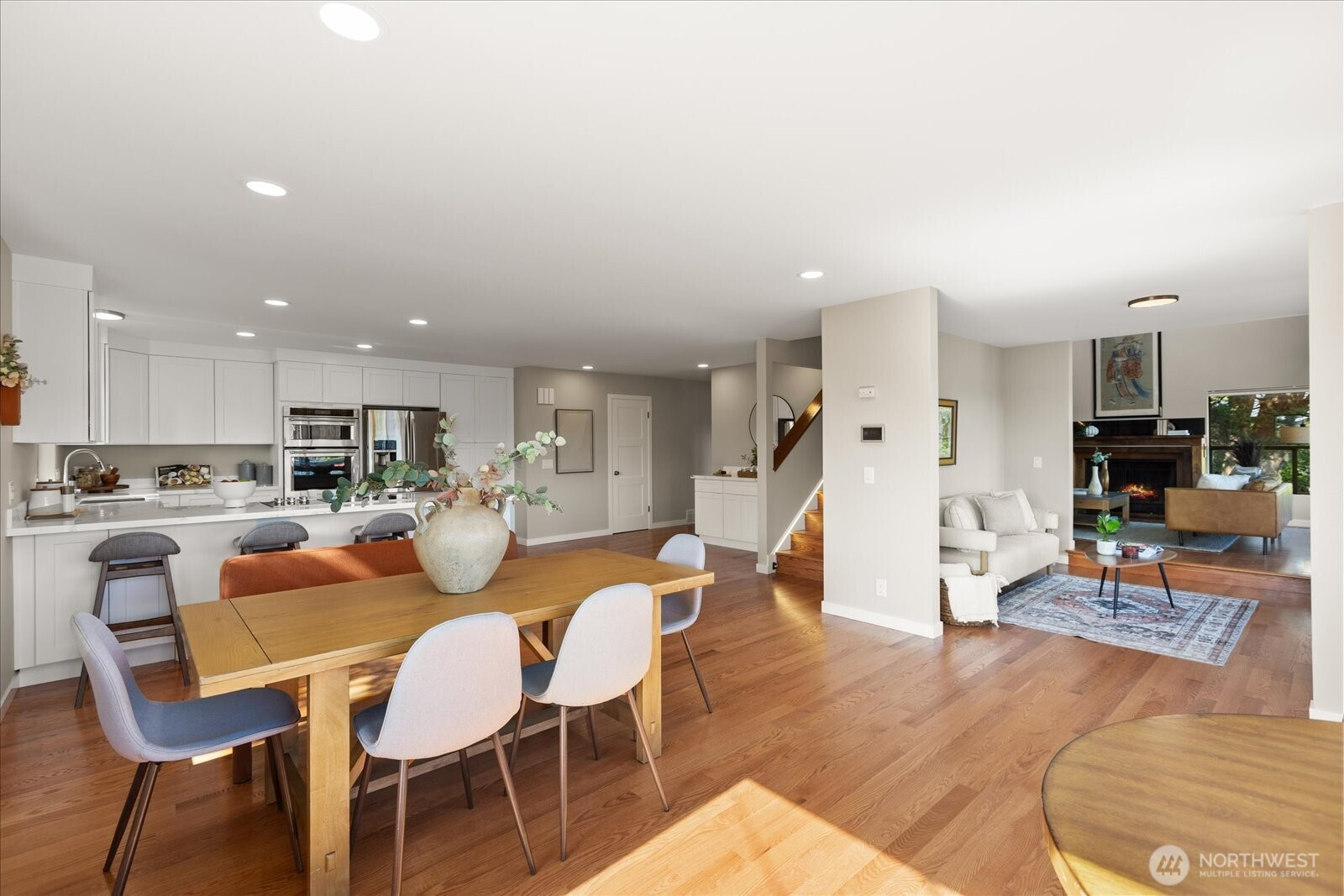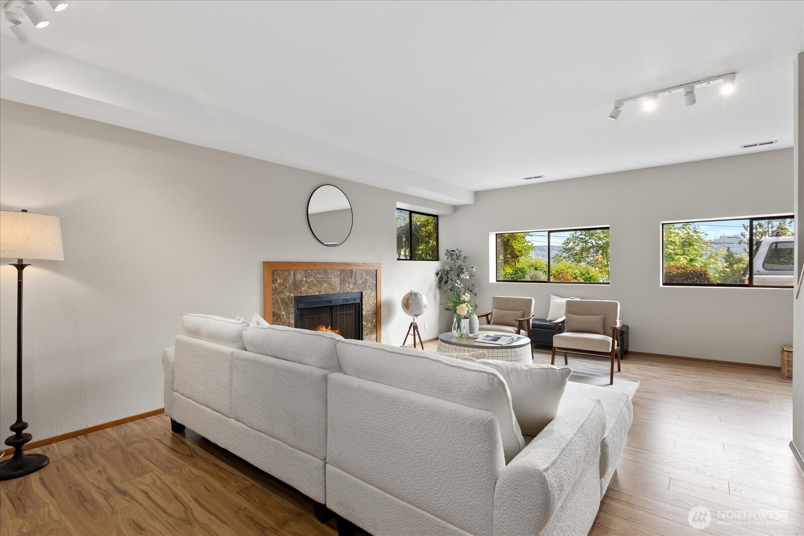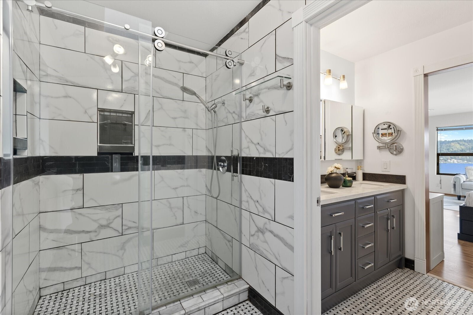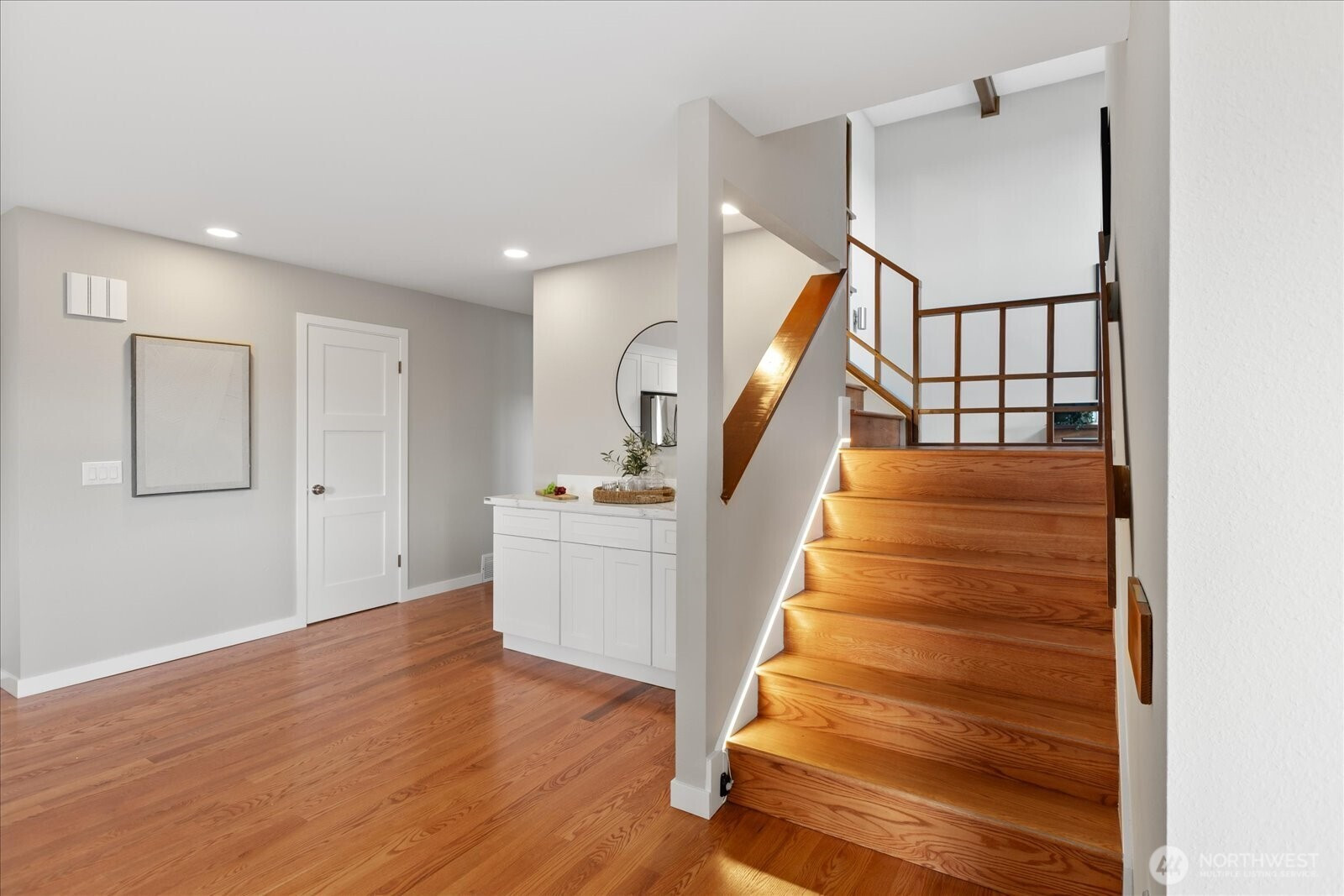 Stunning Lake Washington views from nearly every corner of this beautifully updated home! The main floor boasts a grand formal living room with soaring 20-foot ceilings, a formal dining room, great room with wet bar, and newly remodeled chef’s kitchen with quartz countertops, new cabinetry, & stainless steel appliances—ideal for both casual meals and gourmet entertaining. Gleaming hardwood floors flow throughout the main level, while oversized windows fill the home with natural light, creating warm spaces. Open staircase leads to the upper level with coveted three bedrooms, including a luxurious primary suite with Mt Rainier Views. Lower level features a spacious rec room, additional bedroom and full bath, and an oversized two-car garage.