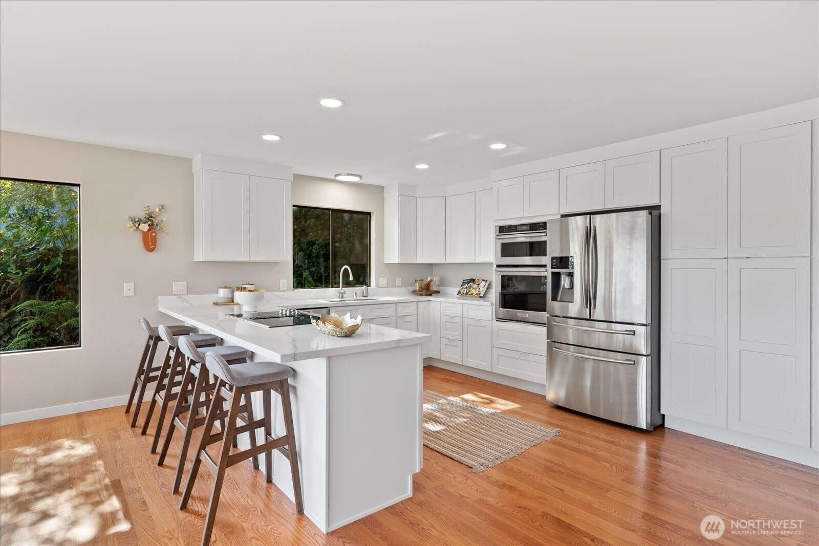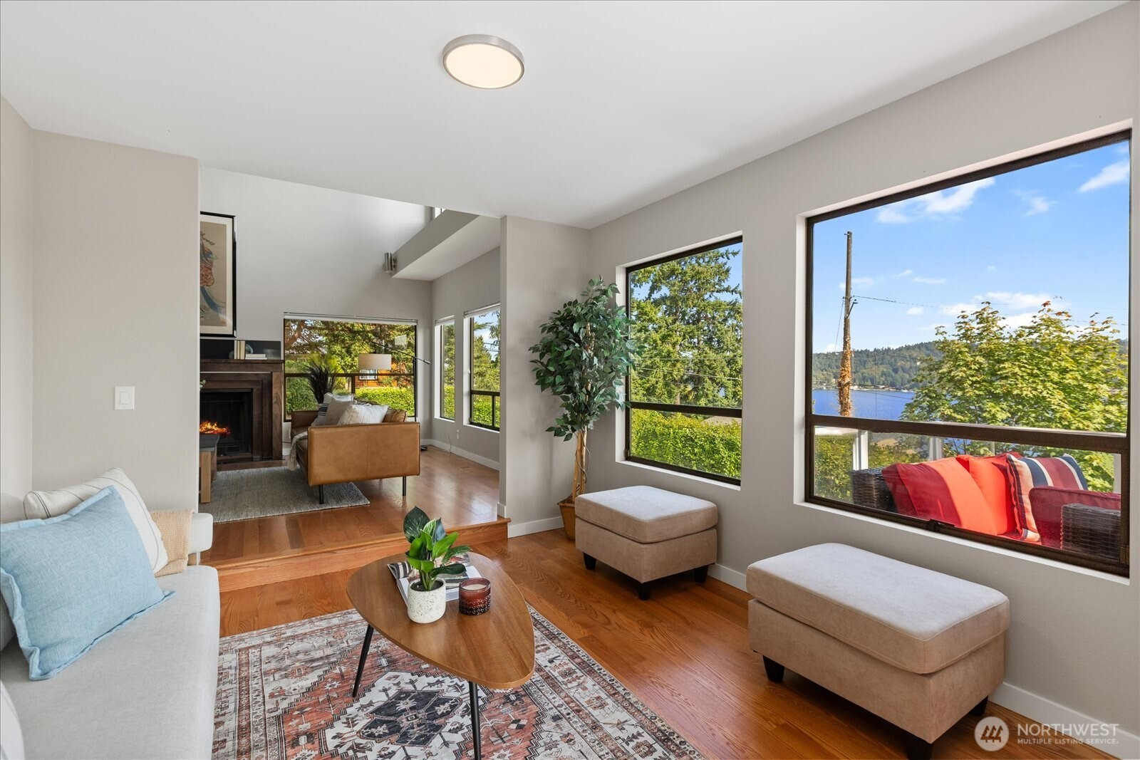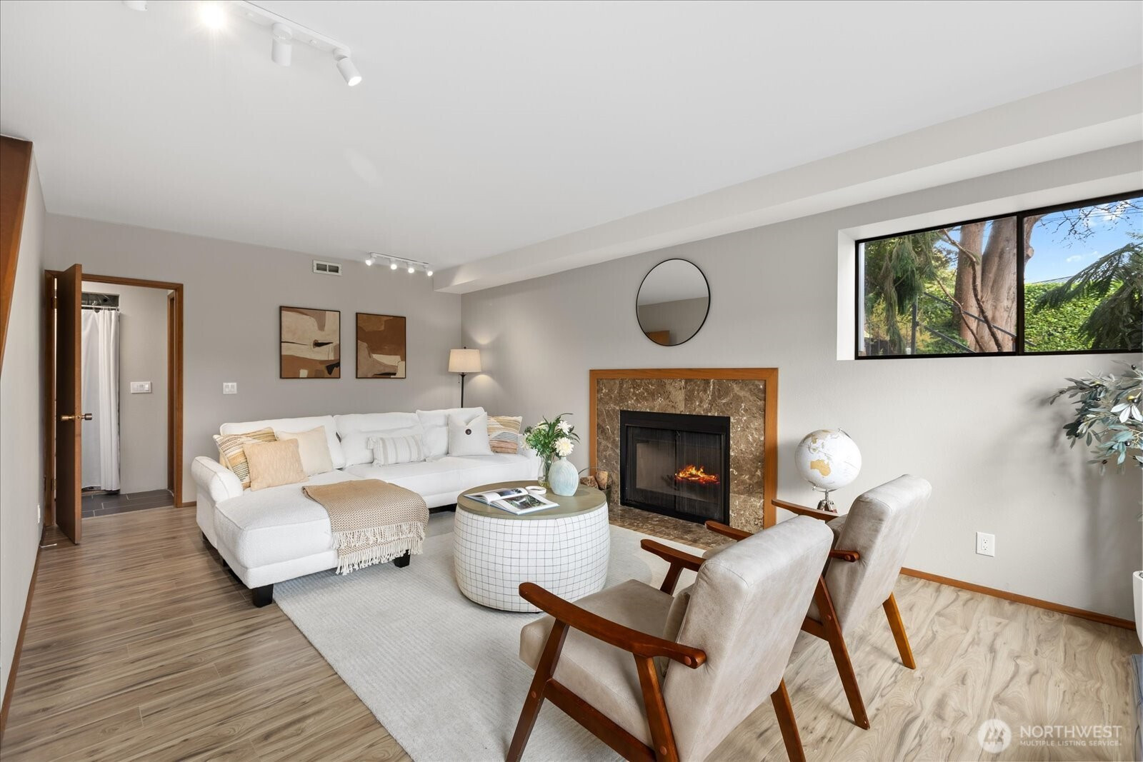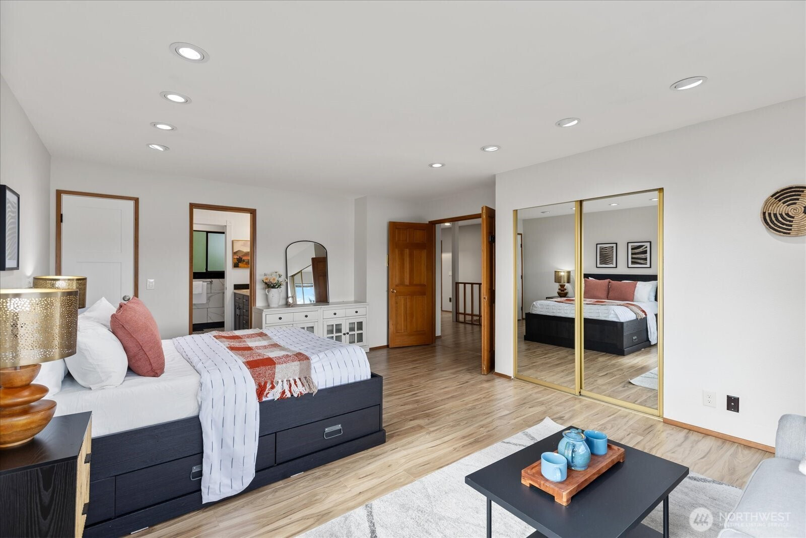 Stunning Lake Washington views from nearly every corner of this beautifully updated home! The main floor boasts a grand formal living room with soaring 20-foot ceilings, a formal dining room, great room with wet bar, and newly remodeled chef’s kitchen with quartz countertops, new cabinetry, & stainless steel appliances—ideal for both casual meals and gourmet entertaining. Gleaming hardwood floors flow throughout the main level, while oversized windows fill the home with natural light, creating warm spaces. Open staircase leads to the upper level with coveted three bedrooms, including a luxurious primary suite with Mt Rainier Views. Lower level features a spacious rec room, additional bedroom and full bath, and an oversized two-car garage.