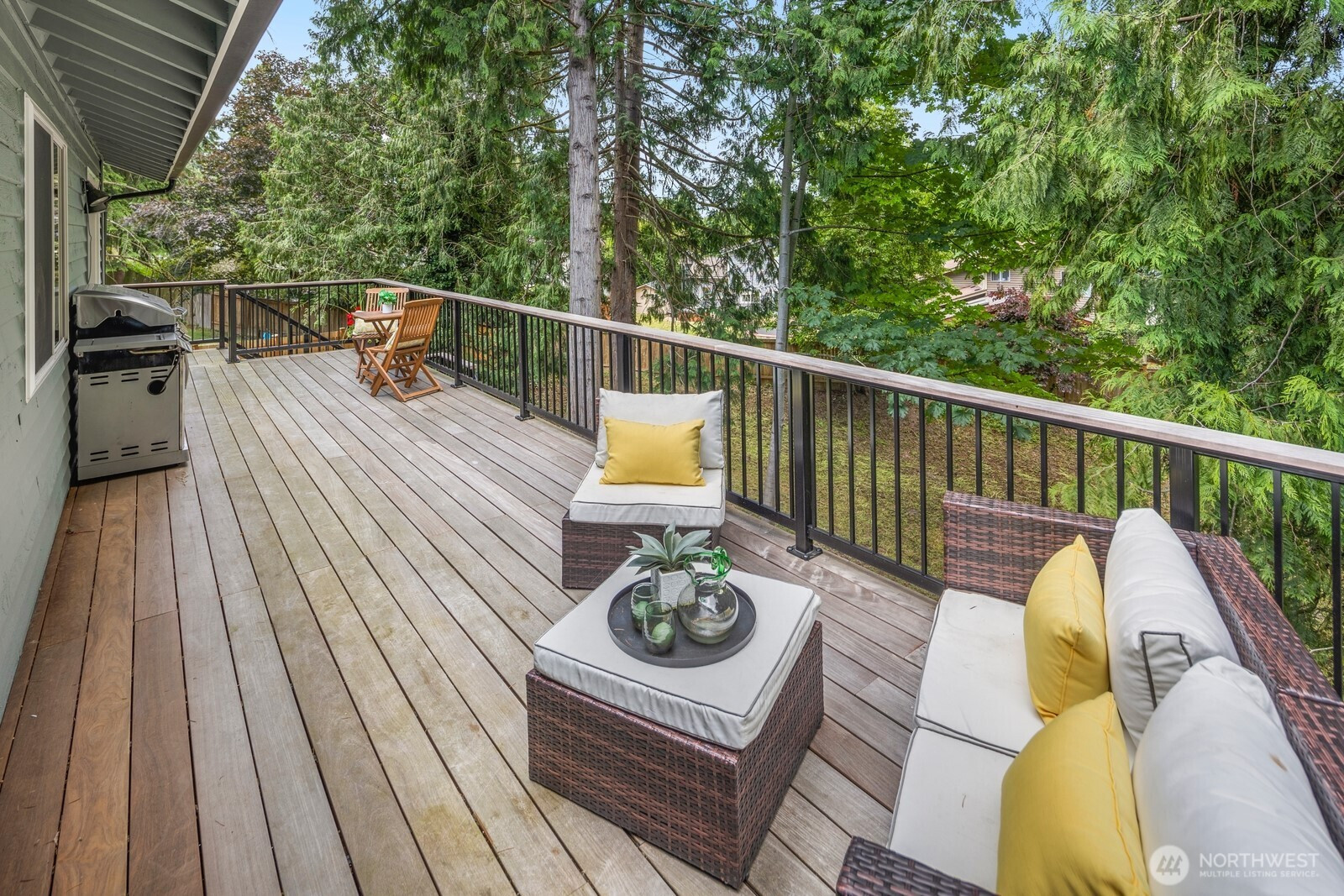 Tucked beneath towering evergreens on an oversized lot, this beautifully updated Kirkland Highlands home delivers the rare combination of privacy, space, and unbeatable city convenience. Vaulted ceilings and an open-concept layout create a light-filled main living area with a cozy wood-burning fireplace, a remodeled kitchen and spacious dining space, perfect for everyday living and entertaining. Three bedrooms are thoughtfully arranged on one level, including a generous primary suite and an additional full bathroom. The lower level expands your living options with a large great room, a ¾ bath, and a flexible space ideal for a fourth bedroom or home office. French doors, from the upper and lower levels, lead to a rebuilt Ipe deck overlooking a serene, park-like yard, your own private escape. Recent upgrades include a heat pump, tankless water heater, triple-pane windows, fresh interior paint and new carpet; this home is truly move-in ready. The oversized 2-car garage has tons of space to store your holiday decorations, recreational gear or even your personal wood shop. All of this, just minutes from Google, parks, trails, downtown Kirkland and top-rated Lake Washington schools, including Peter Kirk Elementary. Come check it out!