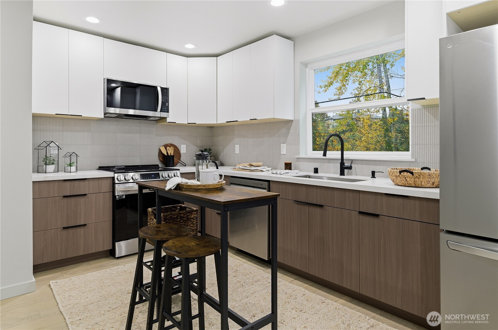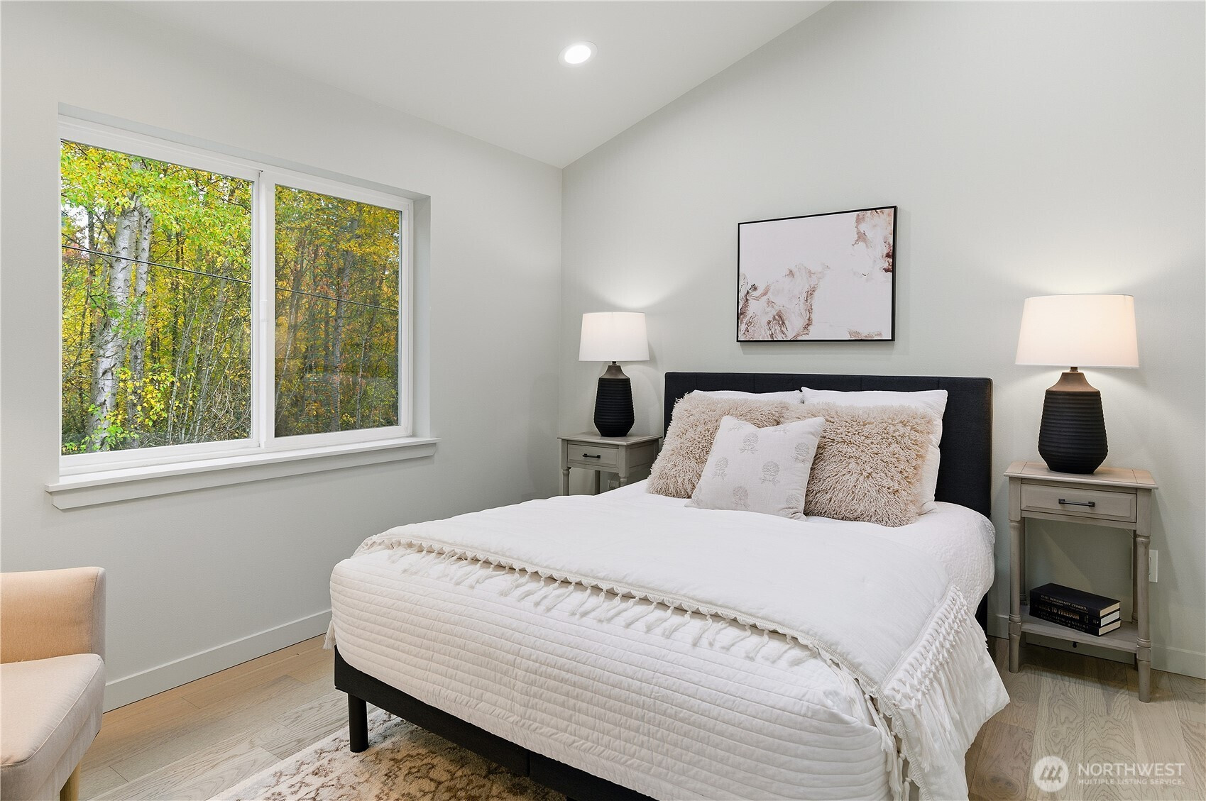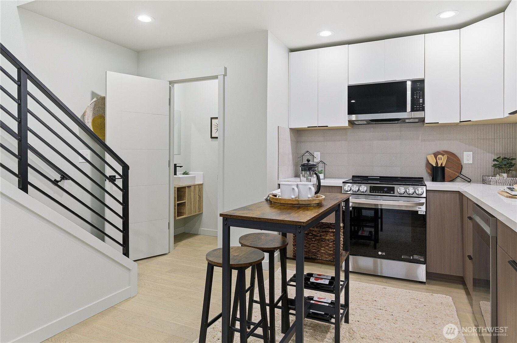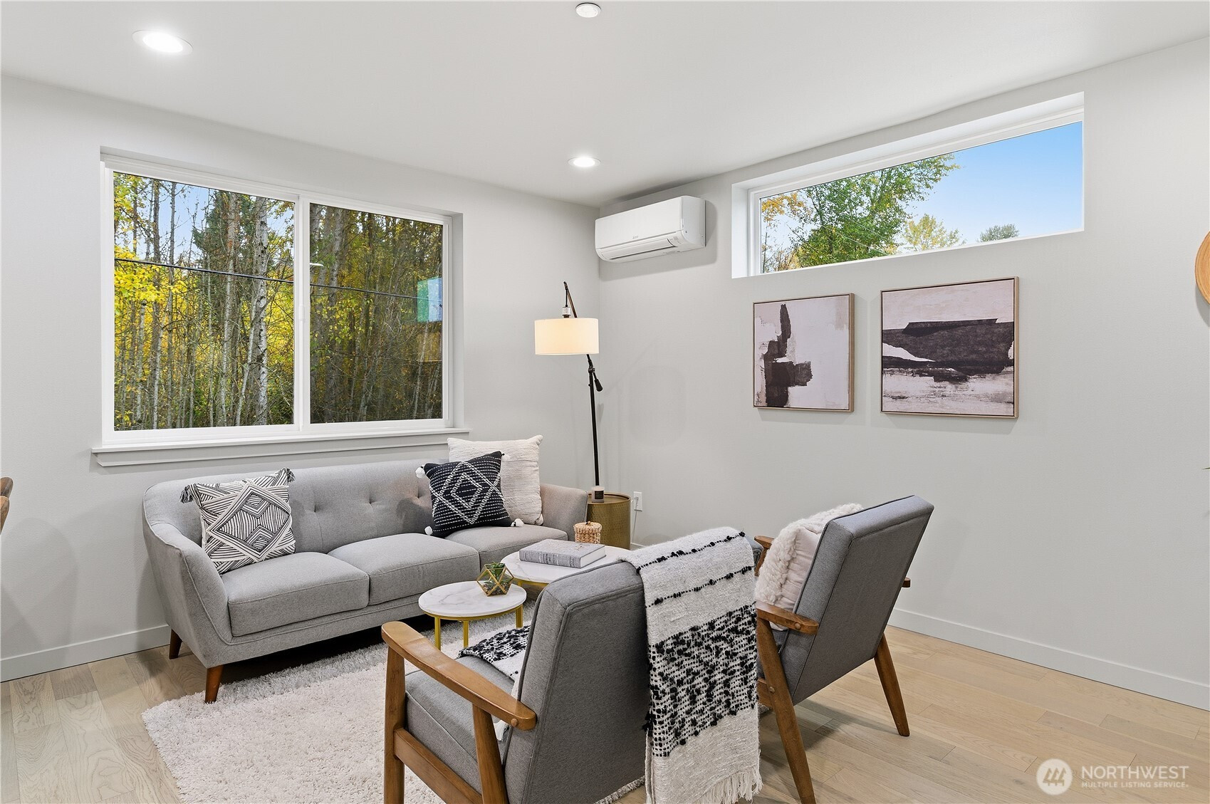 Luxury gated townhome community! 3 homes left! This home features a ground level ADU live/work space w/ open concept living + kitchen & bath. Upstairs you will find a well appointed kitchen that seamlessly flows to the living room w/ thoughtful half bath. Two more spacious beds up & additional bath. Each home built green w/ high-end energy-efficient materials including metal roofs, cement siding, & ductless mini-split systems. Engineered hardwoods, ceramic tile, quartz counters, large picture windows, skylights, & designer hardware/fixtures. Enjoy spacious closets & walk-in showers. BONUS washer/dryer + video doorbell included + wired for EV charger. Secure covered parking & fully fenced lot w/ 10k sq ft private wooded space. Low HOA dues!