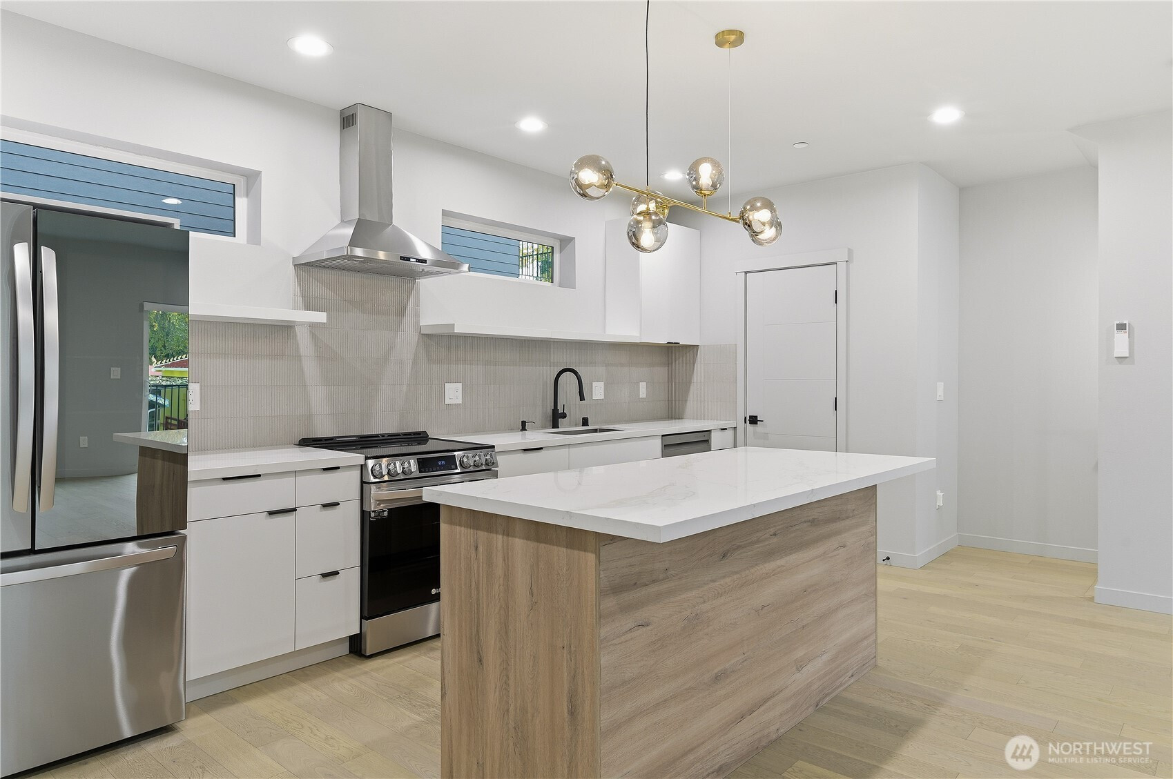 Luxury gated townhome community! Only 3 homes left! This home features a massive open concept living space with a sprawling island kitchen w/ thoughtful half bath. Upstairs you will find a primary bed ensuite + guest bed and additional bath. Each home built green w/ high-end energy-efficient materials including metal roofing, cement siding, & ductless mini-split systems. Engineered hardwoods, ceramic tile, quartz counters, large picture windows, skylights, & designer hardware + fixtures throughout. Enjoy spacious closets & walk-in showers. BONUS washer/dryer + video doorbell included + wired for EV charger. Secure covered parking & fully fenced lot w/ 10k sq ft private wooded space. Low HOA dues! Minutes from I-5 and near local transit.