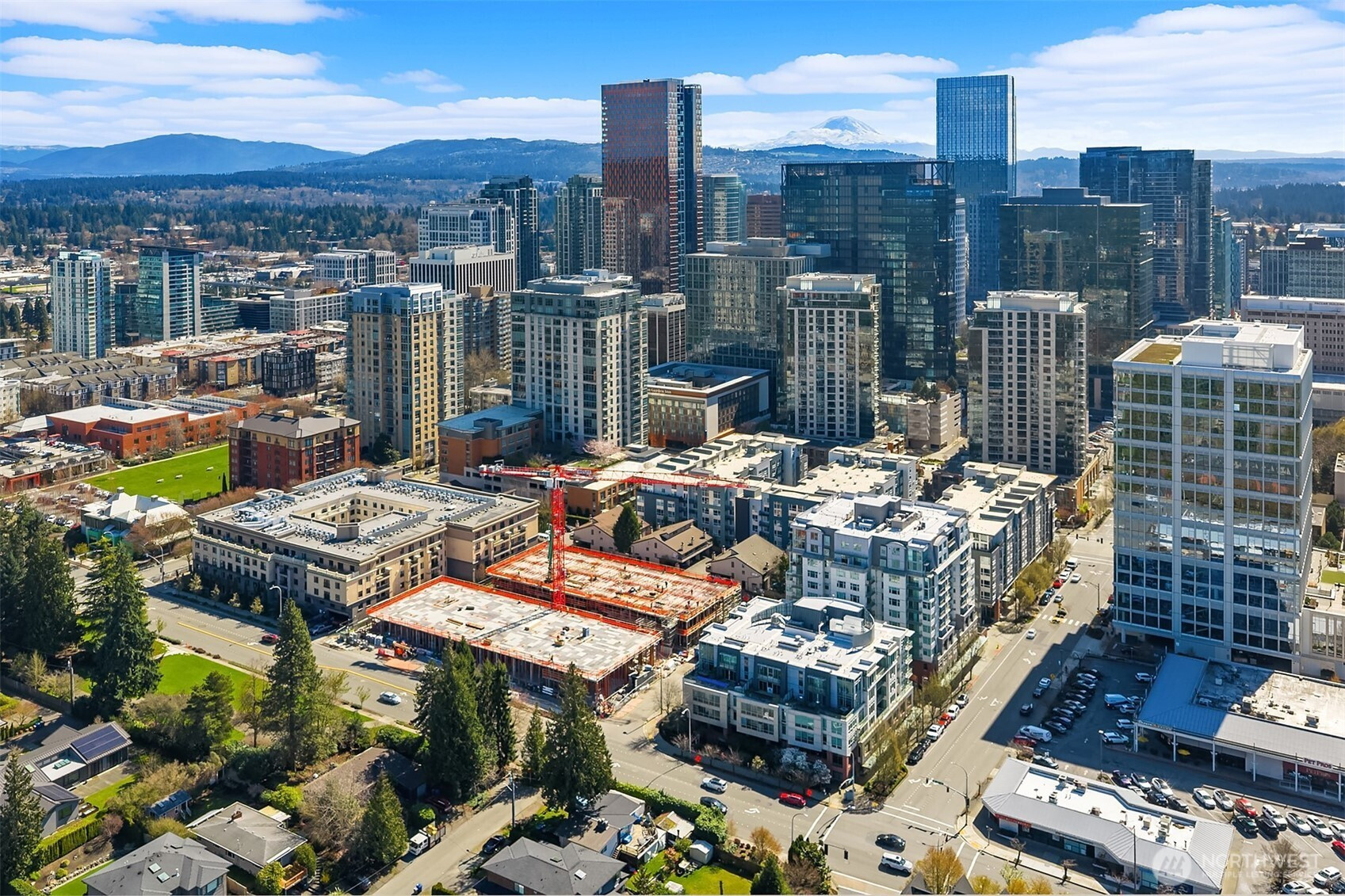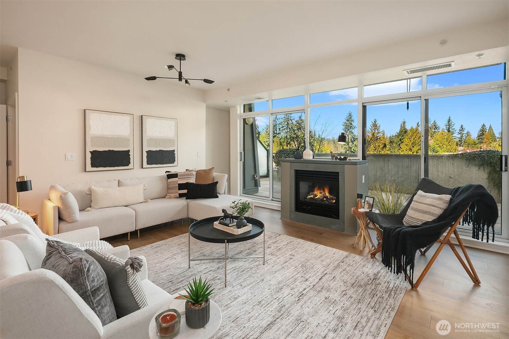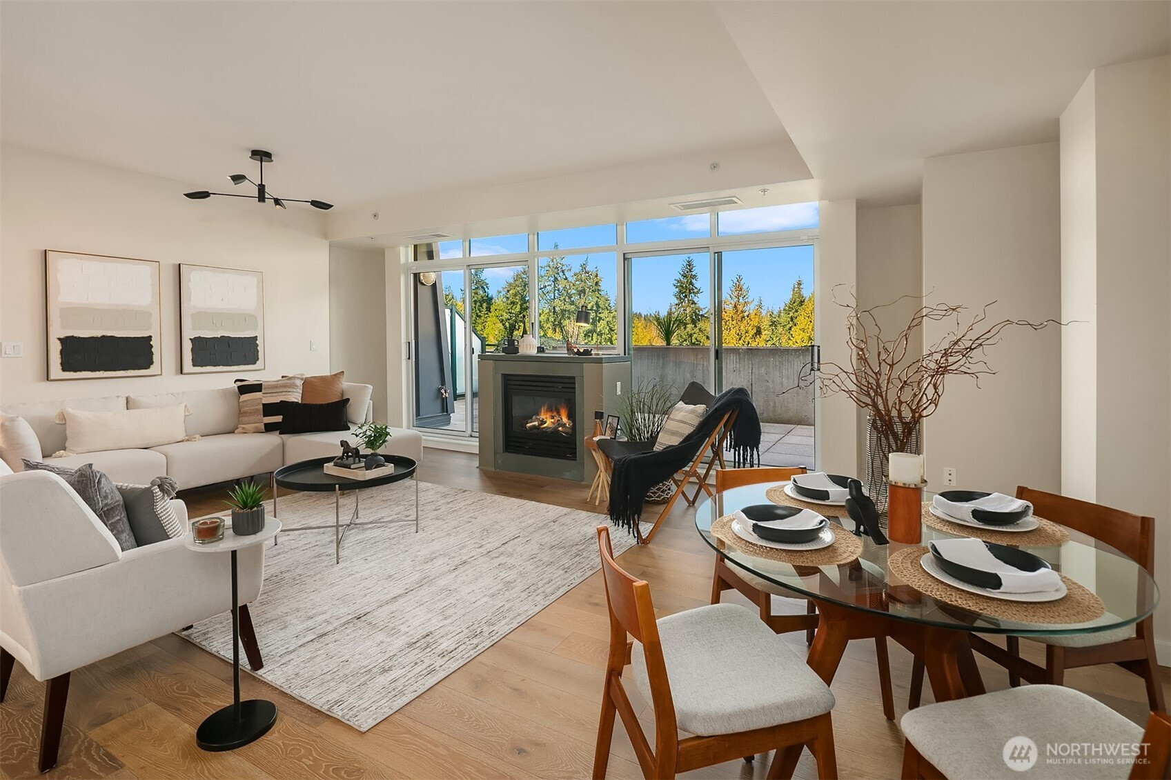 Stunning Palazzo penthouse offering exceptional light, space, and modern comfort. Floor-to-ceiling windows and a dramatic skylight fill the living spaces with abundant natural light. Thoughtfully designed Kitchen with a gas cooktop, built-in oven, granite countertops, and a walk-in pantry. Open concept living w beautiful hardwoods, gas fireplace and opens to an expansive private terrace (approx 400 sq ft) with territorial views is perfect for seamless indoor-outdoor living and entertaining. Conveniently located bathroom off living space. Both bedrooms feature brand new carpet and are situated on the upper level, each offering a private en-suite bathroom, ample closet space and its own balcony. Secure garage with two parking spaces and extra storage. Premium amenities w a full-time concierge, business center, and fitness center. No rental cap. Walking distance to shops, parks, restaurants and everything Downtown Bellevue has to offer!