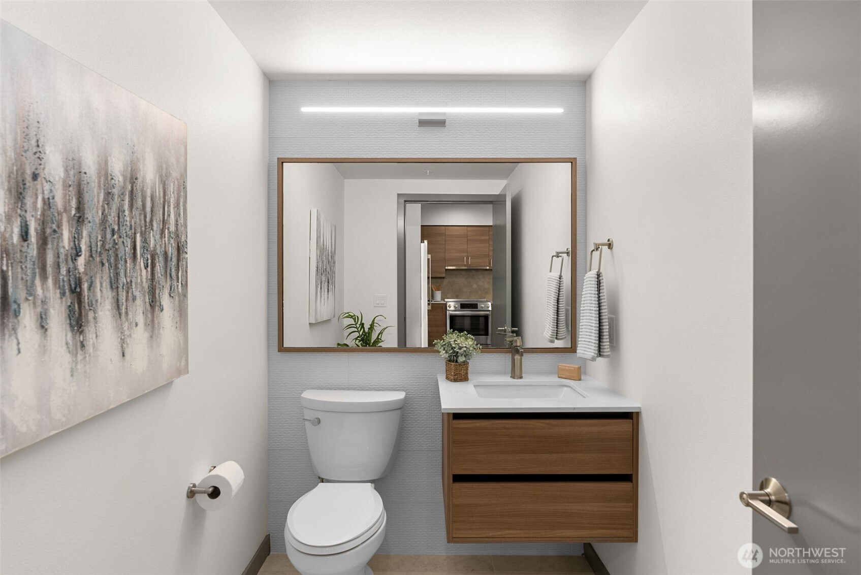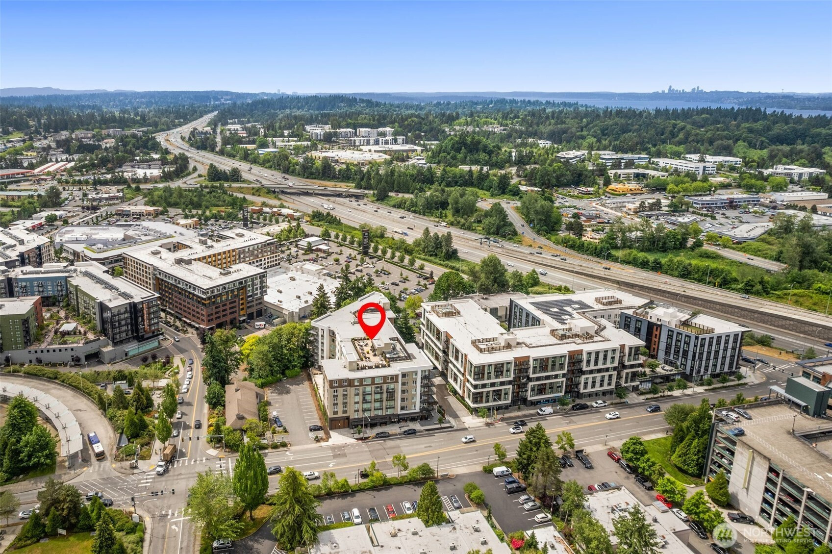 The Jade, Introducing an exquisite 1-bedroom, 1.5-bathroom condominium in the esteemed Jade complex of Totem Lake. South facing with 9' ceilings This stunning residence showcases a contemporary open kitchen adorned with top-of-the-line stainless steel appliances, custom cabinets, stylish lighting, and elegant hardwood plank floors. A washer/dryer are also included for your convenience. The living room overlooks a lush green belt, providing a serene setting. The Jade boasts fantastic amenities, including a clubhouse, a state-of-the-art gym, a rooftop deck for relaxation, convenient package lockers, and a garage equipped with bike storage and an EV charging station. Located just moments away from the Village at Totem Lake and major tech hubs