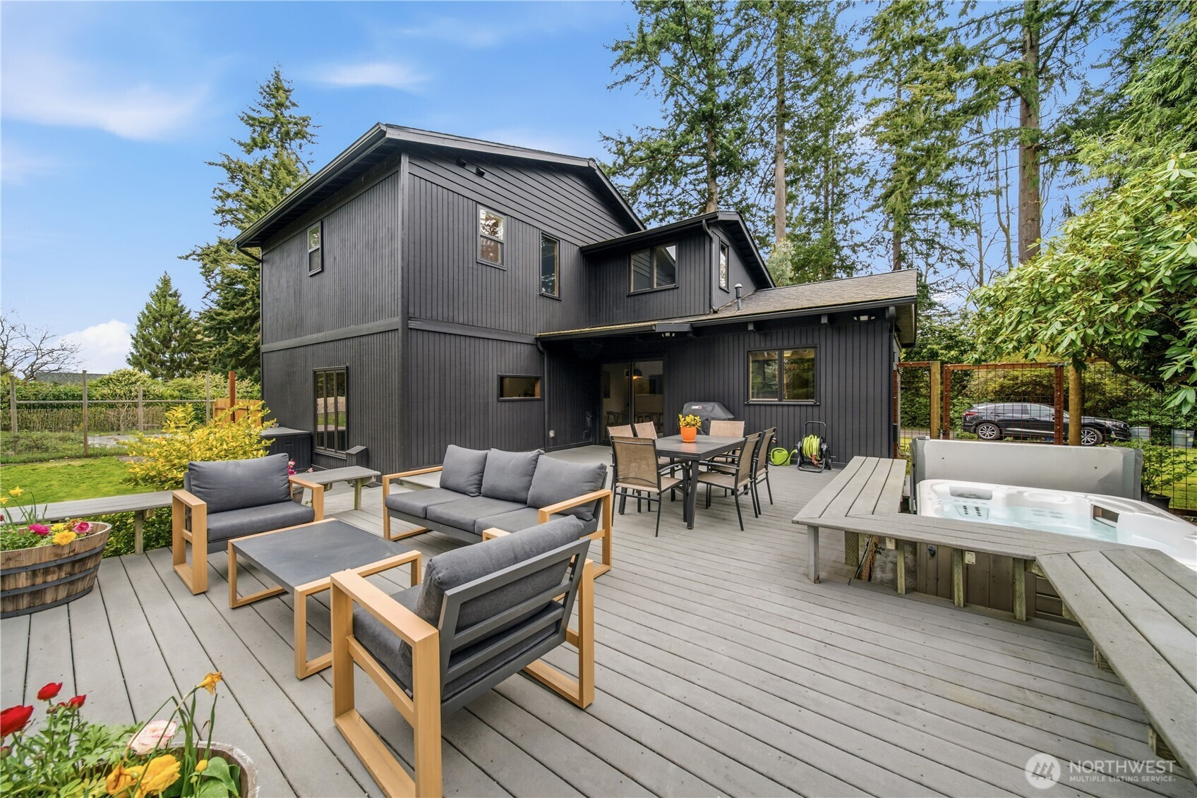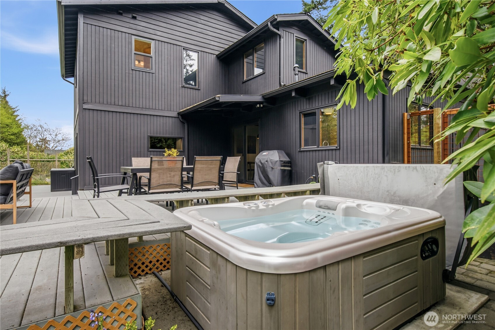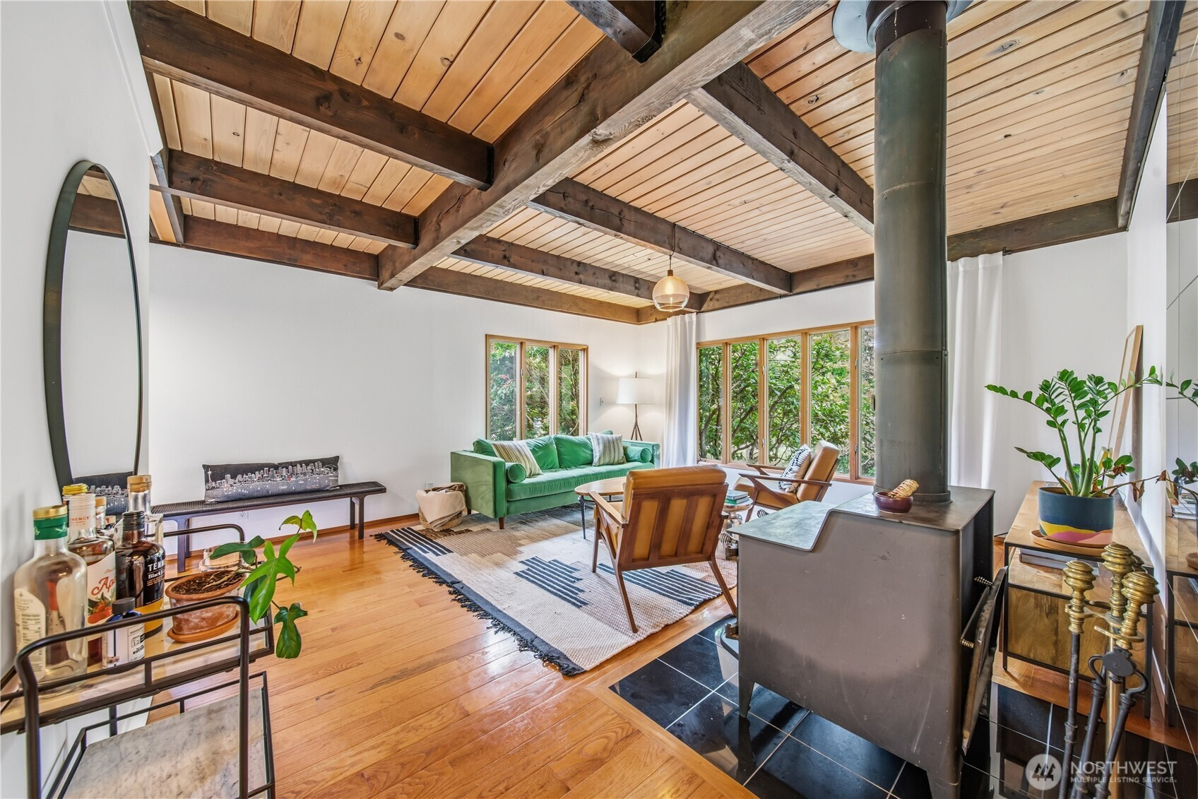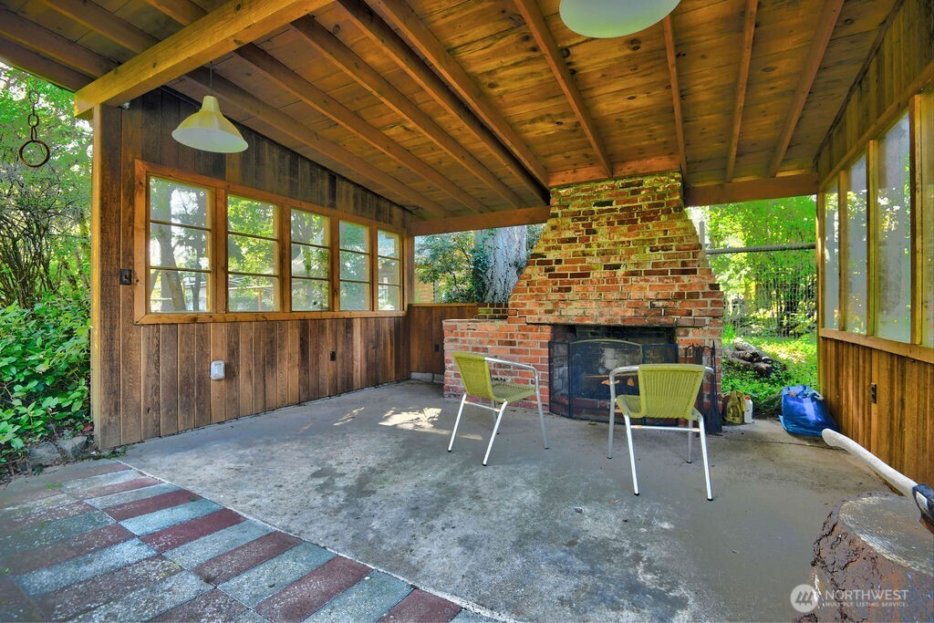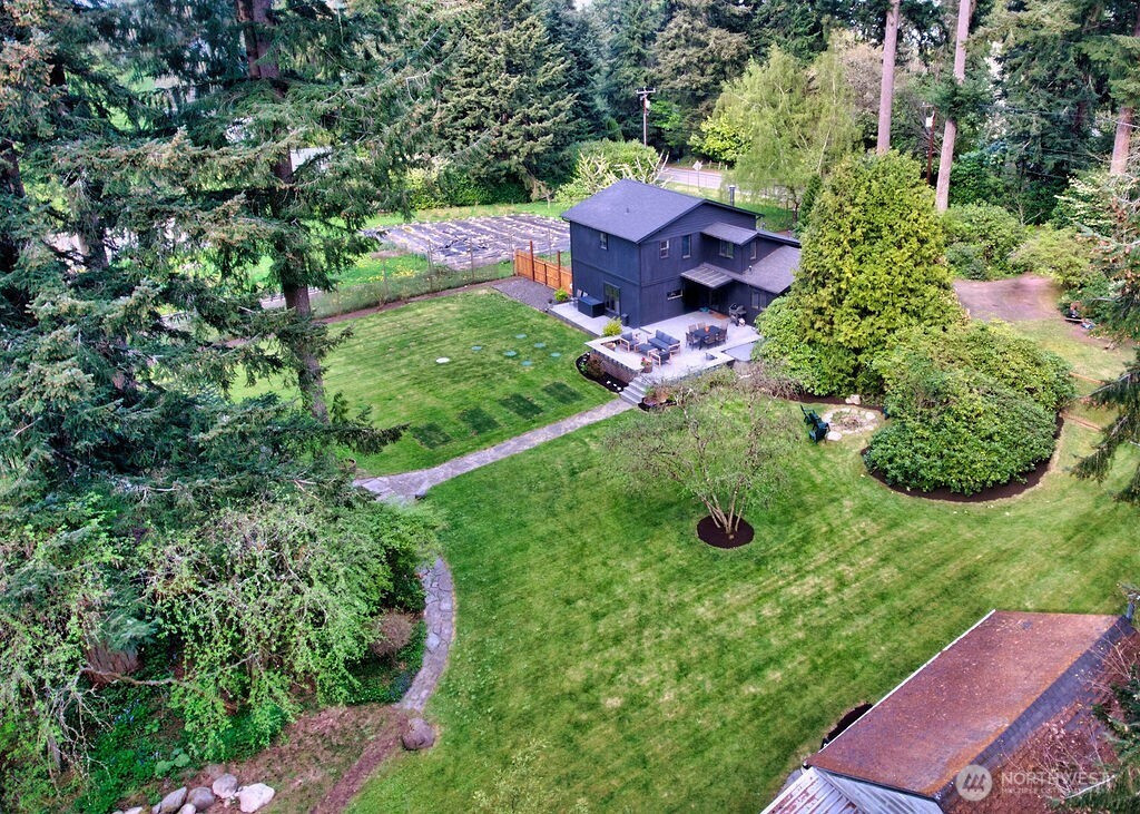 Mid-century modern Vashon retreat blending island living with elevated design. This 3 bed, 3 bath home offers 2,380 sq ft is in immaculate condition with vaulted wood beamed ceilings, warm architectural lines, and seamless indoor-outdoor flow. Set on a large, private, park-like double lot surrounded by mature trees, curated landscaping, garden beds, and a fully fenced backyard. Entertain on the expansive deck or host grilling sessions and fireside chats at the covered backyard BBQ area. Relax in the hot tub on the back deck, and host friends weekends away with a private guest suite on the main floor. A detached studio features wood-burning stove and vinyl wood plank flooring. Ideal for creative space, gym or yoga, or whatever else you can dream up. The expansive kitchen features a chefs dream of counter space, built-ins, and high end appliances with in a well crafted design. Wake up each day in you large primary suite with spa bathroom and large closet with built-ins and head over to be inspired in your forest view office. Built for comfort, privacy, and connection to nature. Just minutes from the ferry to Seattle, local shops, dining, and all that Vashon has to offer. An exceptional balance of tranquility, style, and convenience. Homes like this don’t happen often.