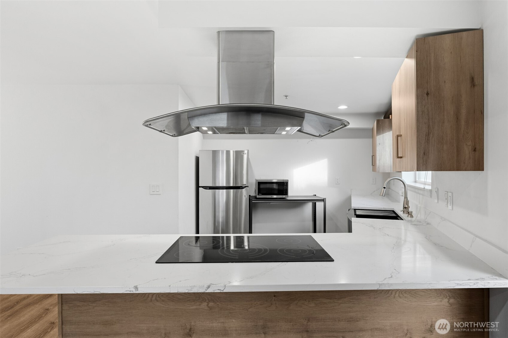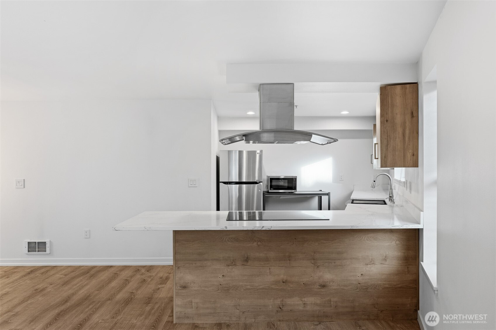 (503) 893-8874A rare top-floor corner layout: although the building spans three stories, this unit sits above only two—delivering the serenity of top-floor living with no footsteps overhead and enhanced natural light. Effortlessly walkable to lakefront trails, 5 mins to Juanita Beach Park, Friday Farmer's Market, dining hotspots & shops, plus Bus stop at Super 24 right in front—easy access to Seattle downtown. Totem Lake Mall just 5 mins by car for effortless shopping. Recent upgrades bathroom into Spa-inspired with white shaker cabinets, Calacatta quartz vanity (undermount sink, matte black Delta faucets), frameless glass shower (subway marble tiles, pebble floor), porcelain plank tiles for serene elegance. Chef's Dream Kitchen designed with Warm oak shaker cabinets frame glossy Calacatta quartz counters; deep farmhouse sink under brushed nickel pull-down faucet; induction cooktop with stainless Zephyr hood; white subway backsplash; LG stainless appliances—flooded with natural light over green trees. Open living/dining on wide-plank hardwoods; in-unit LG washer/dryer; ample storage. Built 2002, pet-friendly Secure gated entry/elevator; assigned 1 parking + deeded storage cage; guest spots; courtyard with heat lamps/fire pit. Lake Washington School District. King County 2025 assessed value: $421K. Renovations add premium; list-ready at $425K. Pure waterfront vibe with peekaboo views and Your coastal escape awaits. Virtually Staged.