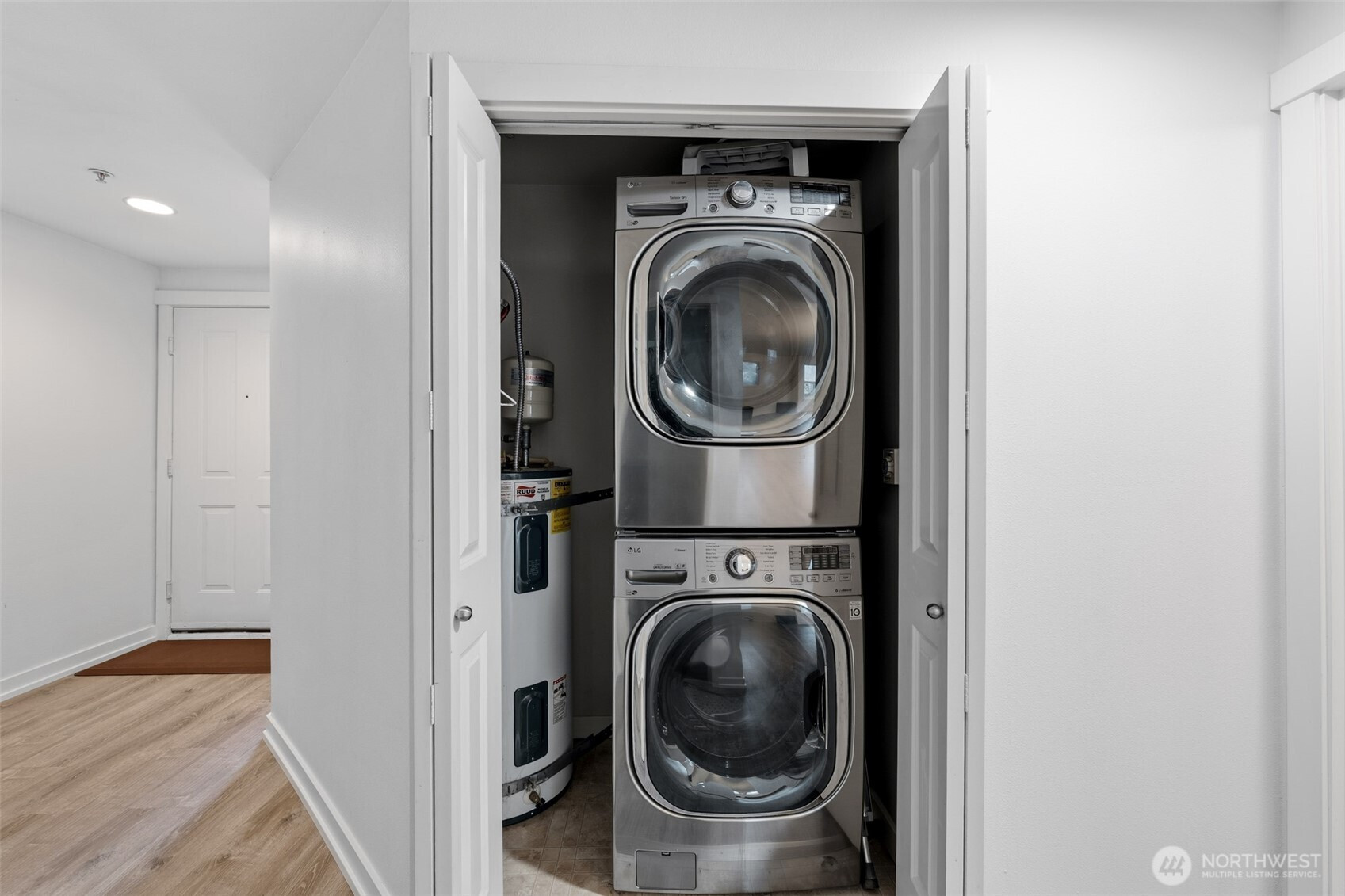 A rare top-floor corner layout: although the building spans three stories, this unit sits above only two—delivering the serenity of top-floor living with no footsteps overhead and enhanced natural light. Effortlessly walkable to lakefront trails, 5 mins to Juanita Beach Park, Friday Farmer's Market, dining hotspots & shops, plus Bus stop at Super 24 right in front—easy access to Seattle downtown. Totem Lake Mall just 5 mins by car for effortless shopping. Recent upgrades bathroom into Spa-inspired with white shaker cabinets, Calacatta quartz vanity (undermount sink, matte black Delta faucets), frameless glass shower (subway marble tiles, pebble floor), porcelain plank tiles for serene elegance. Chef's Dream Kitchen designed with Warm oak shaker cabinets frame glossy Calacatta quartz counters; deep farmhouse sink under brushed nickel pull-down faucet; induction cooktop with stainless Zephyr hood; white subway backsplash; LG stainless appliances—flooded with natural light over green trees. Open living/dining on wide-plank hardwoods; in-unit LG washer/dryer; ample storage. Built 2002, pet-friendly Secure gated entry/elevator; assigned 1 parking + deeded storage cage; guest spots; courtyard with heat lamps/fire pit. Lake Washington School District. King County 2025 assessed value: $421K. Renovations add premium; list-ready at $425K. Pure waterfront vibe with peekaboo views and Your coastal escape awaits.