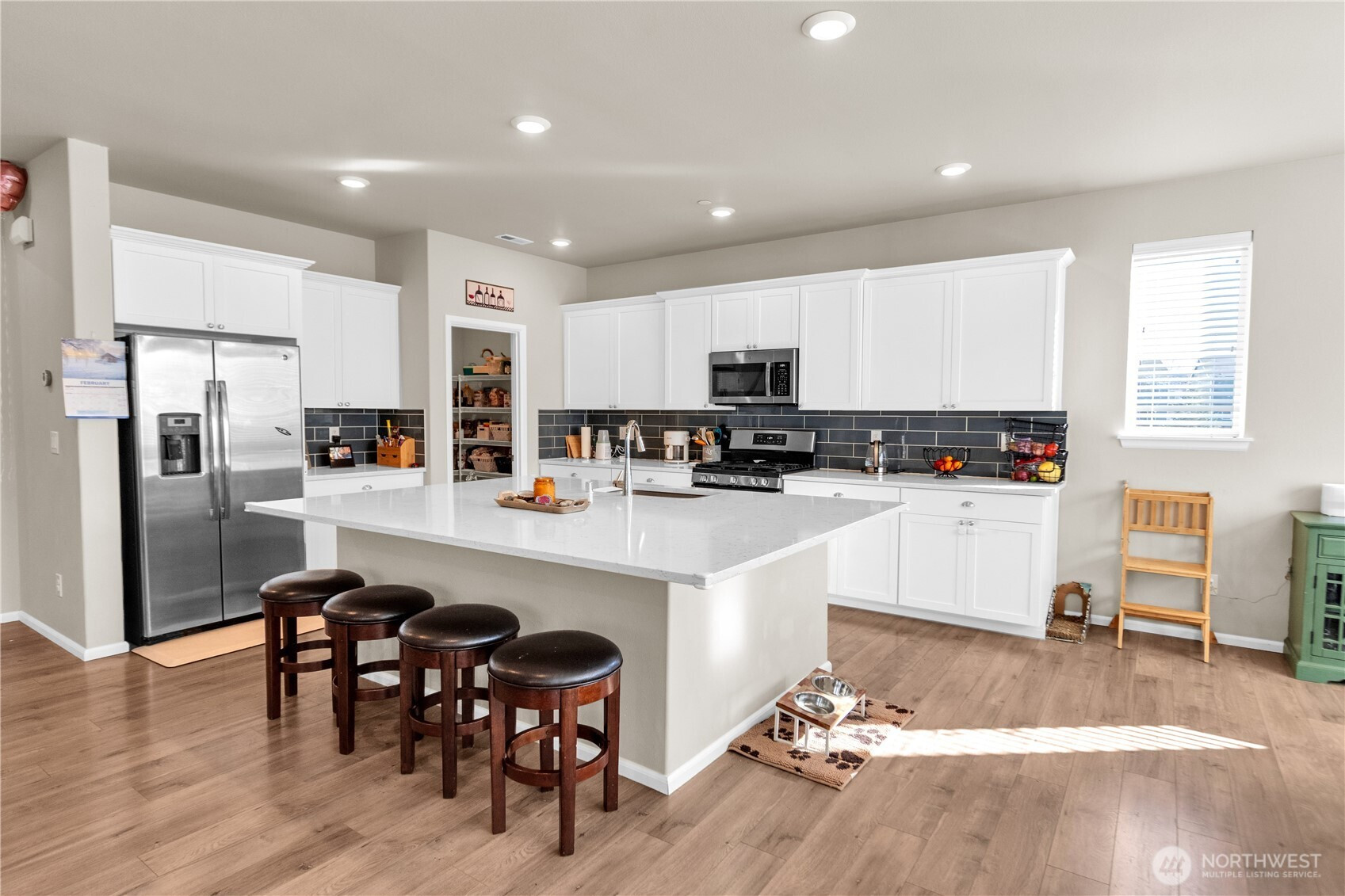 Enjoy bright natural light, tons of space and views of the mountain at this 5-bed, 2 3/4 bath home. Situated deep into the 'Bridges' neighborhood next to a pond and backed to vegetation this home offers peace and quite as well as privacy. The spacious main level is great for relaxation and entertainment with its open layout kitchen, dining and living room. Main level also includes 1 bedroom and a 3/4 bathroom. The upper level welcomes you with another living space on your way to the primary and 3 additional bedrooms along with 2 full bathrooms. The roomy primary includes his and hers sink, a large walk-in closet, a bath tub and a shower. Backyard is fully fenced, includes a covered patio and is set up for gardening.