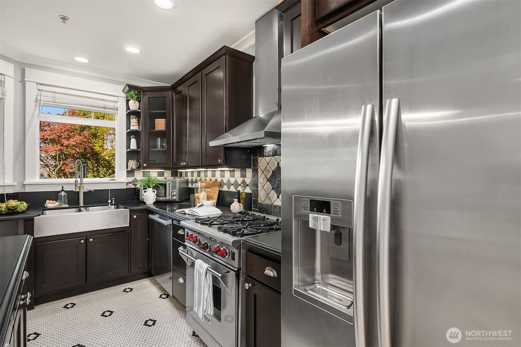 Sophisticated Capitol Hill townhome, where classic meets contemporary. Freshly refinished gleaming maple hardwood floors, radiant in-floor heating, and fresh paint welcome you. The chef's kitchen offers sleek granite surfaces, a high-end Wolf range, and generous pantry space. Escape to the primary retreat, with soaring vaulted ceilings, two generous walk-in closets, a serene spa bath, and a secluded office alcove. Savor panoramic city vistas from the rooftop deck, or unwind on the balcony and rear patio. Rare two-car garage and bonus storage. Mere blocks to Volunteer Park, a quick stroll to lively 15th and Broadway dining and boutiques, plus seamless light rail and highway connections. Walk Score 97—effortless city living redefined.