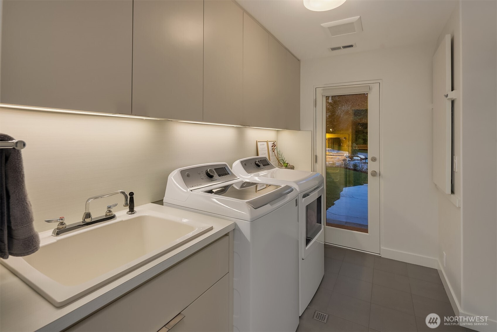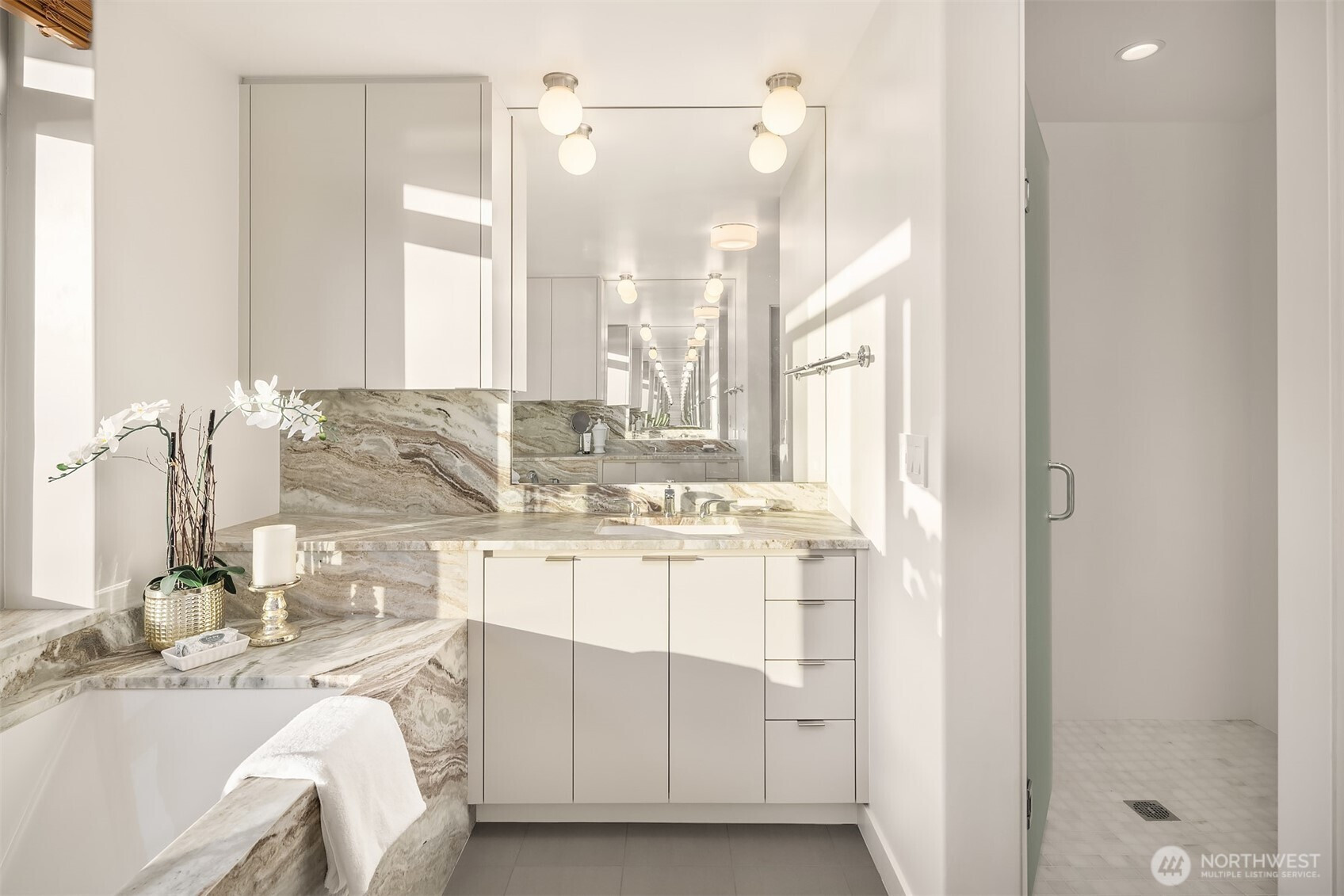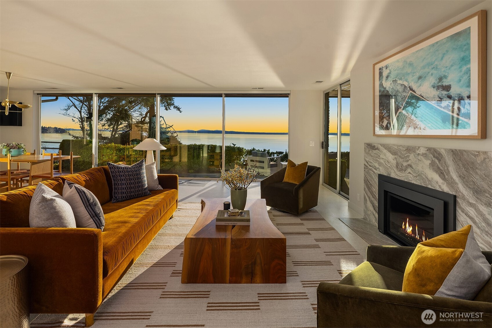 PNW mid-century modern with uninterrupted views of Puget Sound & the Olympic Mountains. Walls of glass draw in the landscape & flood the home with natural light. Originally imagined by John Fluke Jr., the home embraces its surroundings that are expansive & private, with wooded trails to water's edge, newly curated landscaping & entertaining spaces, fruit trees, & a peaceful pond. The refined kitchen allows the view to take center stage. It is positioned between the front & back patios, allowing a natural connection via Fleetwood sliders between outdoor spaces. The front patio has been redesigned for the ultimate grillmaster, complete with Big Green Egg, Argentine-style Santa Maria grill & BBQ, & features extensive seating areas. The newly added back patio overlooks the Sound - perfect for dining al fresco. The main level offers a thoughtful layout with open living areas & three privately situated bedrooms down the hall, along with a laundry room, powder room & two full bathrooms. A striking curved staircase to the lower level, complemented by original brass inlay terrazzo floors, guides you down to an oversized entertaining space with subterranean storage or wine cellar potential, a 4th bedroom, plus a spacious bonus room. Just past the main home, a detached garage of exceptional scale, is well-suited for 8+ cars, boat storage, RV storage & more! BellCraft Architects renderings available for envisioned future use.