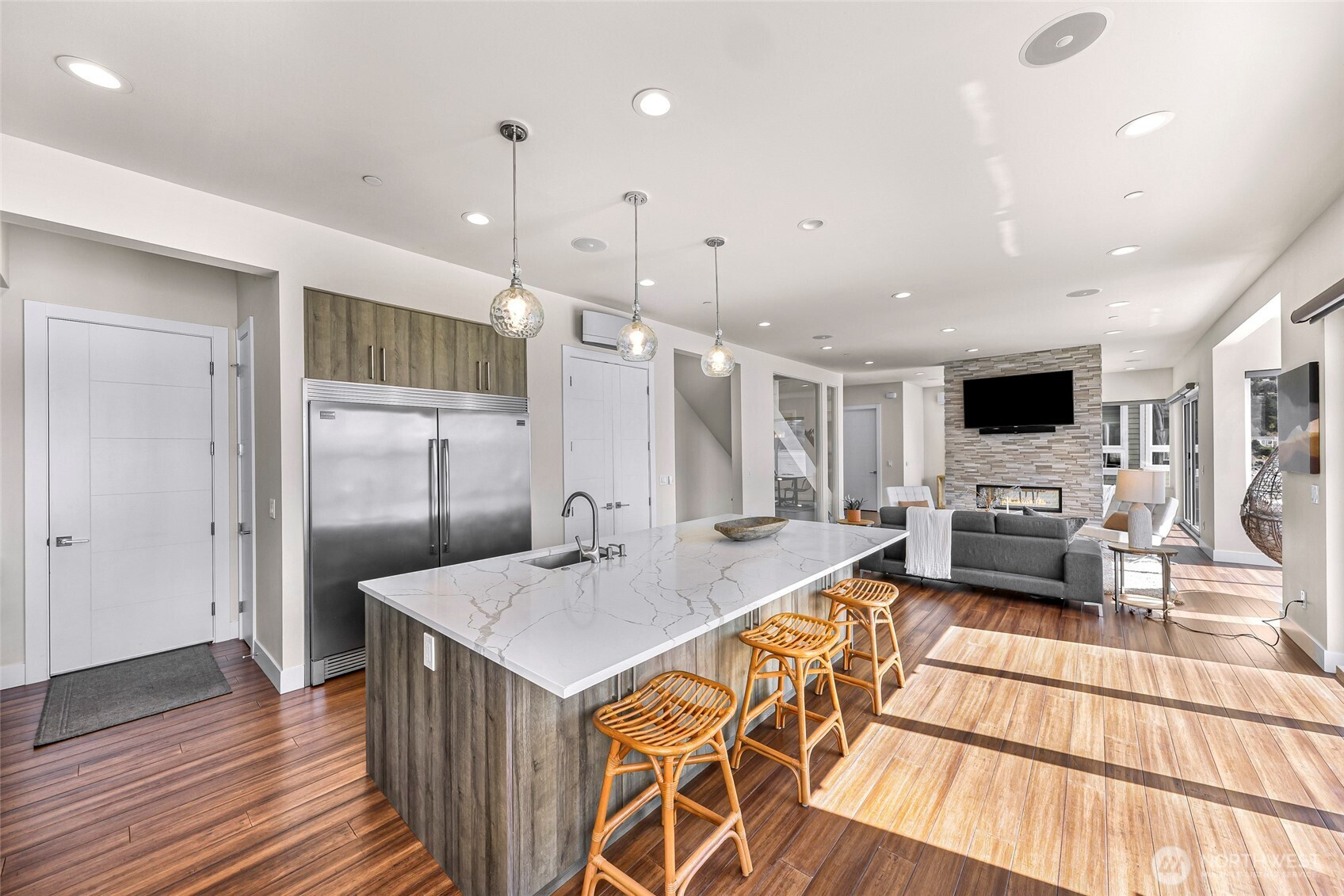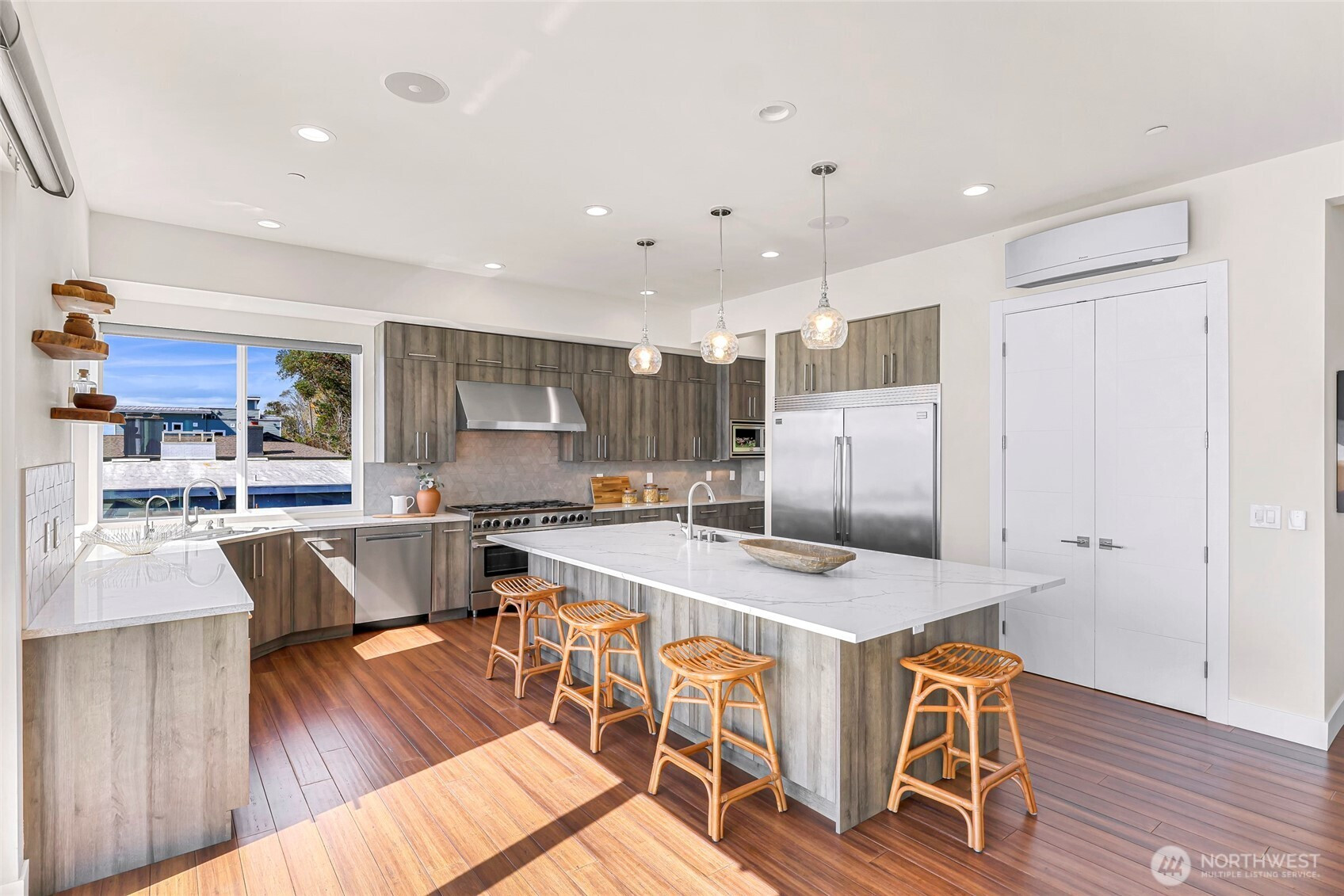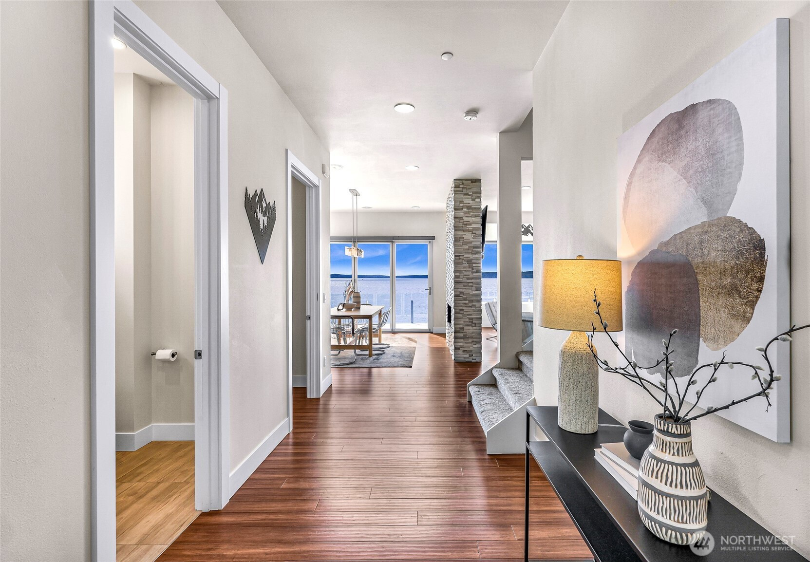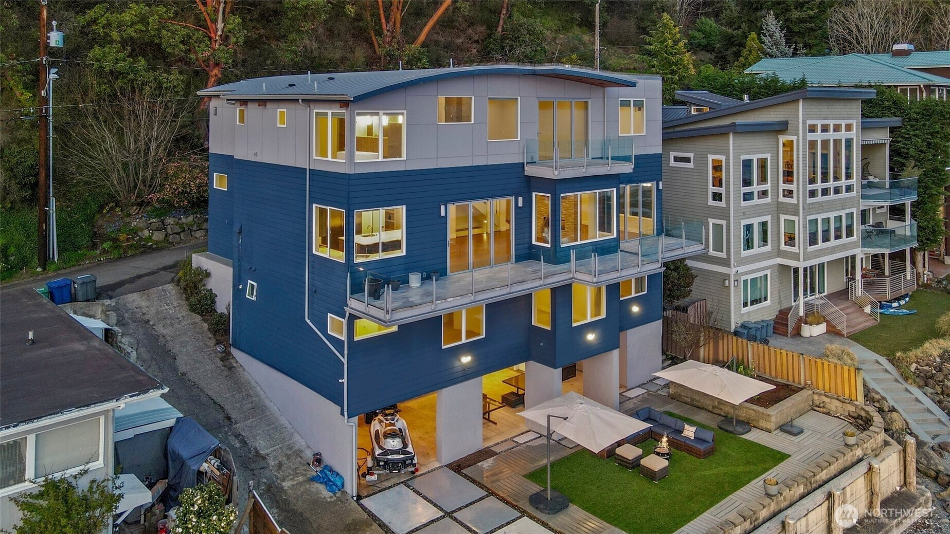 Experience the pinnacle of refined coastal elegance in this rare waterfront masterpiece. Nestled within the highly coveted Shorewood on the Sound's gated 12-home enclave, this masterpiece offers an unparalleled connection to the PNW landscape. With 62 feet of pristine low-bank shoreline and a semi-private boat ramp, your transition from morning coffee to the shimmering waters of Puget Sound is effortless. Step inside to a world of architectural brilliance where NanaWall systems dissolve the boundaries between the sophisticated interior and the breathtaking vistas outside. The heart of the home is a culinary sanctuary, featuring a premium Bluestar range, dual dishwashers, and double sinks, perfect for hosting grand soirées or intimate sunset dinners. Engineered for ultimate flexibility and extremely energy efficient, the entire 1,000 sq. ft. first floor, comprising three spacious bedrooms, functions as an optional bonus wing. Whether utilized as a guest sanctuary or kept as quiet "bonus" space, every room features individual heat exchangers, allowing you to curate the climate and energy use of each square inch of the home. From the soundproofed office and elevator-ready design to the heated bathroom floors and expansive garage with EV charging, no detail has been overlooked. This is a residence that scales to your lifestyle: a waterfront estate with the soul and efficiency of a modern retreat. Welcome home to the future of luxury.