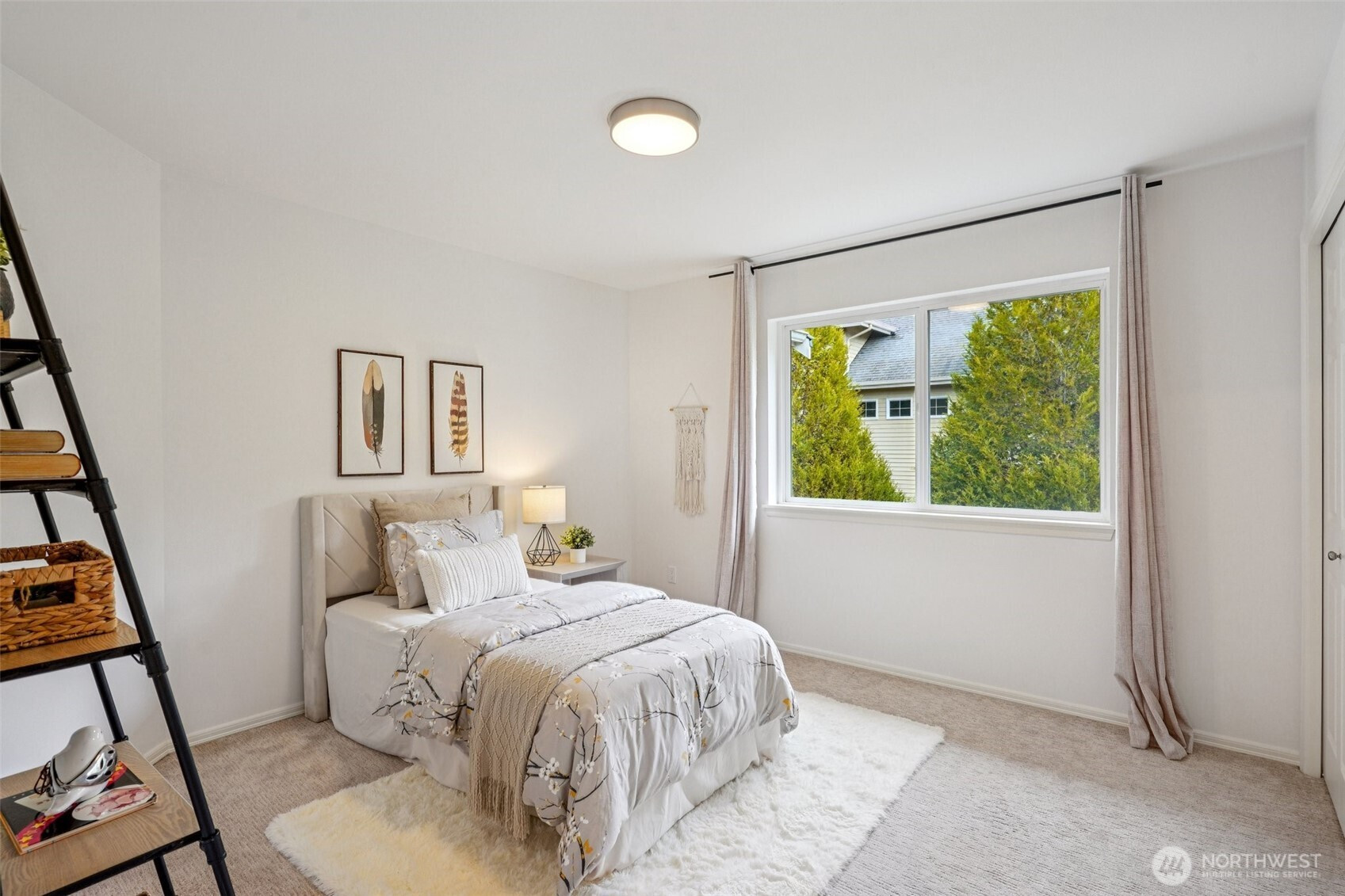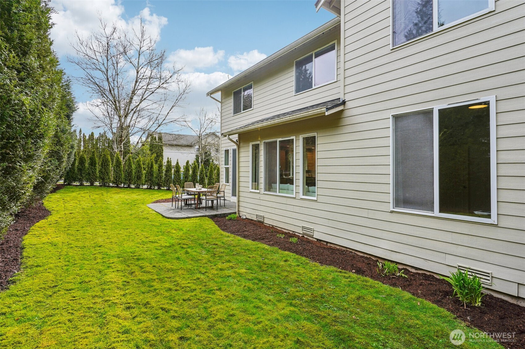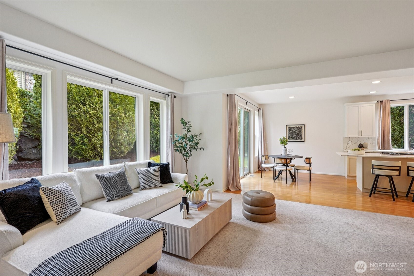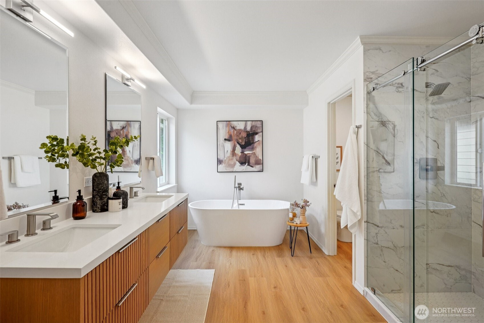 Fully renovated Redmond home redesigned with Scandinavian simplicity blended with modern Pacific Northwest style, featuring clean lines, natural materials, and bright, open living spaces. Large windows fill the home with natural light, creating warm and inviting spaces throughout the day. Step inside to a bright interior anchored by a dramatic entry and staircase feature wall that immediately sets the tone for the home’s thoughtful design. At the heart of the home is a fully renovated kitchen with an open-concept layout, featuring a large island with bar seating, quartz countertops, new appliances, and updated cabinetry—all designed for gathering, entertaining, and everyday living. The primary suite offers a spa-inspired bathroom with a marble shower and oversized soaking tub, complemented by hardwood and quartz dual vanities, creating a peaceful retreat. Guest bathrooms continue the same refined design with hardwood and quartz vanities and updated flooring. The 3,184 sq ft layout includes five bedrooms and multiple flexible living spaces, including a media or bonus room, guest or home office, and a spacious family loft, along with a three-car attached garage. Situated on a 6,608 sq ft corner lot, the newly landscaped backyard provides privacy and features two patios designed for outdoor dining, entertaining, and summer gatherings. Major updates include a new roof, fully renovated kitchen and bathrooms, new appliances, and refreshed interior finishes throughout.