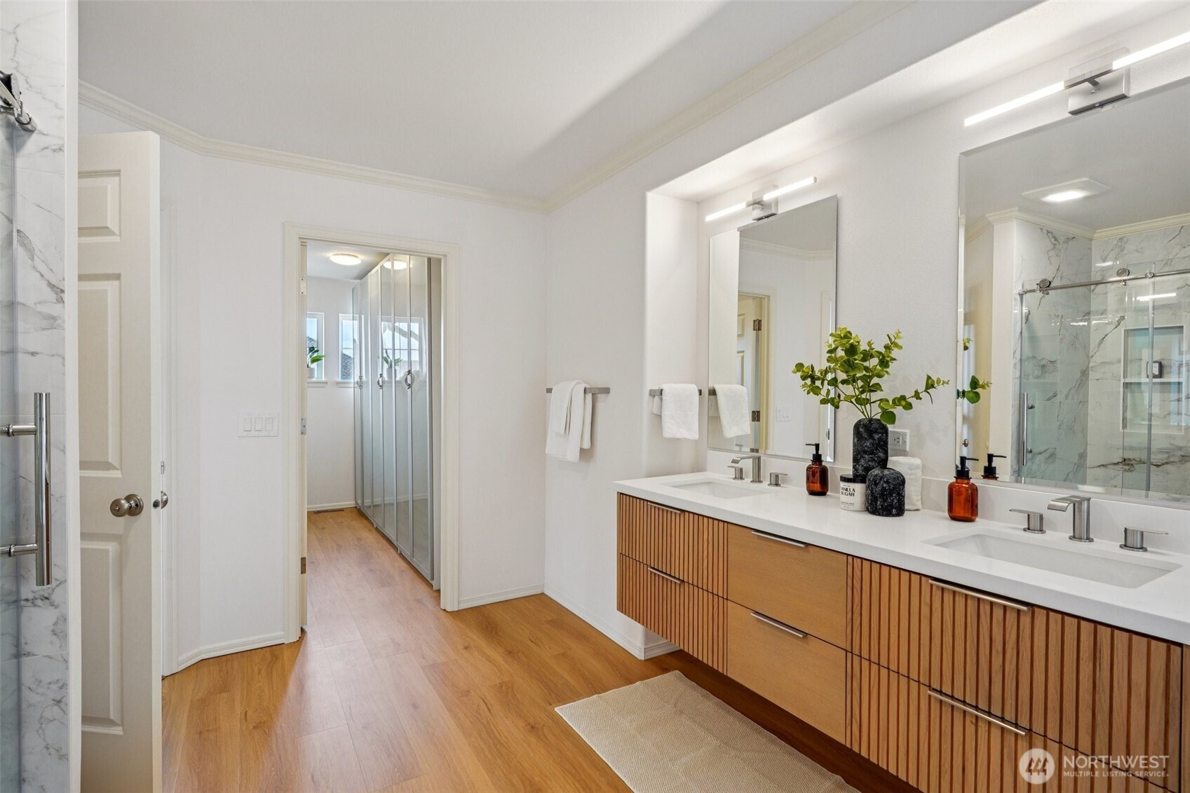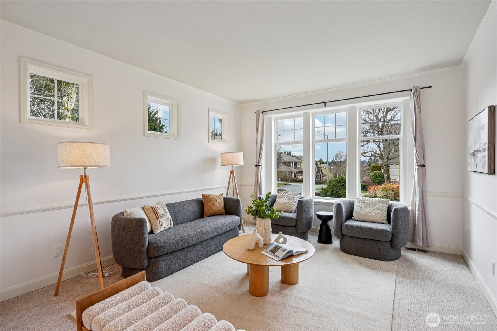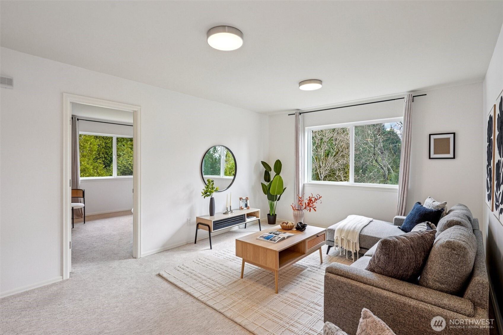 Fully renovated Redmond home redesigned with Scandinavian simplicity blended with modern Pacific Northwest style, featuring clean lines, natural materials, and bright, open living spaces. Large windows fill the home with natural light, creating warm and inviting spaces throughout the day. Step inside to a bright interior anchored by a dramatic entry and staircase feature wall that immediately sets the tone for the home’s thoughtful design. At the heart of the home is a fully renovated kitchen with an open-concept layout, featuring a large island with bar seating, quartz countertops, new appliances, and updated cabinetry—all designed for gathering, entertaining, and everyday living. The primary suite offers a spa-inspired bathroom with a marble shower and oversized soaking tub, complemented by hardwood and quartz dual vanities, creating a peaceful retreat. Guest bathrooms continue the same refined design with hardwood and quartz vanities and updated flooring. The 3,184 sq ft layout includes five bedrooms and multiple flexible living spaces, including a media or bonus room, guest or home office, and a spacious family loft, along with a three-car attached garage. Situated on a 6,608 sq ft corner lot, the newly landscaped backyard provides privacy and features two patios designed for outdoor dining, entertaining, and summer gatherings. Major updates include a new roof, fully renovated kitchen and bathrooms, new appliances, and refreshed interior finishes throughout.