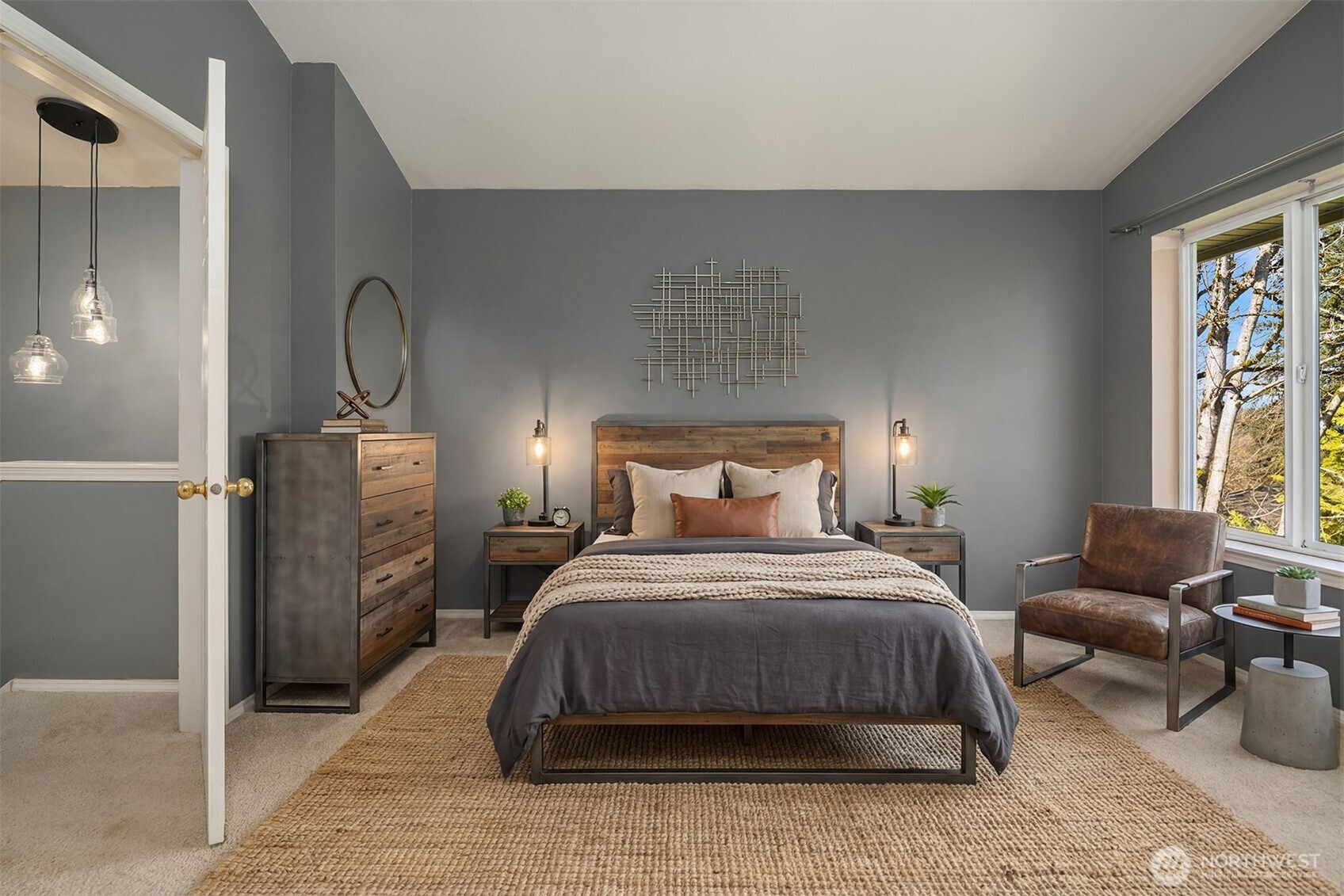 Tucked away townhome in sought-after Woodinview ~ Conveniently nestled between downtown Woodinville & downtown Bothell with rapid access to 405, this spacious 1,348sf two-story features 2 bedrooms, 2.5 baths, den/office & private garage with driveway parking. Spacious open floor plan backed to scenic evergreens with 9' tall ceilings, dramatic oversized windows & designer upgrades throughout. Covered porch opens to tiled foyer with walk-in entry closet. Updated kitchen with granite counters, full-height glass tile backsplash, large pantry & sprawling breakfast bar opens to formal dining, entertainment-sized balcony & grand living room with gas fireplace & cascading open staircase. Desirable double-door den & powder room on main make an ideal home office hideaway. Lofted upper hall with eclectic chandelier & well positioned laundry. Impressive double-door primary suite with cathedral ceilings, territorial views, walk-in closet with custom organizers & lavishly appointed 5-piece bath with corner soaking tub, frameless glass shower, 7' dual-sink maple vanity & extensive tiling throughout. Secondary suite with folding Murphy bed & attached bath with tiled surround & new LVP floors. Efficient gas furnace with heat pump & central A/C!