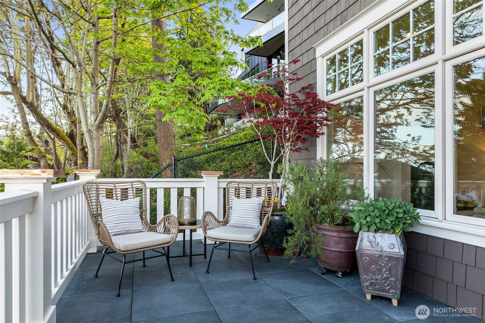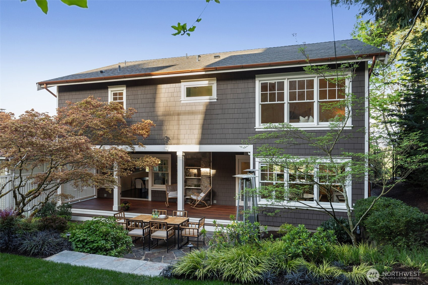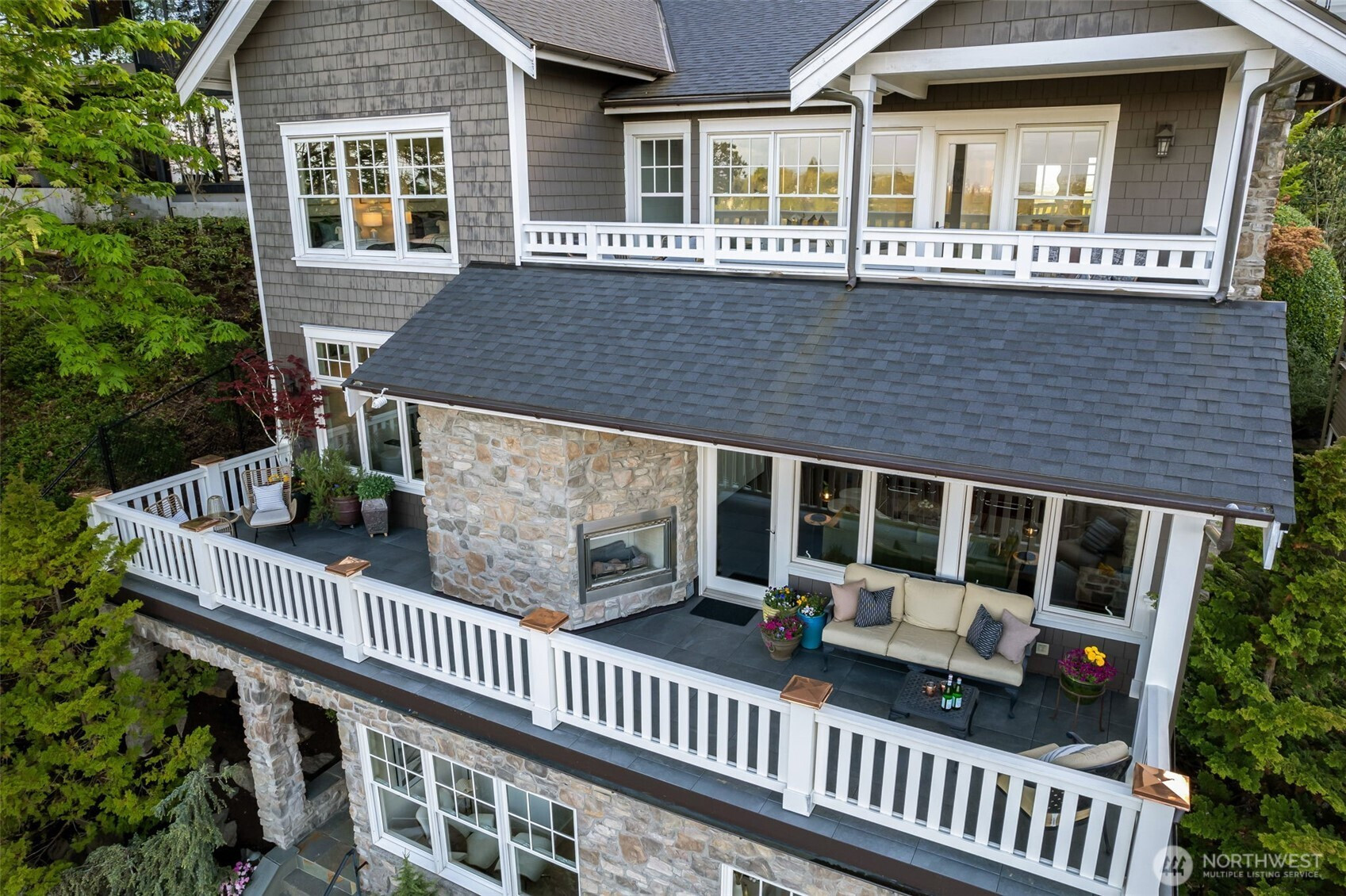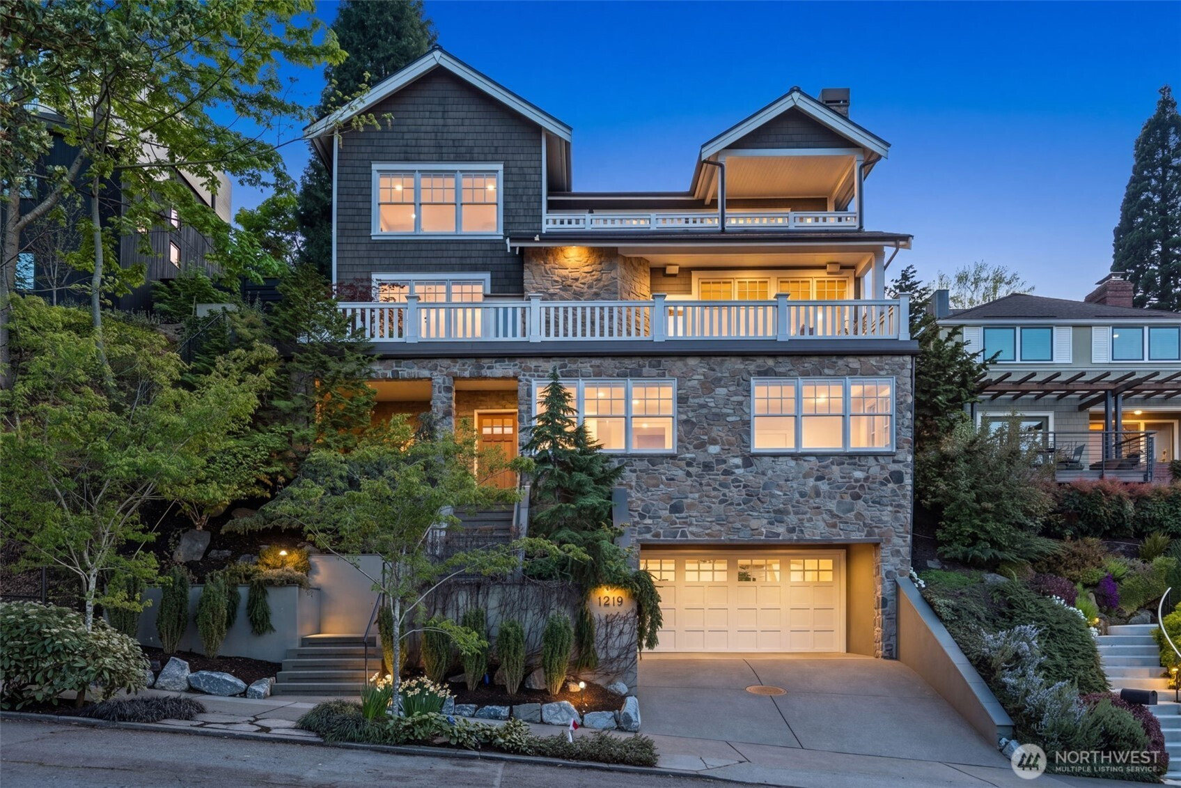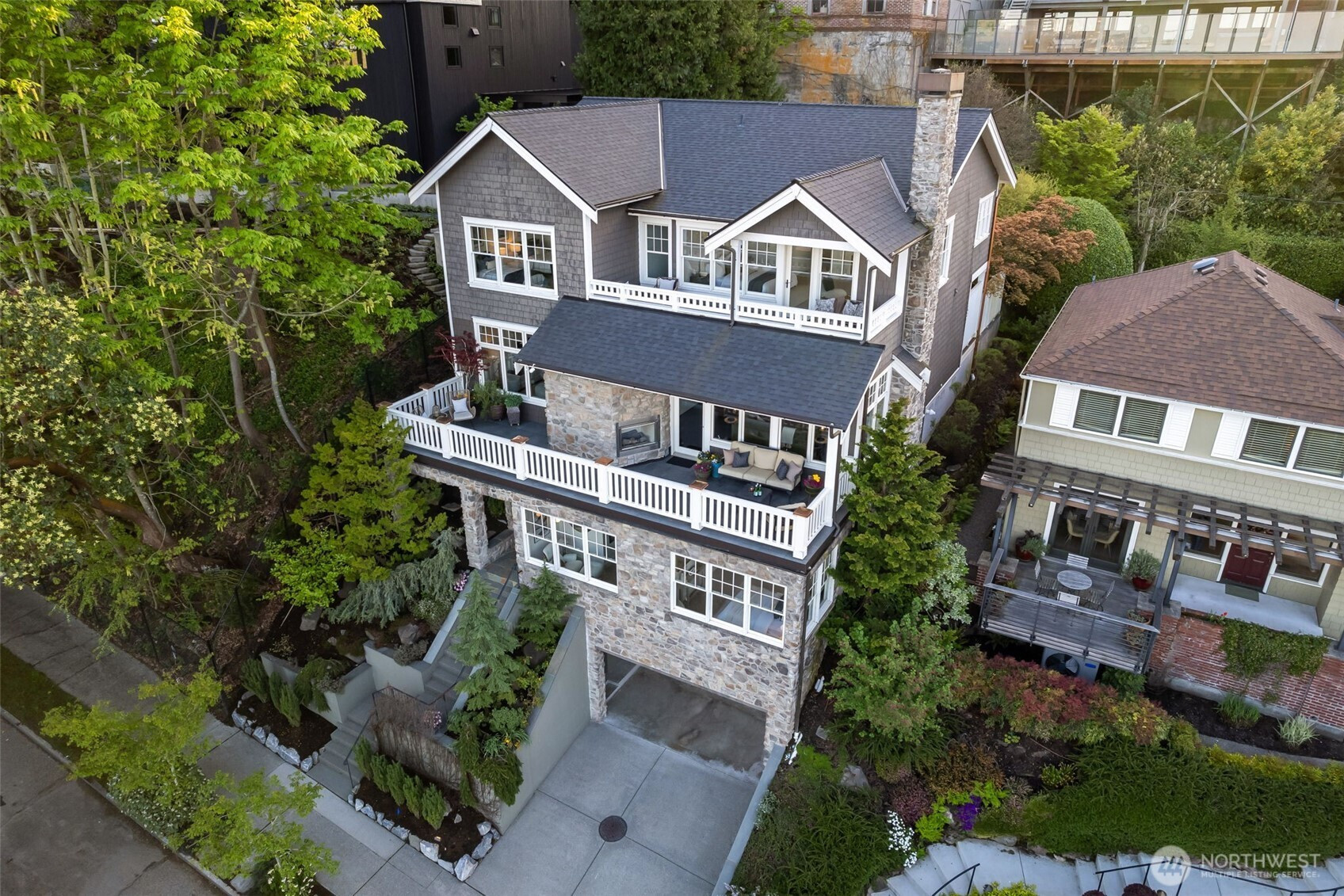 Anchored high above the street in North Capitol Hill, this Northwest Contemporary home strikes the perfect balance between premium luxury and casual approachability. Built in 2003, it’s been designed to capitalize on incredible 180° views of the Cascades from every level. Skip the stairs when you arrive—an elevator whisks you from the roomy 2-car garage straight to the main floor. This level is the heart of the home, with a fabulous circular layout. A true chef’s kitchen and formal dining in the rear of the house open to a private, park-like backyard. Back inside, the living spaces drop down in front like a theater, preserving the view from the kitchen and creating more intimate everyday moments in a house made to entertain. The showstopper? A massive terrace spans the front of the house, complete with a gas fireplace for chilly nights with friends. Outstanding functionality continues in the private quarters, with separate guest accommodations downstairs joining a large media room and office. Upstairs are three large secondary bedrooms served by a full bath with a walk-in shower (no bathtub) and laundry. The massive primary suite leaves nothing to be desired, featuring best-in-house views of the sunrise from bed or the private deck. This house does it all!
