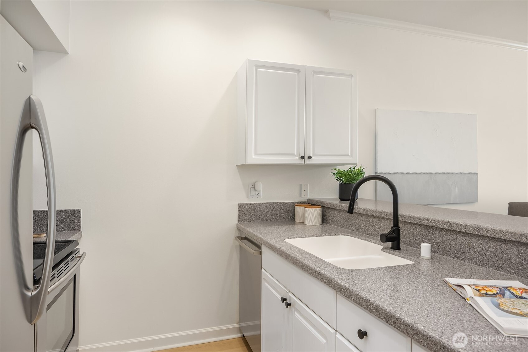 Urban comfort meets city living in the heart of downtown Kirkland. Just steps from restaurants, boutique shops, and the waterfront, this beautifully appointed 1-bedroom condo puts you at the center of it all. Enjoy a fully equipped kitchen, natural light through bay windows, a king-sized bedroom with en suite bathroom, and in-unit washer/dryer. Includes private storage, secured garage parking, and keyed elevator access. With a Walk Score of 94, everything you need is nearby. This home offers the perfect balance—immerse yourself in the energy of the city, then retreat to your own private sanctuary. Easy access to I-405 and SR-520.