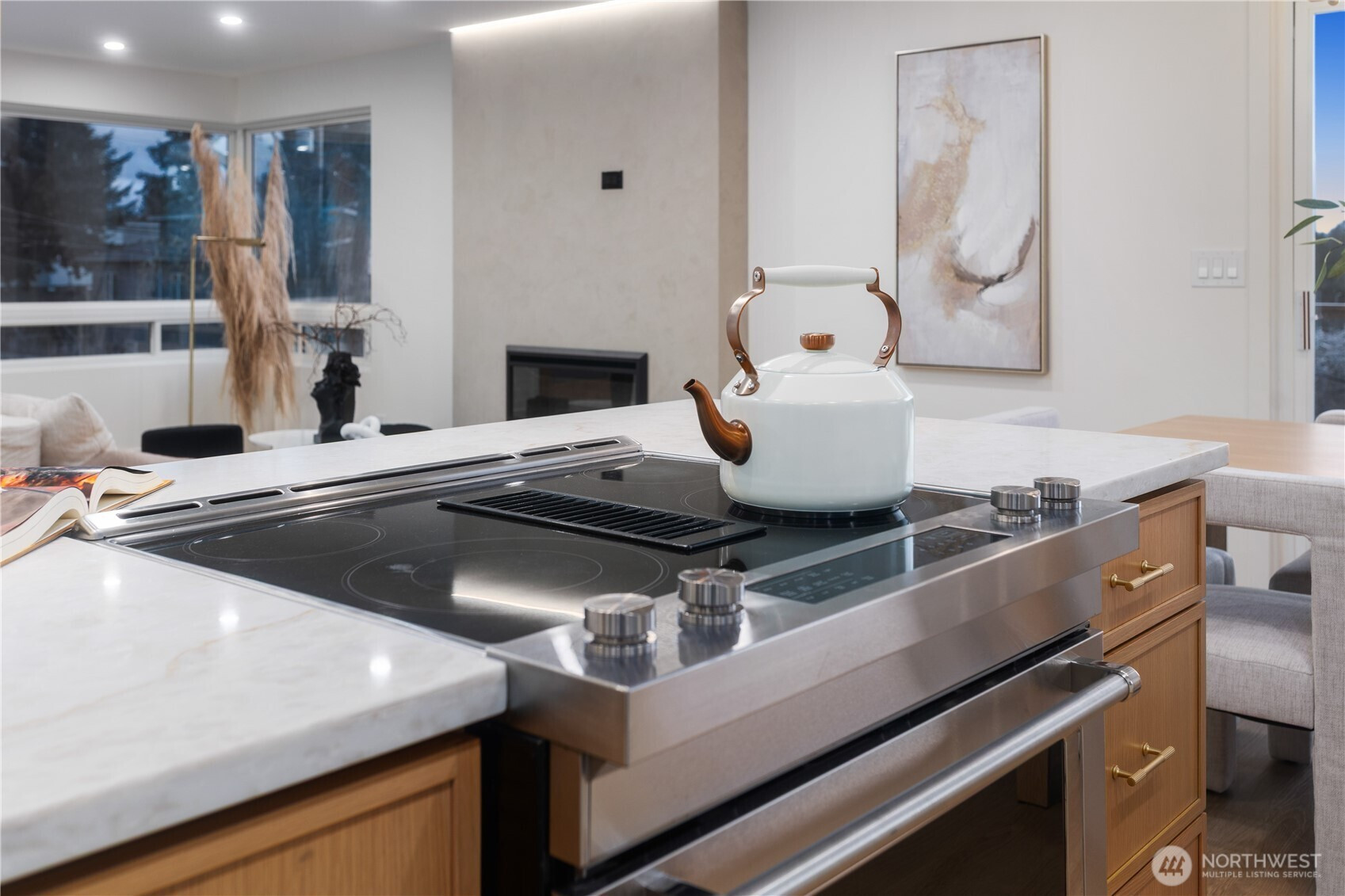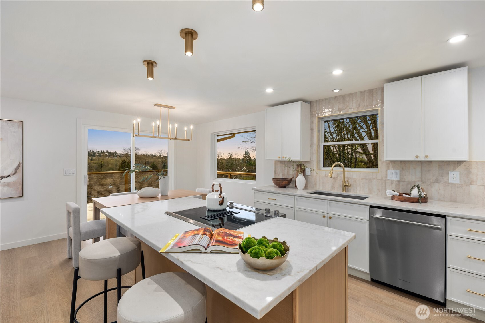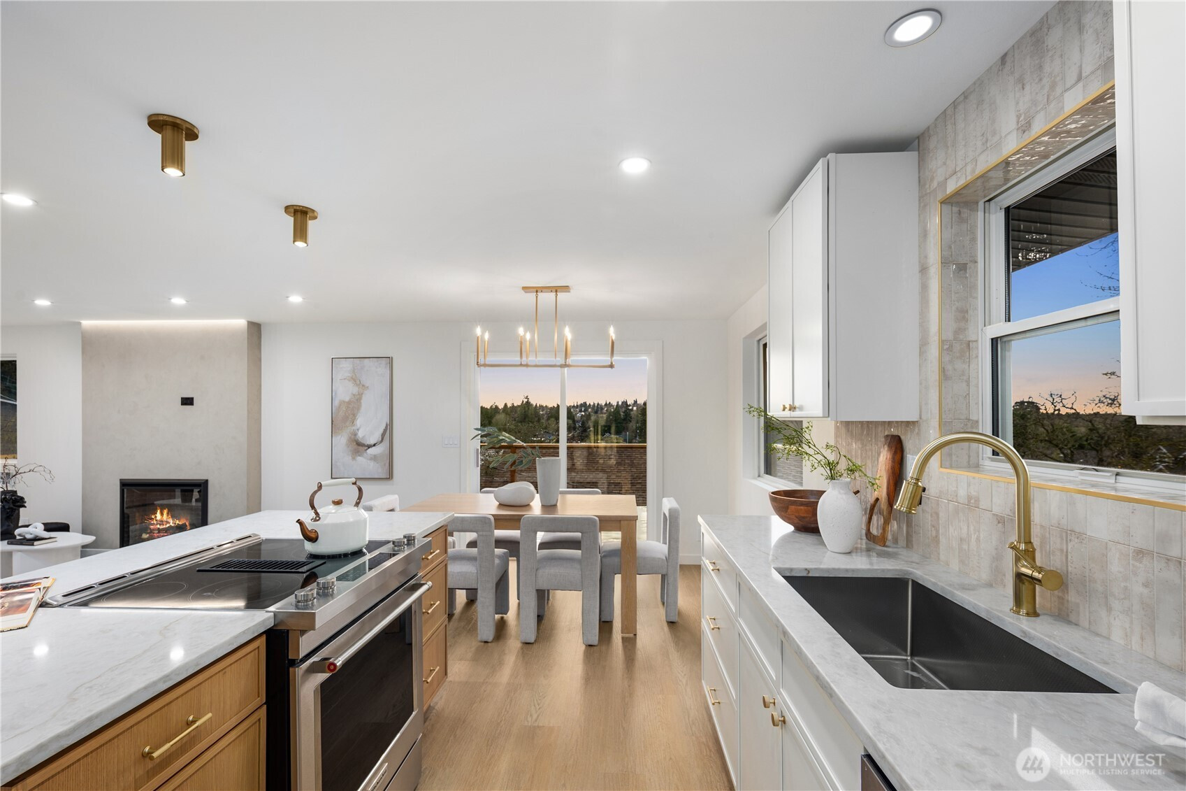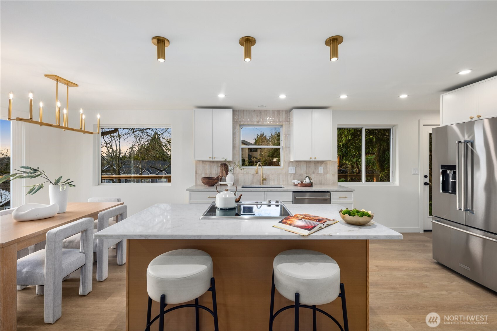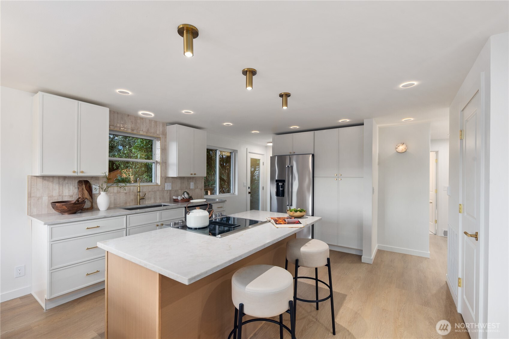 Absolutely must-see West Seattle masterpiece—an extraordinary 4-bedroom,3-bath residence defined by bespoke finishes, meticulous craftsmanship,&sophisticated design throughout.The main level impresses with a handcrafted tadelakt plaster fireplace,paired with a sleek electric insert and ambient lighting,creating a dramatic yet inviting focal point.The open-concept kitchen is a true showpiece, featuring a premium downdraft range,custom designer island,Taj Mahal quartzite countertops, high-end stainless appliances, & a striking statement backsplash.The dining area opens to an expansive deck, ideal for elevated entertaining, alfresco dining, or private outdoor relaxation.The primary suite is a refined retreat,boasting a designer accent wall, curated lighting, and a fully customized walk-in closet.Its spa-inspired ensuite includes dual vanities,curbless walk-in shower, anda luxury smart bidet toilet.The lower level features two additional bedrooms,a tadelakt-finished bath,private mirrored fitness studio,&oversized laundry with cabinetry,sink,and folding space.A separate-entry family room with kitchenette, beverage cooler, and designer fireplace offers versatility for guests or multi-generational living.Complete with A/C,dramatic soffit lighting, premium metal roof, oversized parking with RV/boat space,covered carport,and beautifully manicured grounds. Ideally located near parks, Alki Beach, and downtown Seattle. Opportunities like this in West Seattle are rare-and they dont last.