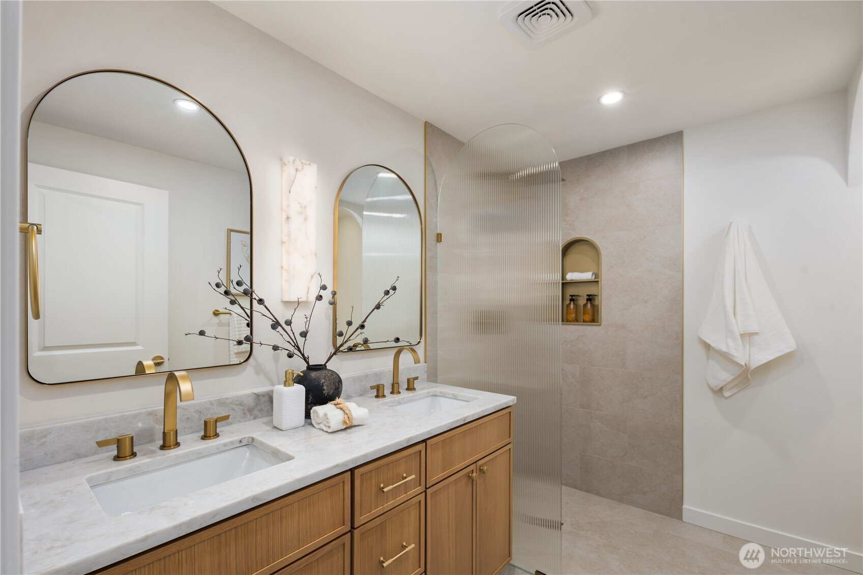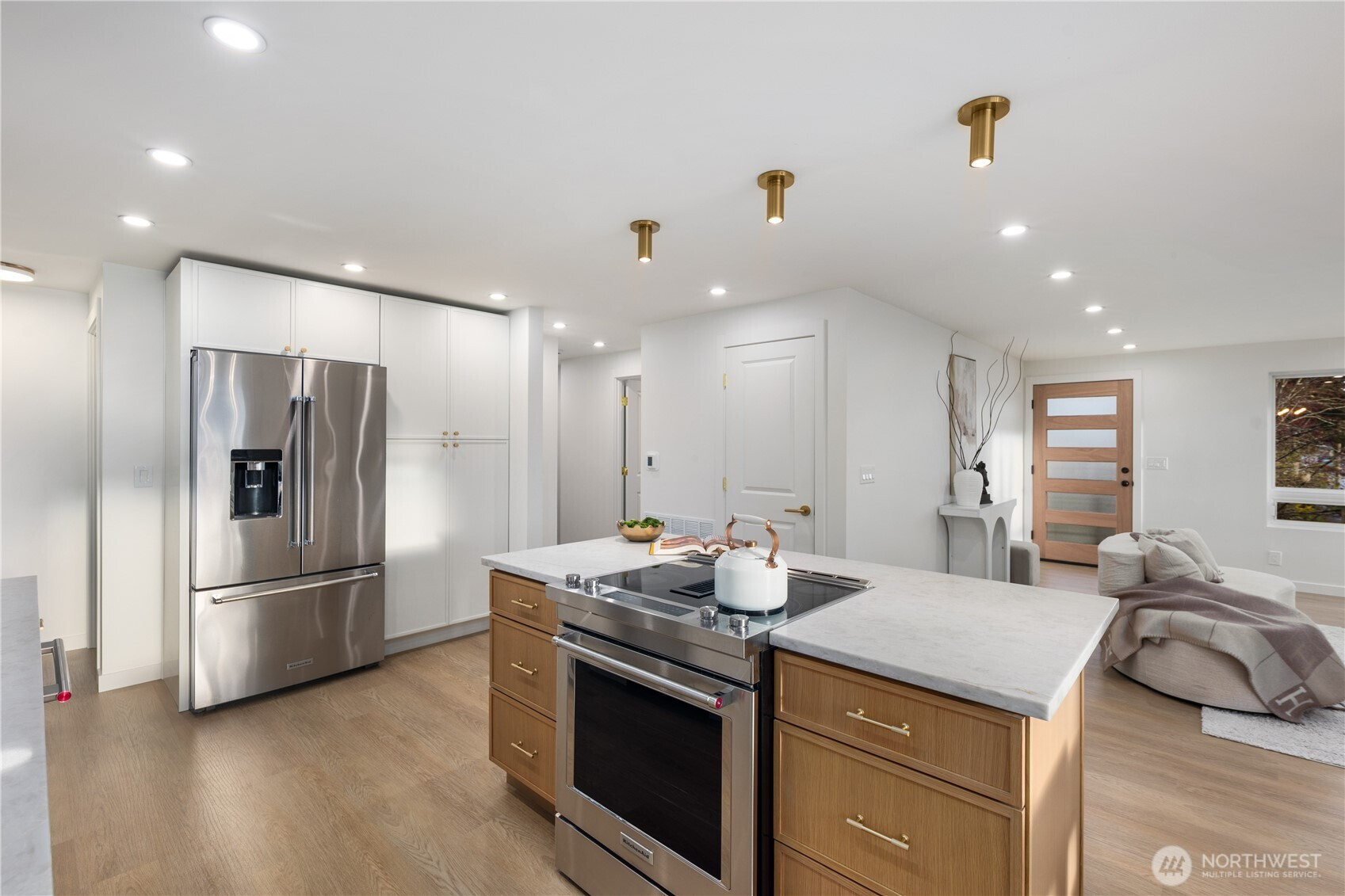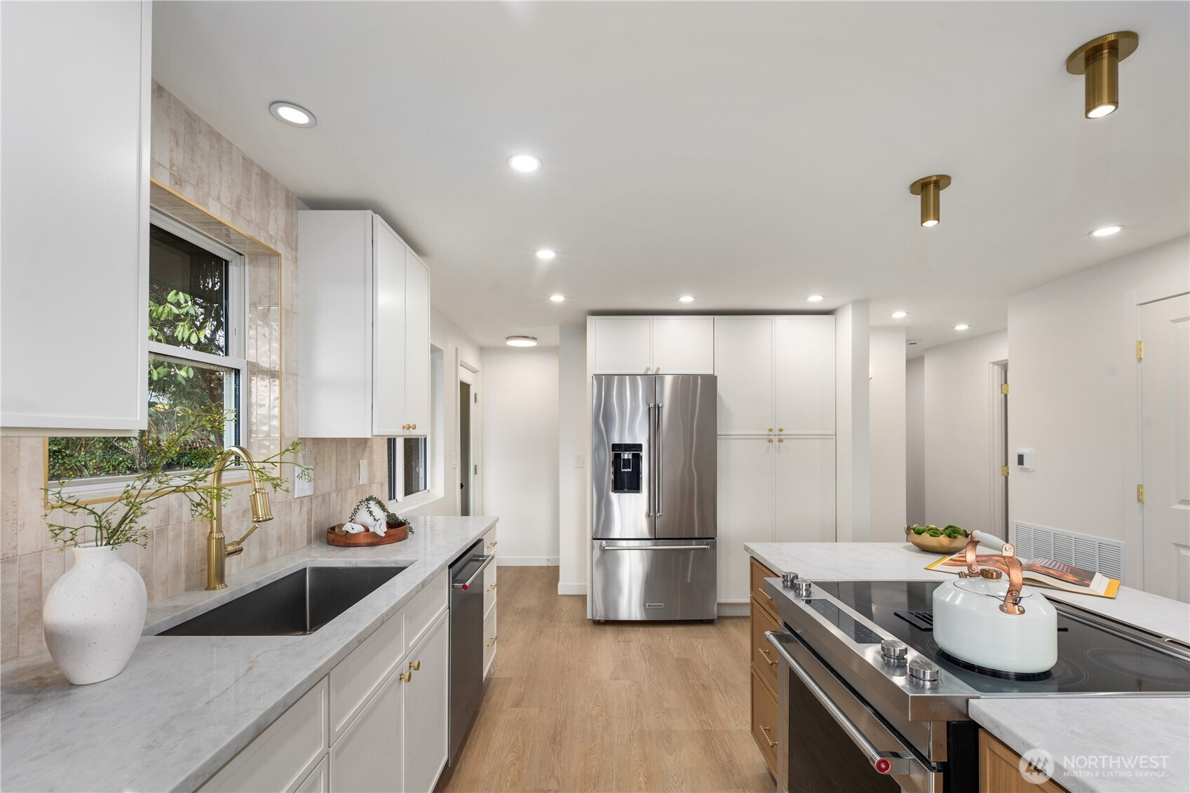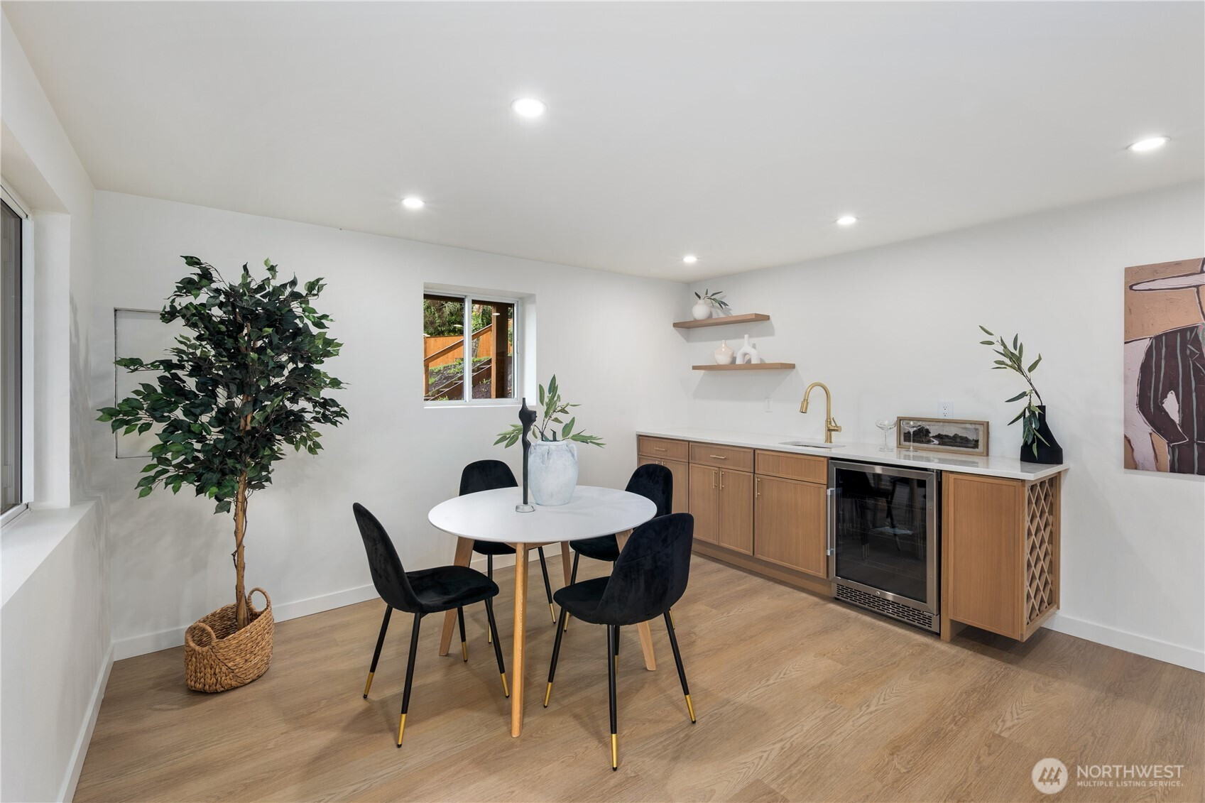 Absolutely must-see West Seattle masterpiece—an extraordinary 4-bedroom,3-bath residence defined by bespoke finishes, meticulous craftsmanship,&sophisticated design throughout.The main level impresses with a handcrafted tadelakt plaster fireplace,paired with a sleek electric insert and ambient lighting,creating a dramatic yet inviting focal point.The open-concept kitchen is a true showpiece, featuring a premium downdraft range,custom designer island,Taj Mahal quartzite countertops, high-end stainless appliances, & a striking statement backsplash.The dining area opens to an expansive deck, ideal for elevated entertaining, alfresco dining, or private outdoor relaxation.The primary suite is a refined retreat,boasting a designer accent wall, curated lighting, and a fully customized walk-in closet.Its spa-inspired ensuite includes dual vanities,curbless walk-in shower, anda luxury smart bidet toilet.The lower level features two additional bedrooms,a tadelakt-finished bath,private mirrored fitness studio,&oversized laundry with cabinetry,sink,and folding space.A separate-entry family room with kitchenette, beverage cooler, and designer fireplace offers versatility for guests or multi-generational living.Complete with A/C,dramatic soffit lighting, premium metal roof, oversized parking with RV/boat space,covered carport,and beautifully manicured grounds. Ideally located near parks, Alki Beach, and downtown Seattle. Opportunities like this in West Seattle are rare-and they dont last.