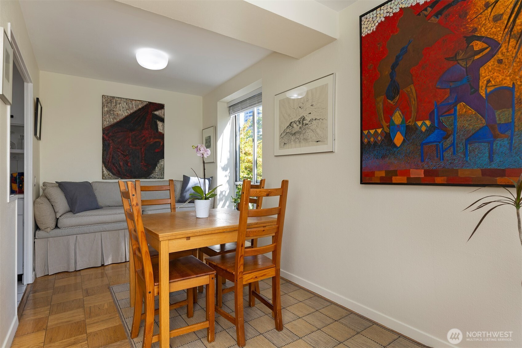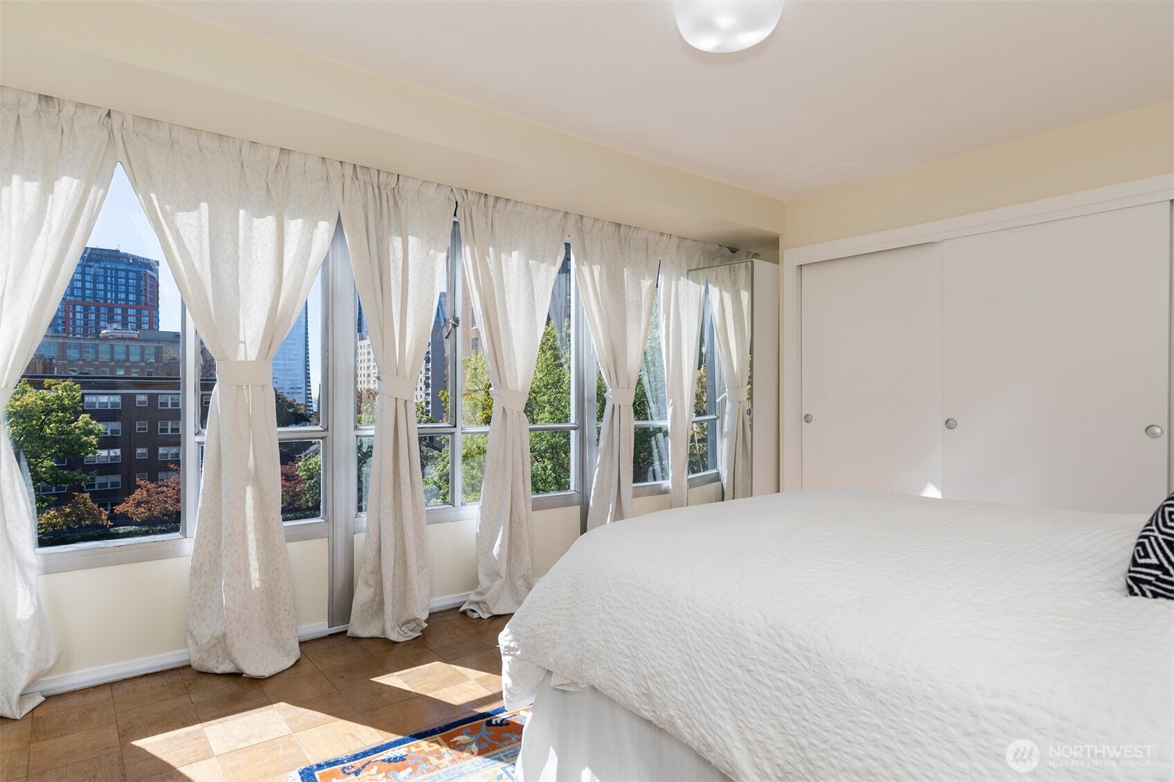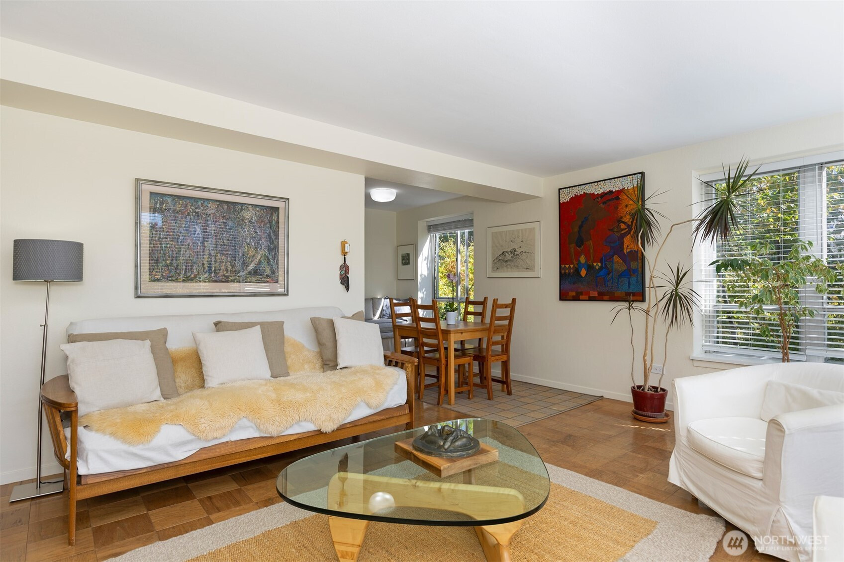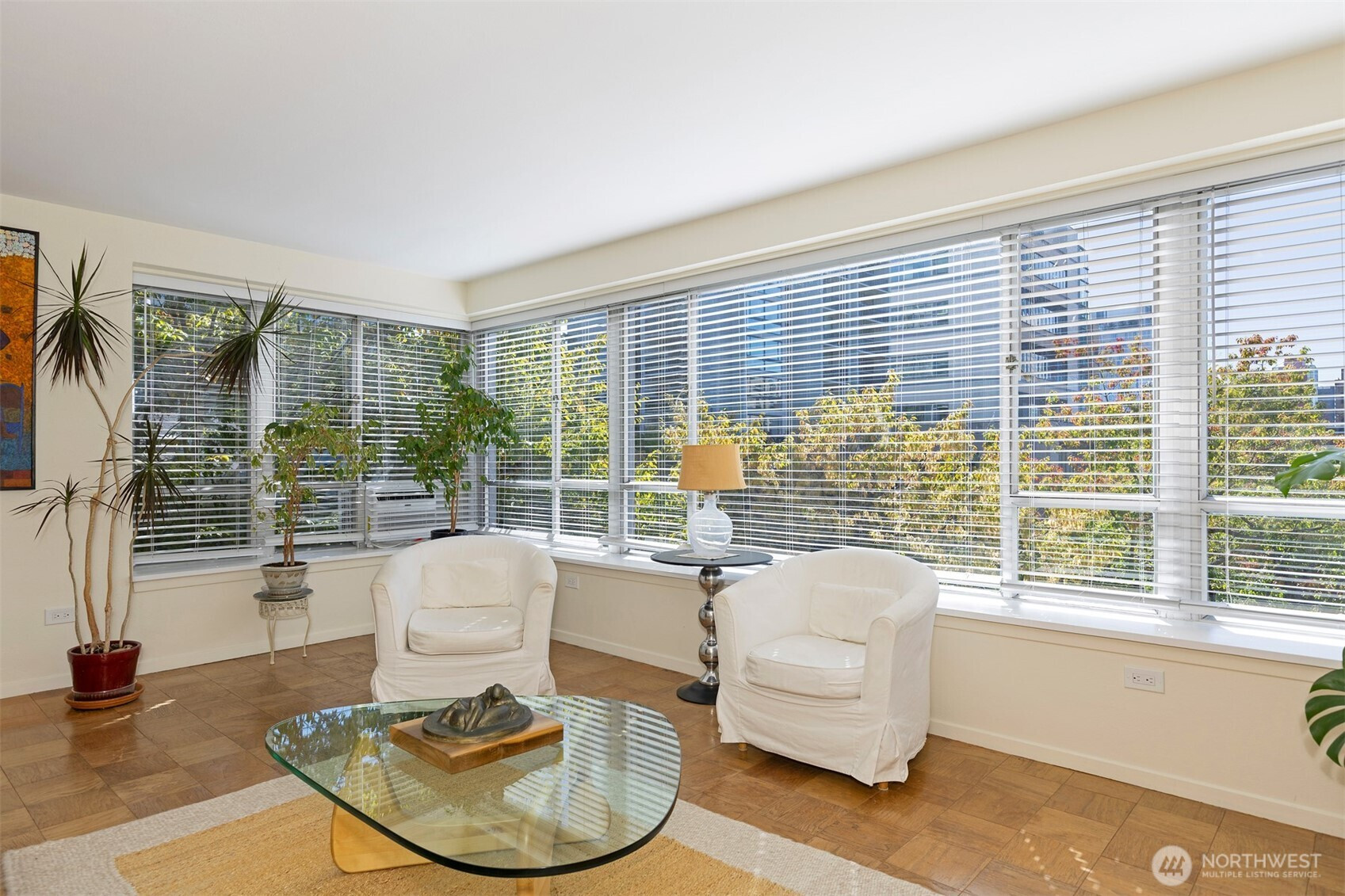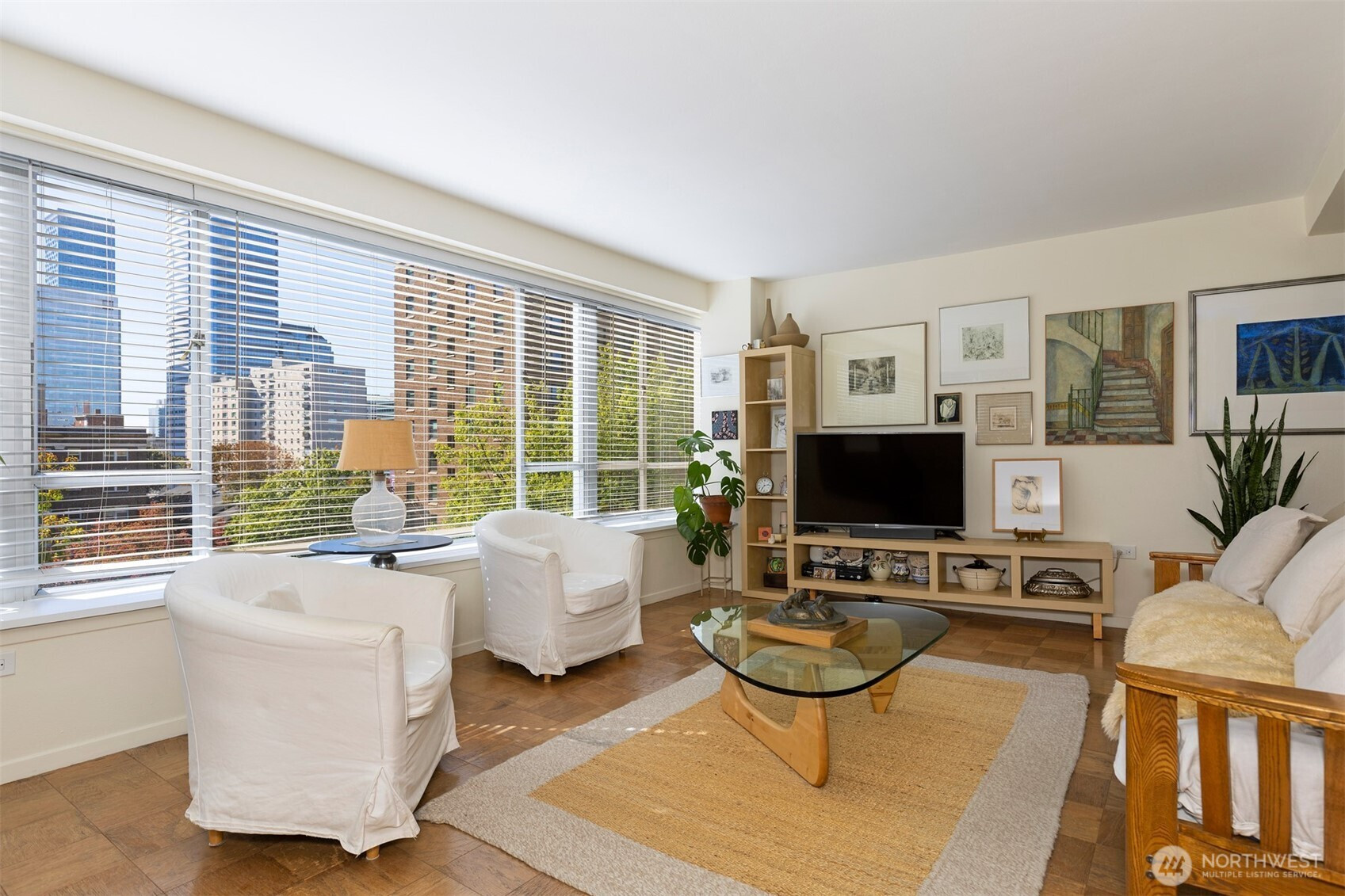 Discover the perfect balance of city living and neighborhood serenity at Sutton Place—a striking mid-century concrete and steel building nestled in one of Seattle’s rare residential zones on First Hill. Live privately amongst historic mansions and leafy parks while enjoying sweeping downtown Seattle views through expansive west-facing windows. A coveted SW end unit allows for golden natural light enhancing the airy, open layout. Enjoy a modern aesthetic throughout with classic parquet floors and a spacious living room perfect for entertaining or unwinding in style. Two spacious bedrooms, incl primary w/full bath, offer sublime elegance. Extra storage, deeded garage parking, EV charger, car wash station, heated outdoor pool, common laundry.