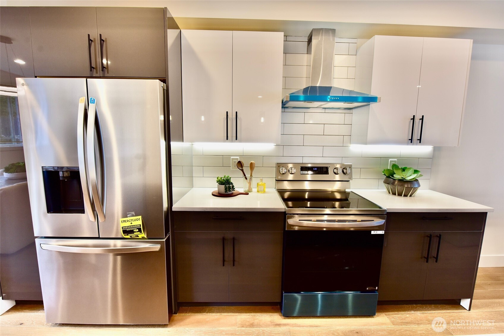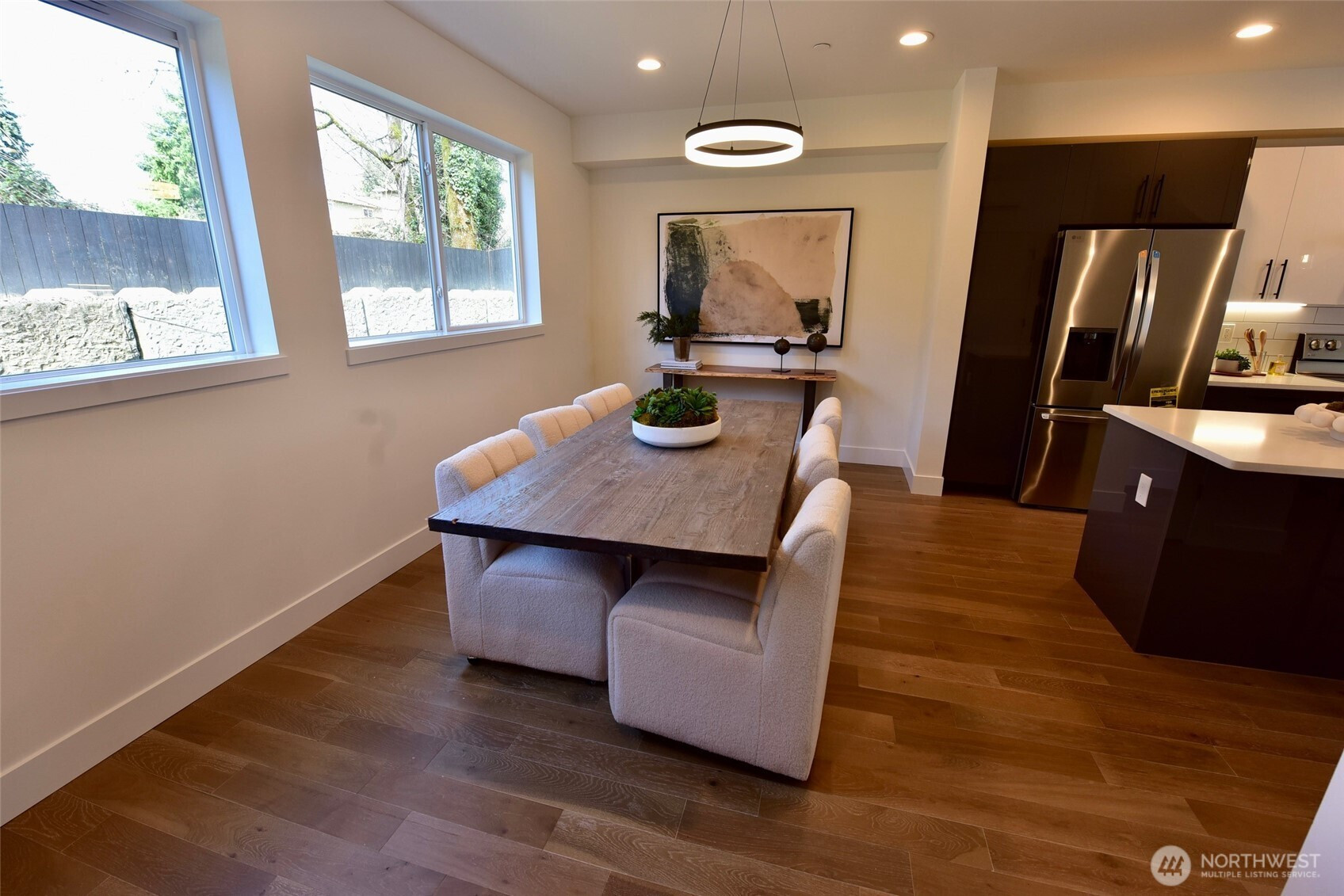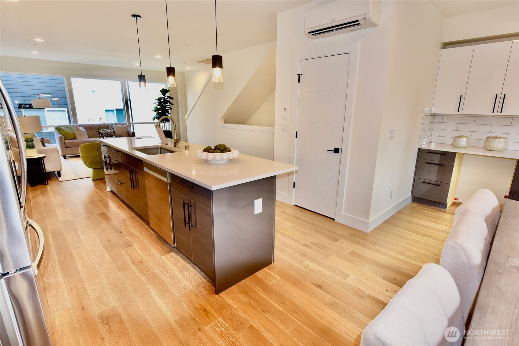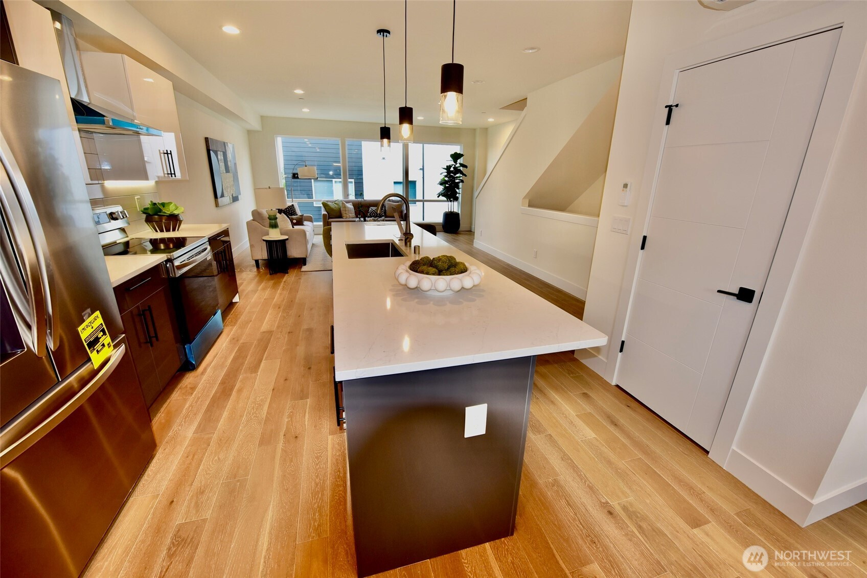 Welcome to Villa Townhomes, a new 9-home community offering thoughtfully designed 4-bedroom, 3.5-bath residences. The entry level includes a bedroom with a full bath and a finished 2-car garage with an EV outlet. The main level features open-concept living, dining, and kitchen areas with large windows and a half bath. The designer kitchen showcases stainless steel LG appliances, including a ThinQ gas range, quartz countertops, and subway-tile backsplash. The upper level offers a primary suite with a walk-in closet and ensuite bath, two additional bedrooms, a full bath, linen storage, and laundry. Builder features include high ceilings, radiant floor heating, ductless mini-split heating and cooling in every room, a tankless water heater, and lighted bathroom mirrors. Convenient access to shopping, amenities, major freeways, and approximately 8–10 minutes to Sea-Tac Airport.